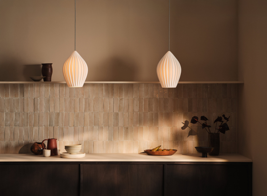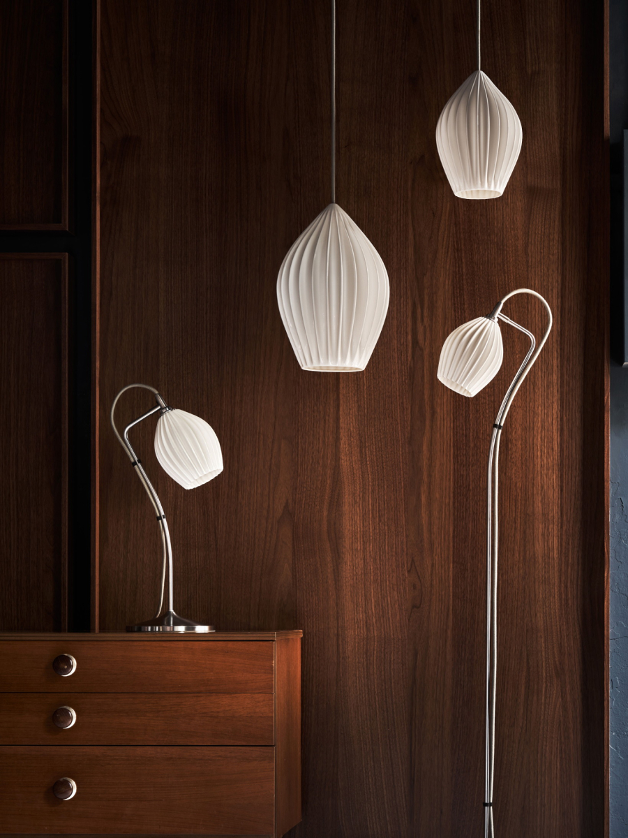 Ideal for softening the strict lines of kitchen cabinets or office spaces, the Fin’s delicate, organic lines create mesmerising shadow play. Available as a single or grouped pendant, table, wall and floor light, all finished with a smart grey cotton braided cable.