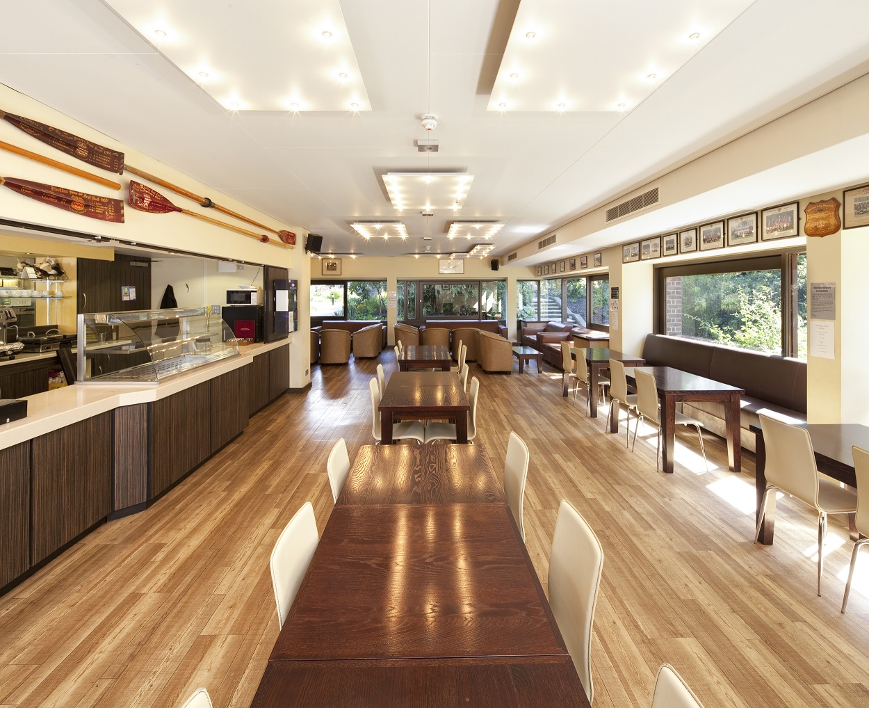 The existing split level bar was very dark, with exposed services running under the ceiling, partly covered by a timber grid. Our main challenge was to join these spaces into one open light, welcoming, female friendly space in keeping with the College, but moving away from the central building’s very dark red cedar cladding, which could be used throughout the day.
