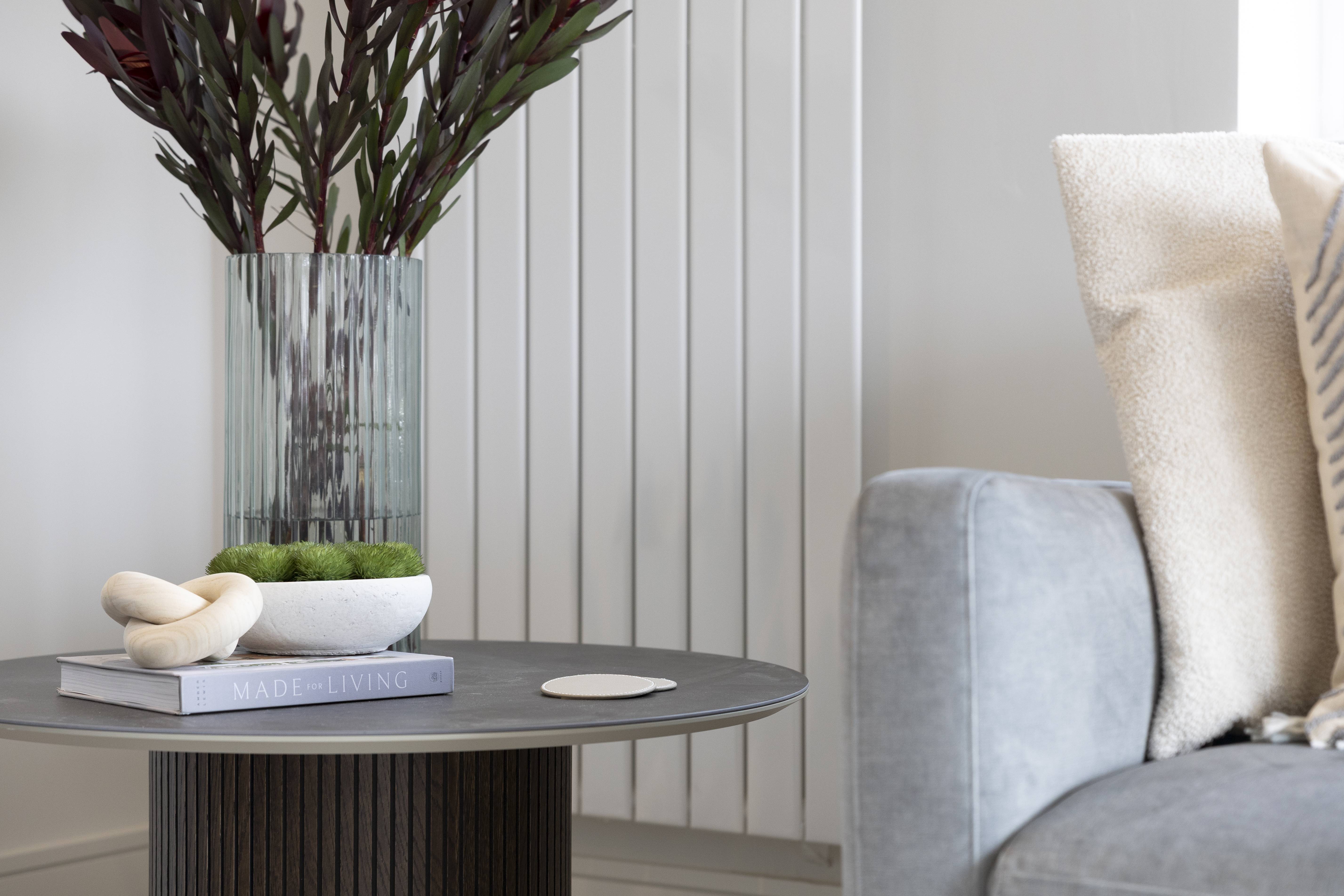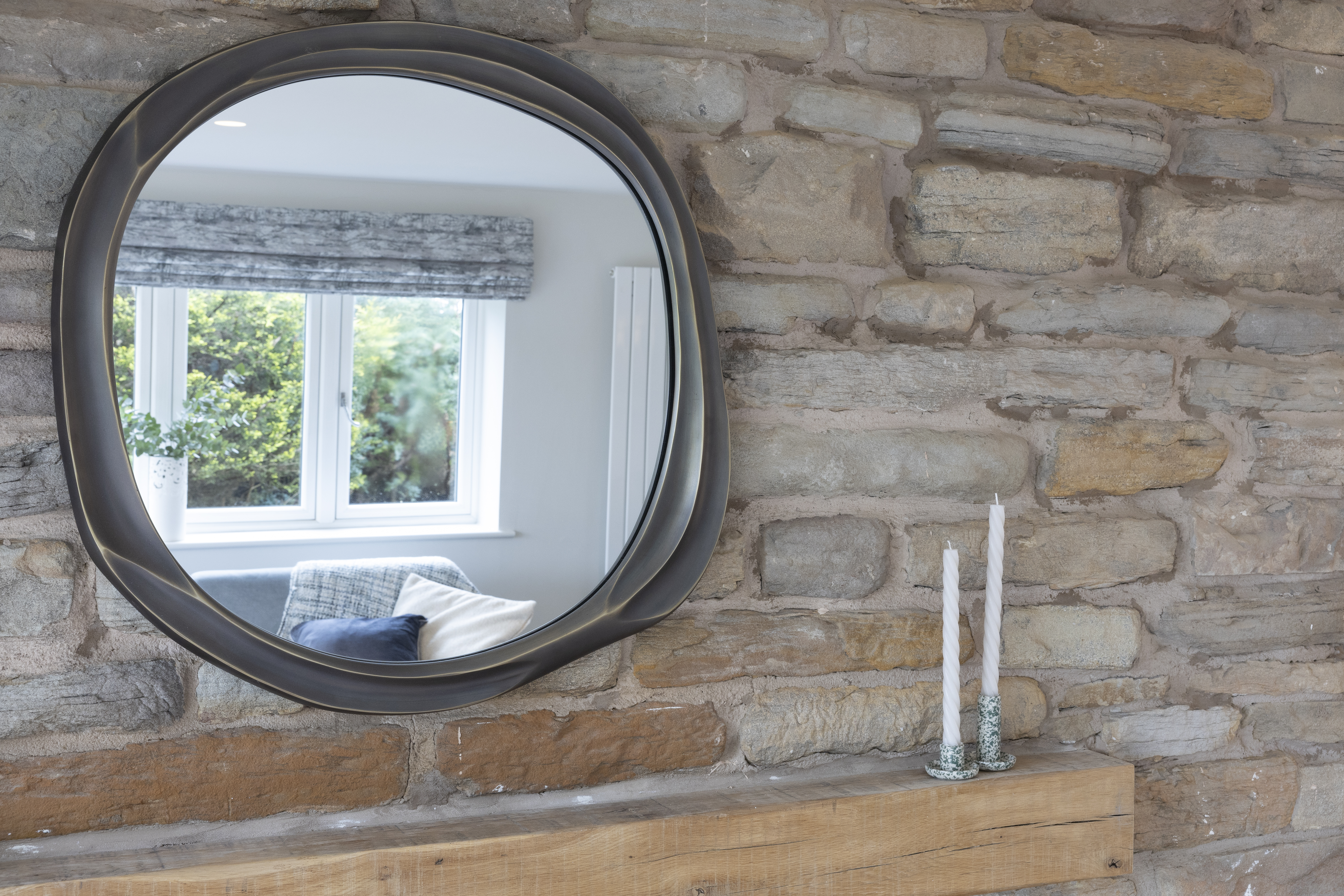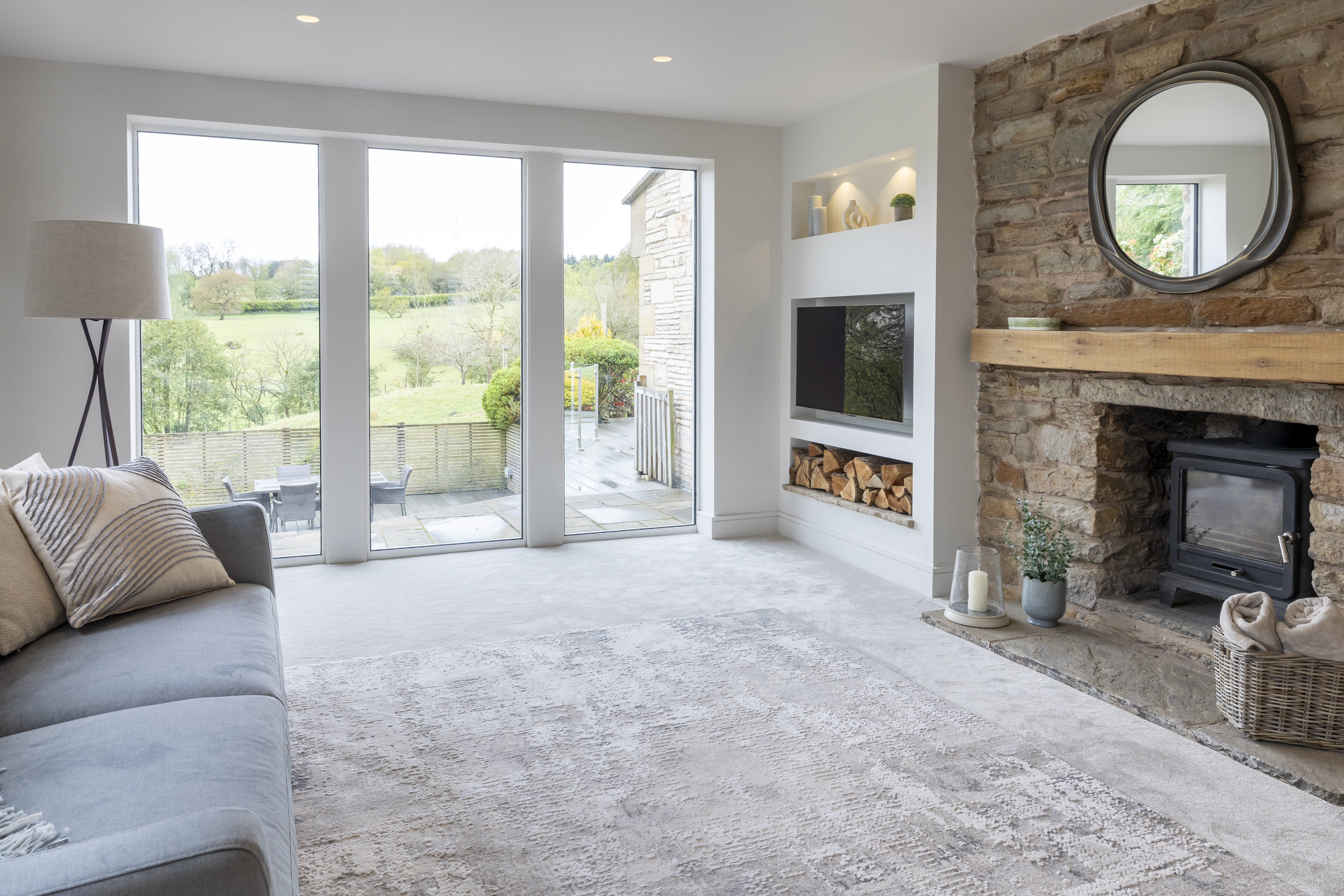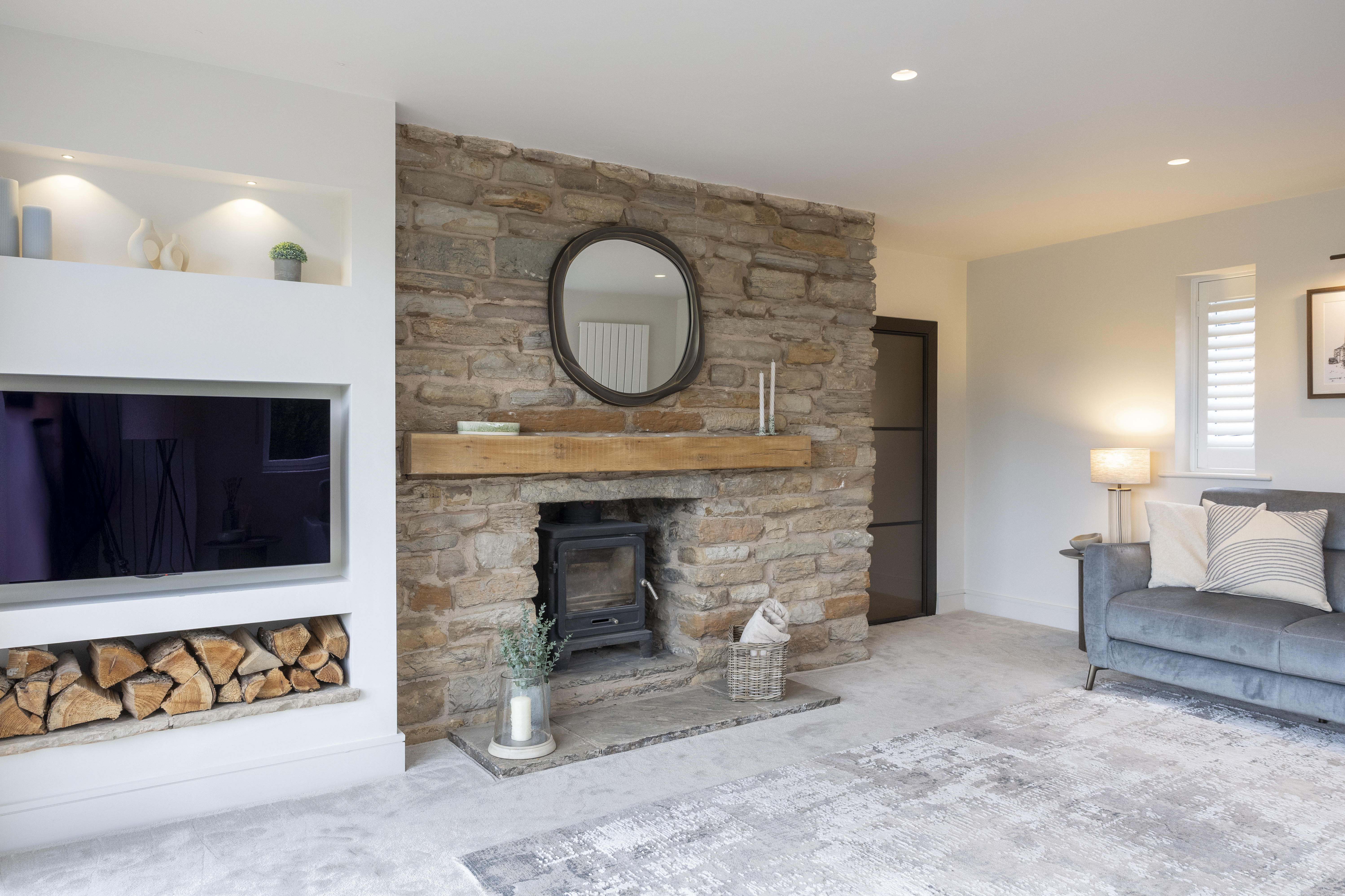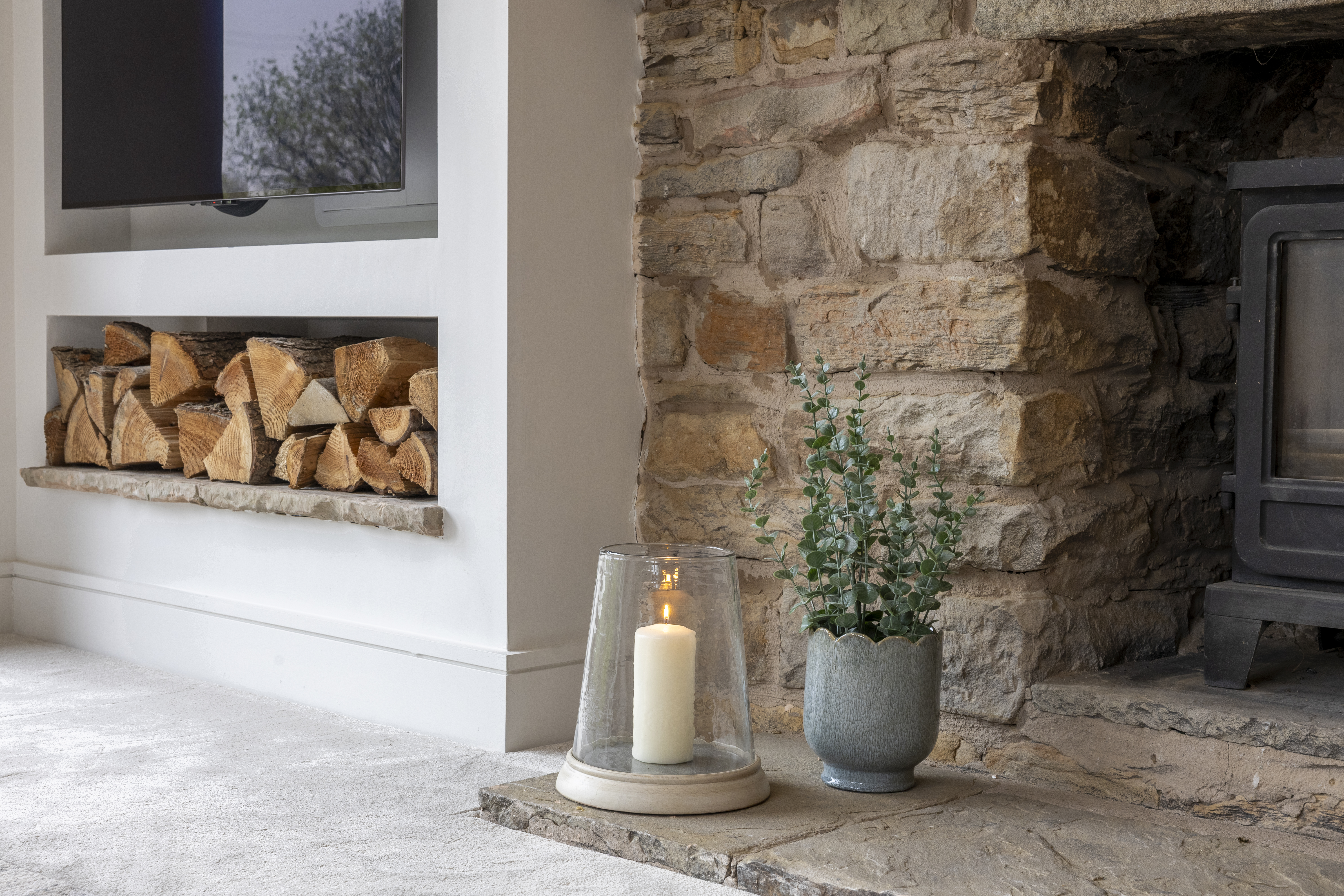 This formal sitting room was previously a dark and uninviting space. The fireplace dominated the room, the west facing window was small and there was no natural focal point in the room. We opened up the west elevation with three large full length windows which were separated by stone mullions to maintain a harmony with the existing style of the building. This allowed for not only a huge amount of natural light, but also maximised the views over the garden and surrounding countryside. We recycled an old oak beam from the kitchen and re-purposed it as a mantle over the wood burning stone. The combination of the wood and stone paired with contemporary touches such as the bronze aluminium doors allows for a timeless and warm look.