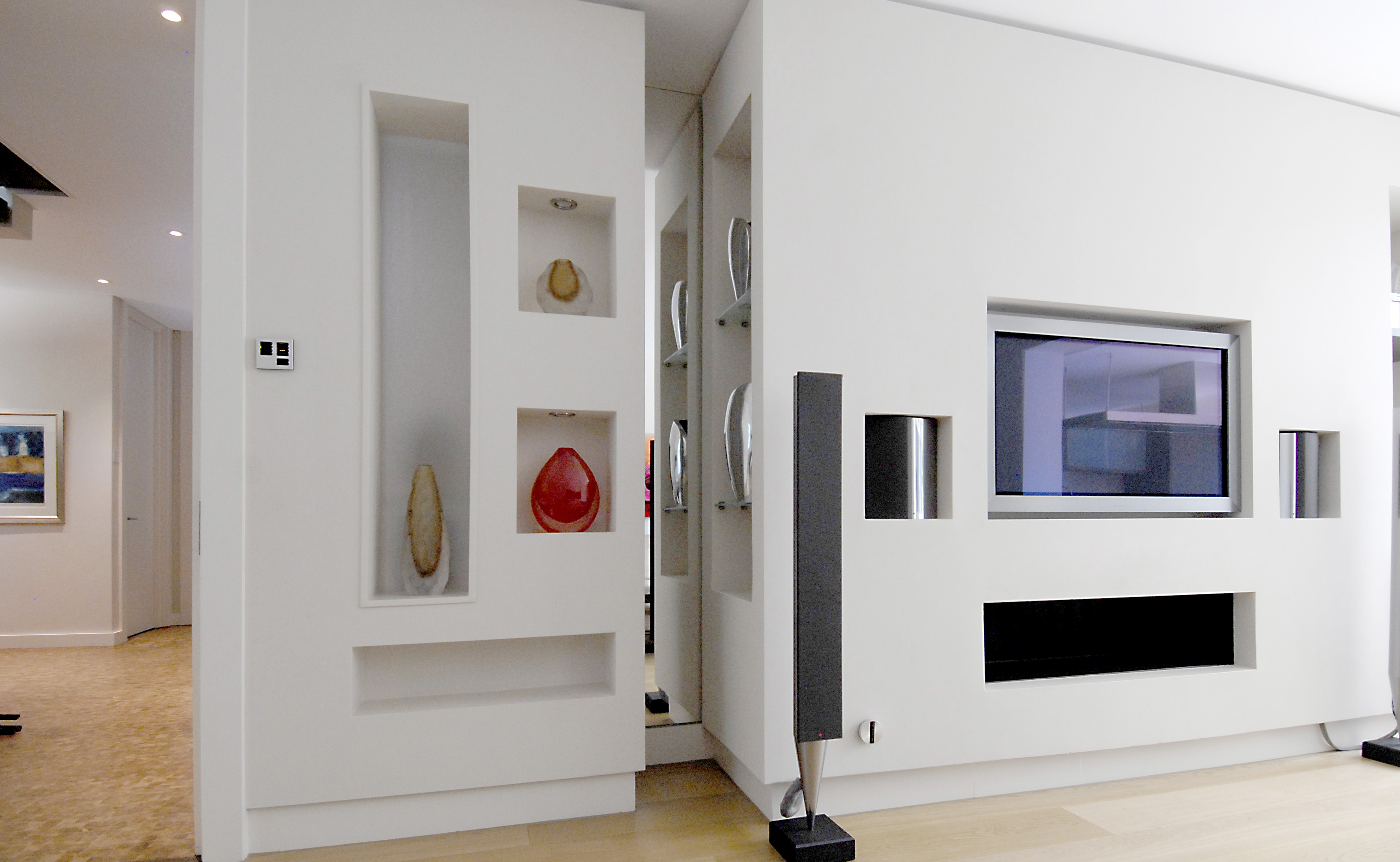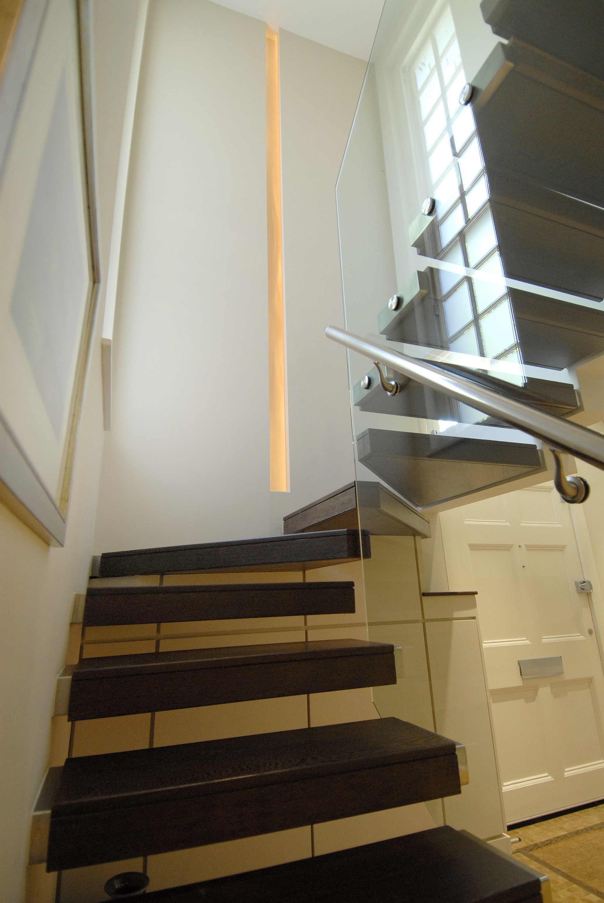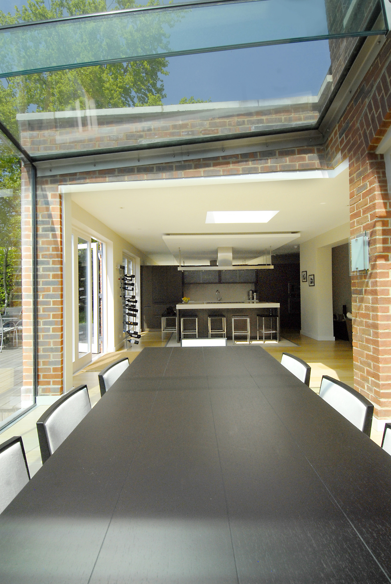 Foxes dale is an Edwardian house within a Private Estate and Conservation area. The project involved the full modernisation and interior design with a contemporary approach adding a structural glass extension to the rear with water featured landscaping connecting to the garden. The entrance has a curved wall with a hidden cloak room behind, a double height gallery and a floating staircase leading up to bedrooms and a new loft space above. The ground floor opens up as a family entertainment space and open plan kitchen connected to the garden and spa.