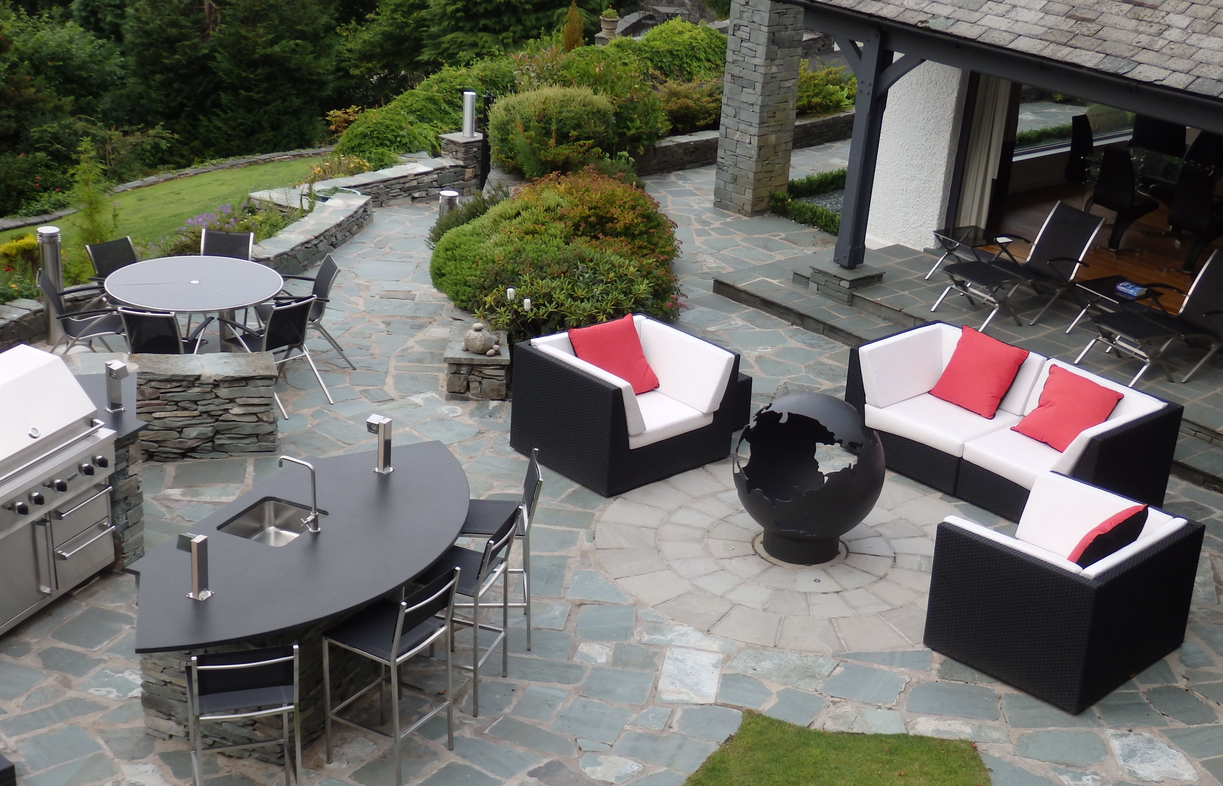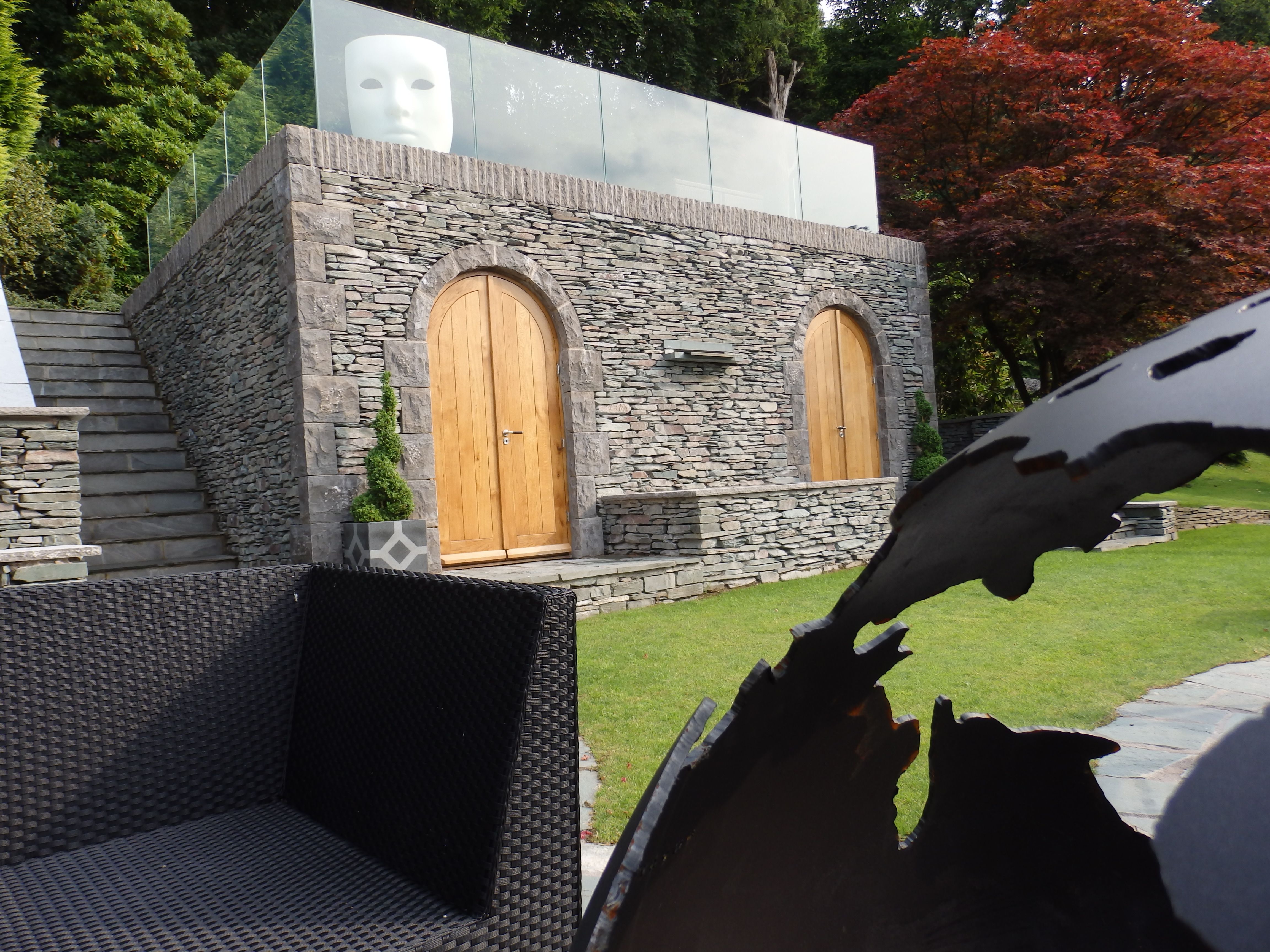 The enclosed photographs are of a recent project where we designed a spa building for a client and then developed a scheme around that including a lounge area with central fire place. We also designed an outside kitchen and a dining area to complete the scheme.