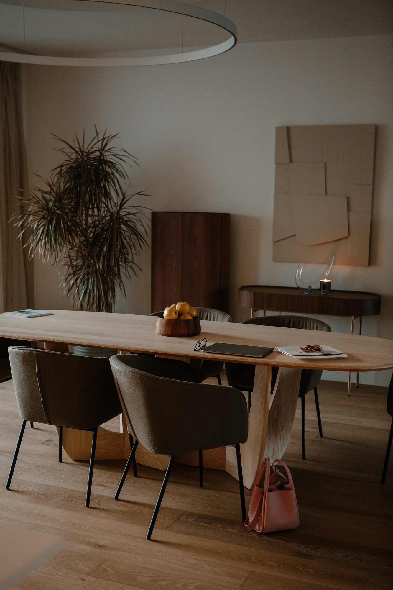 The dining area showcases the power of bespoke design. A stunning dining table, commissioned by Kia Designs, with its clean lines and natural wood grain, perfectly complements the surrounding architecture.