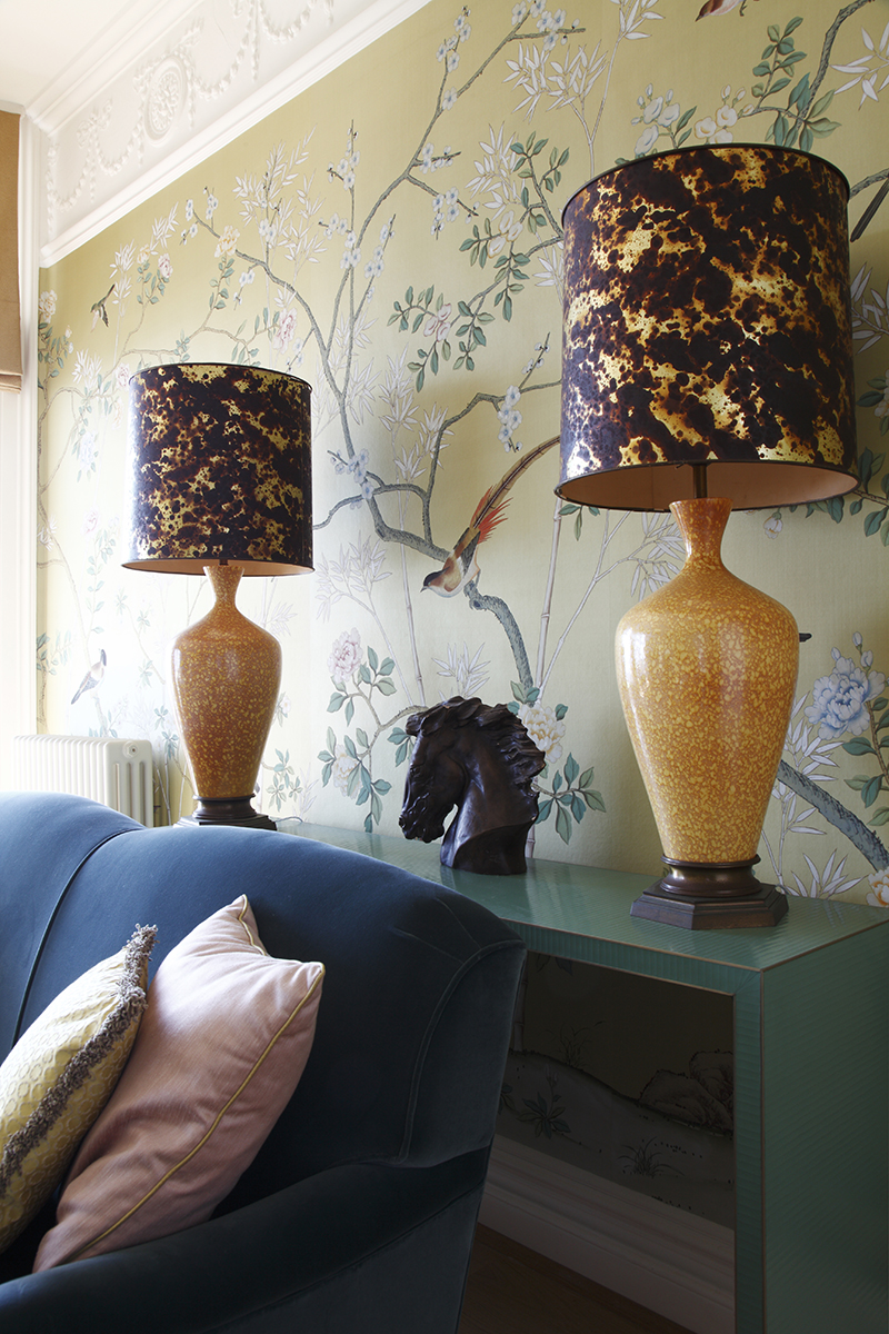 The starting point for the decoration was the bespoke hand-painted silk wallpaper, combined with other luxurious finishes, such as shagreen, lacquer and gilding for the furniture and an eclectic selection of accessories, including 1960s American lamps and a Swedish Rococo cabinet. As with all Sally Dernie projects, it seems as though the room has evolved over time.