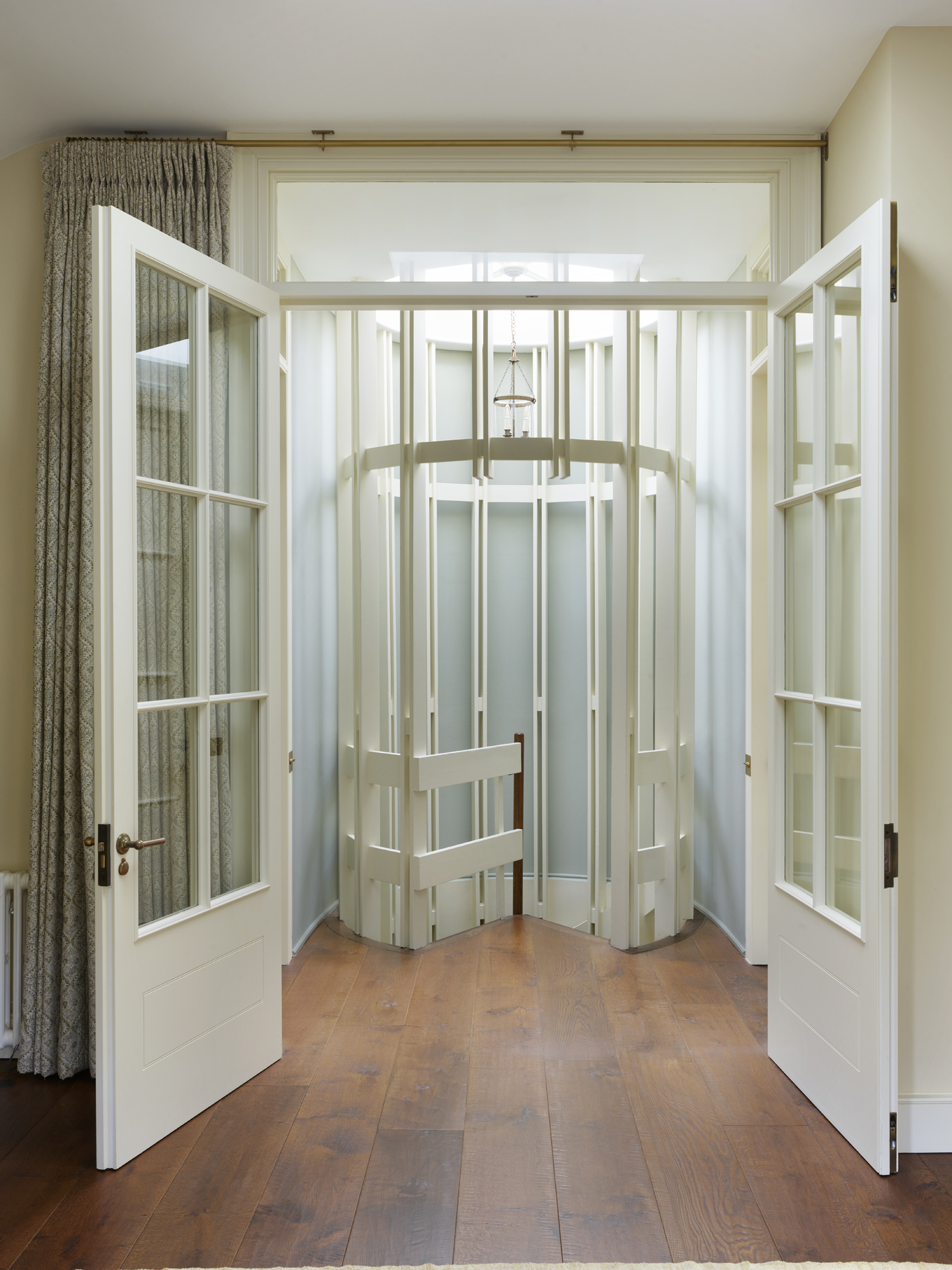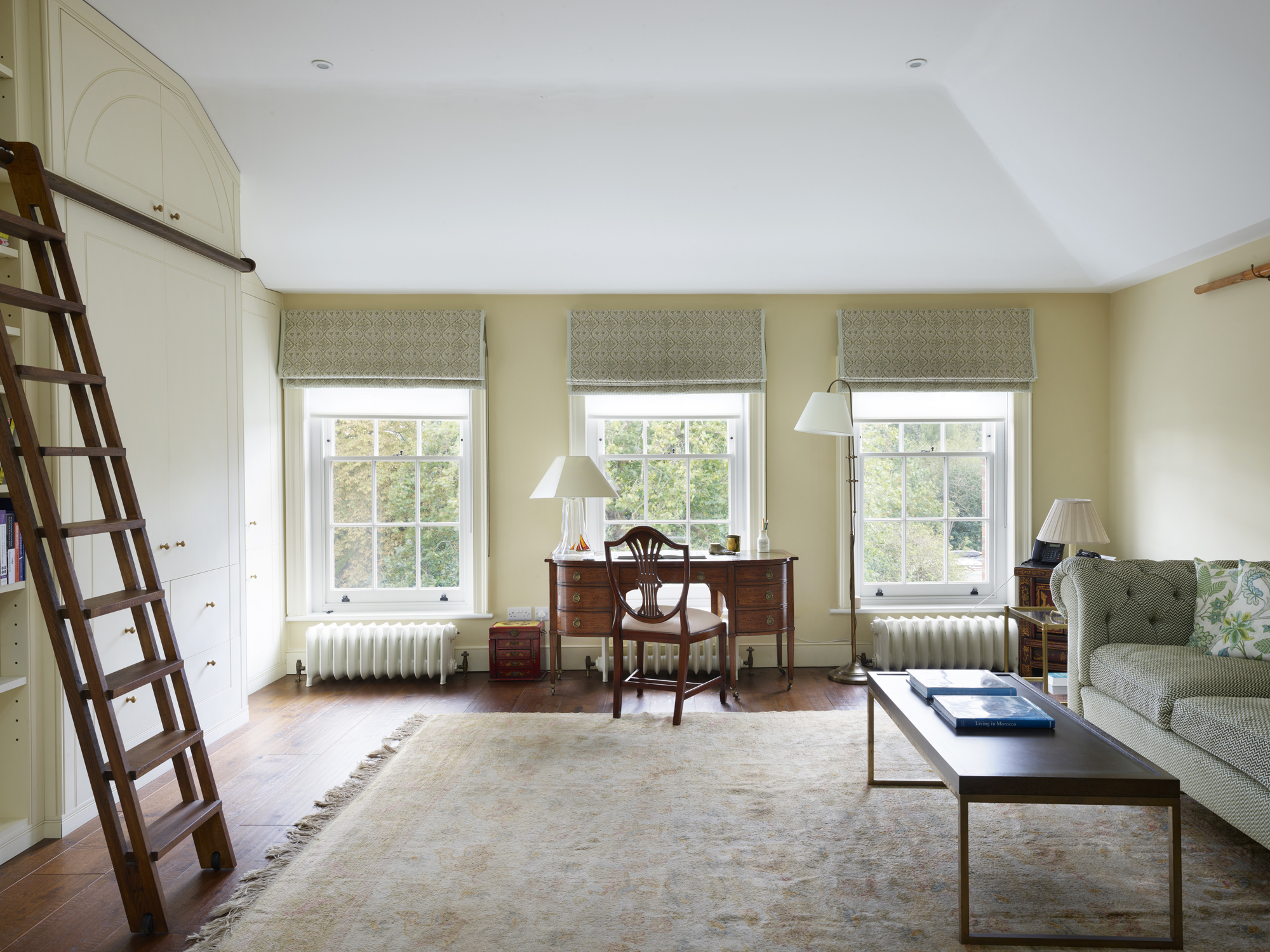 The circular, open staircase is designed to let maximum light through from the central skylight. It transports you to the top of the house and a huge bright study with storage and library ladder designed to be in keeping with the building. The guest bedroom on this level has the most wonderful views over London. We used Tissus D'Helene fabric for the curtains, trims, tie backs and headboard and sourced an antique decorative rug. The effect is a whimsical space which feels warm and inviting