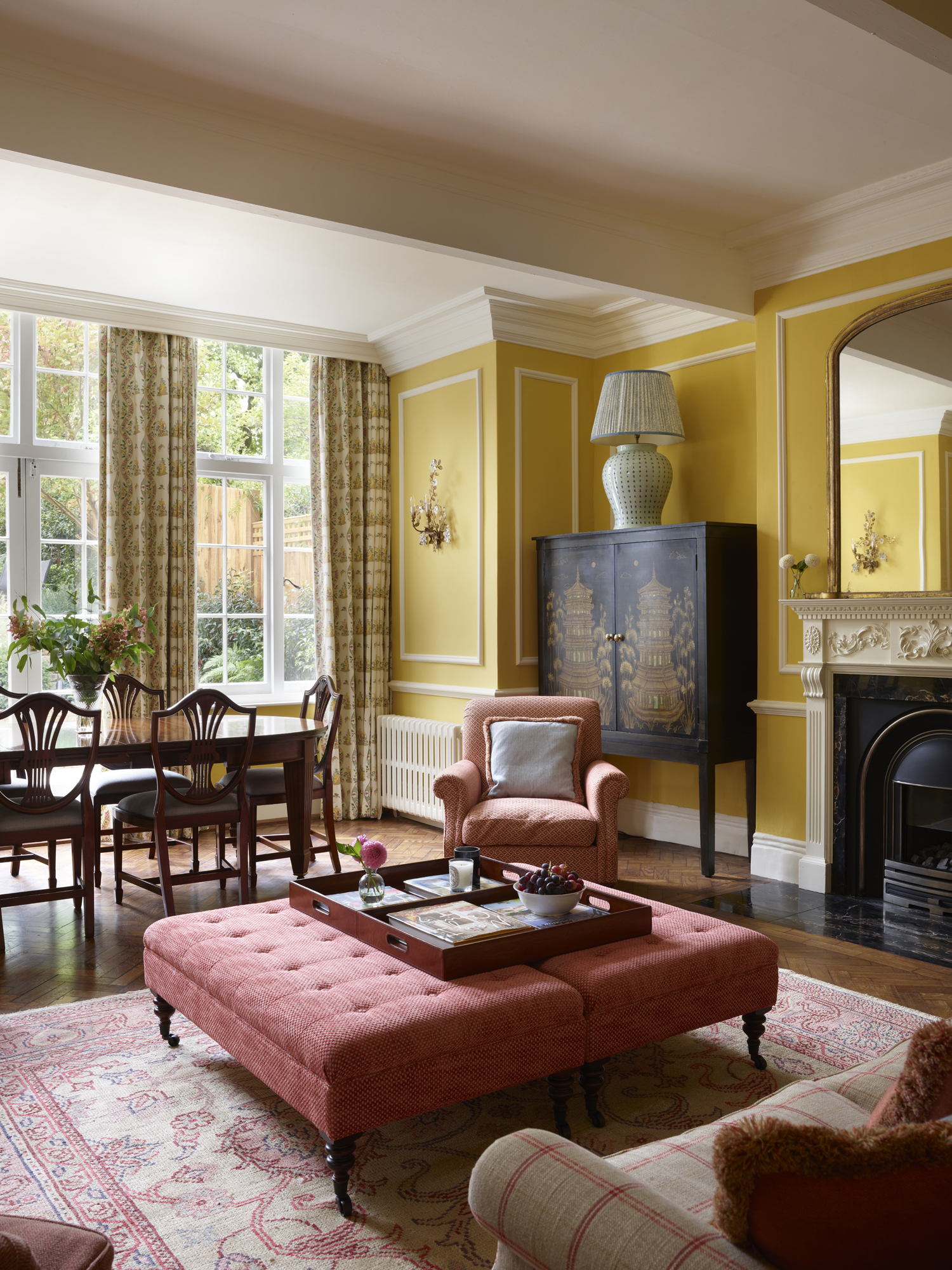 The main drawing room was painted a wonderful, red/yellow: Farrow & Ball's Babouche. It needed cornicing and carefully planned mouldings to refine the walls. We commissioned a Chinoiserie wall with hand painted butterflies and flourishes to allow it to stand alone as a piece of art. The hot yellow contrasts beautifully with the cool blue of the kitchen and the Soane wallpaper. It remains fresh and bright and lets the floor to ceiling views of the garden take hold.