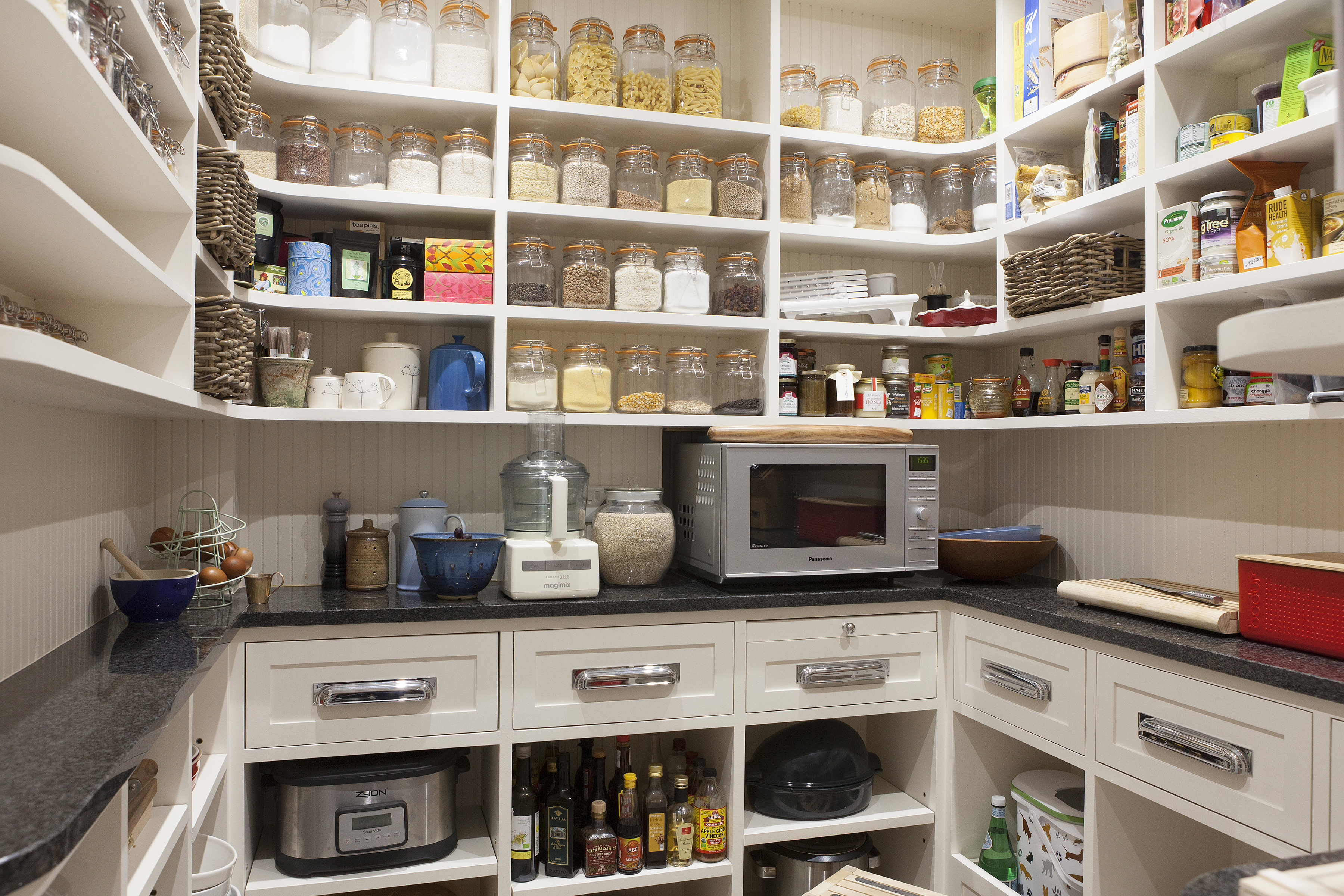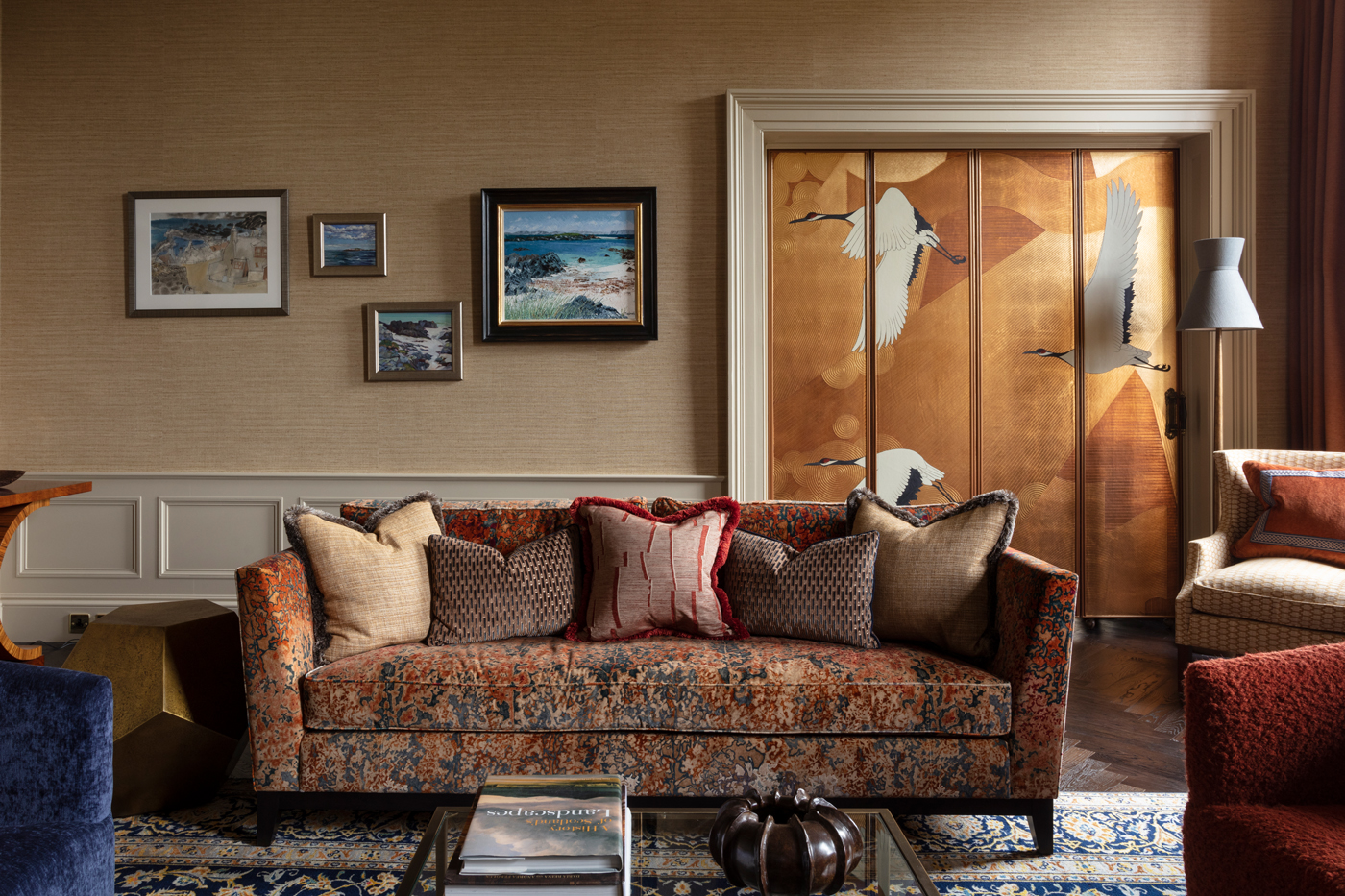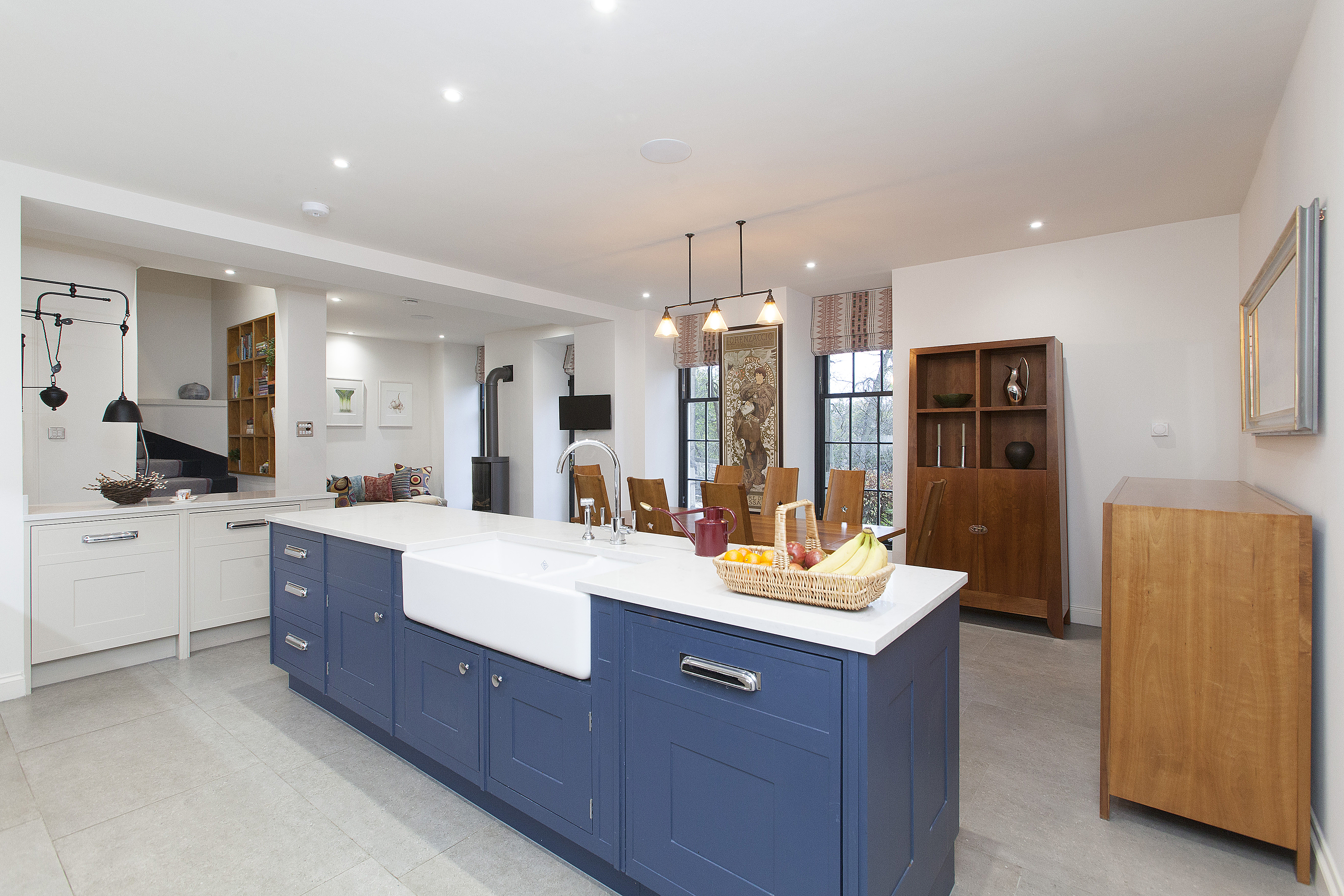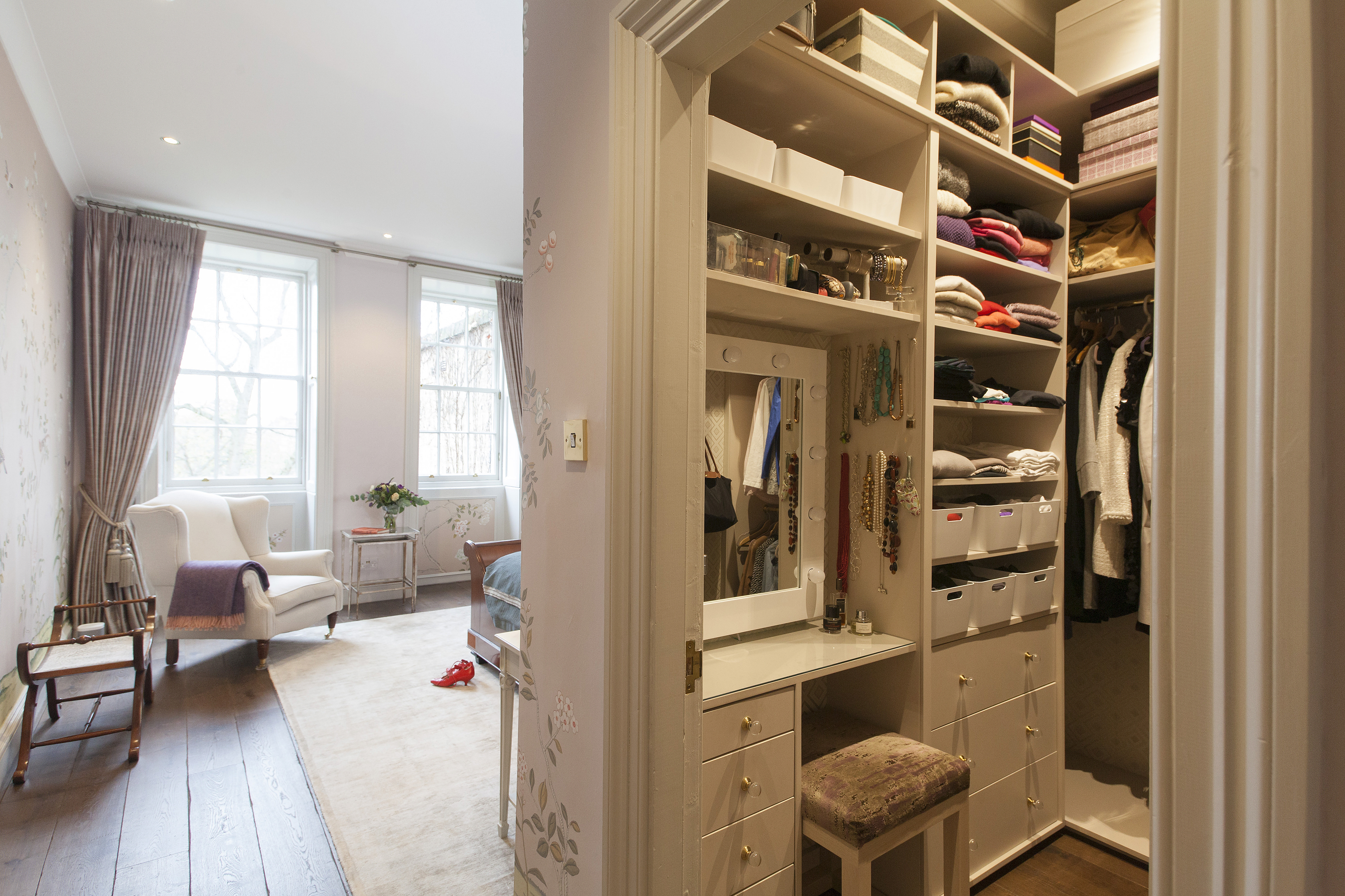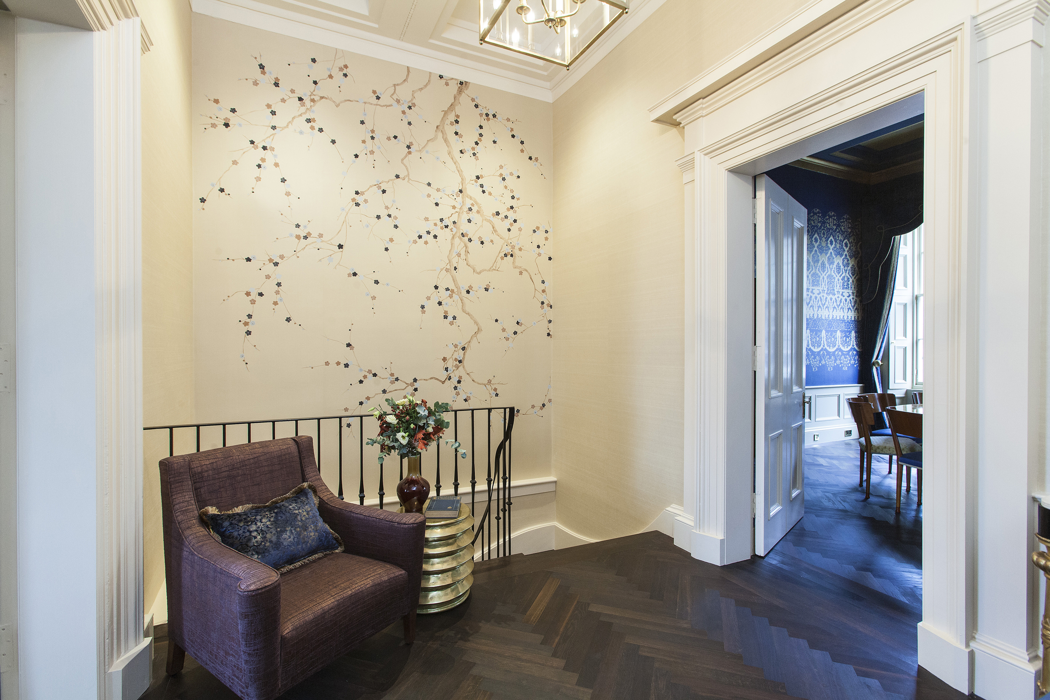 From the total re-configuration of the basement kitchen area upwards no stone was left unturned. Meticulously designed cabinetry was called for with his and her dressing rooms, study, cinema room, pantry and wine cellar. Stunning lighting, bespoke wallpapers, unique finishes. All were expertly combined to incorporate the clients’ existing pieces, their art and their many enthusiasms.