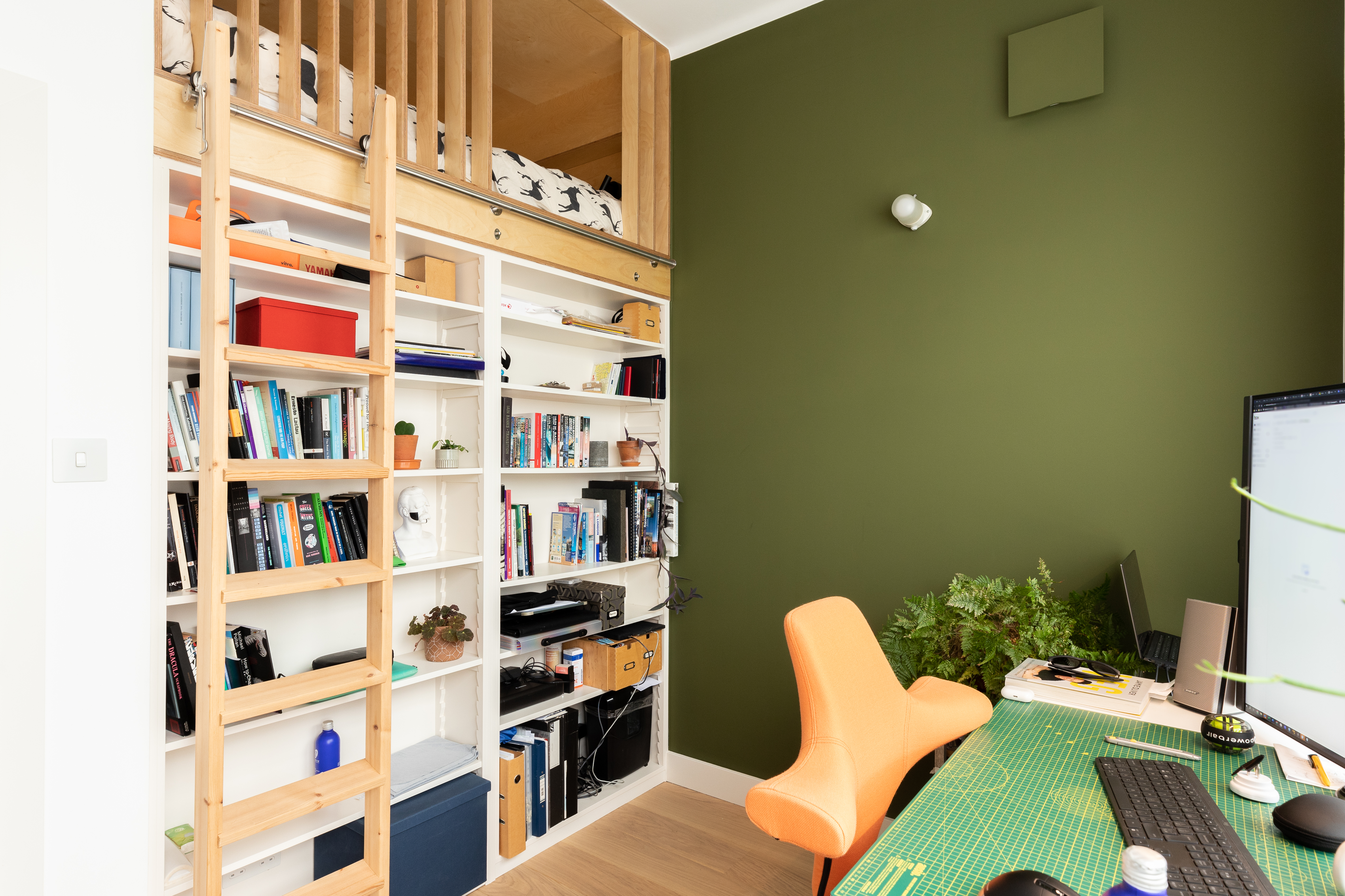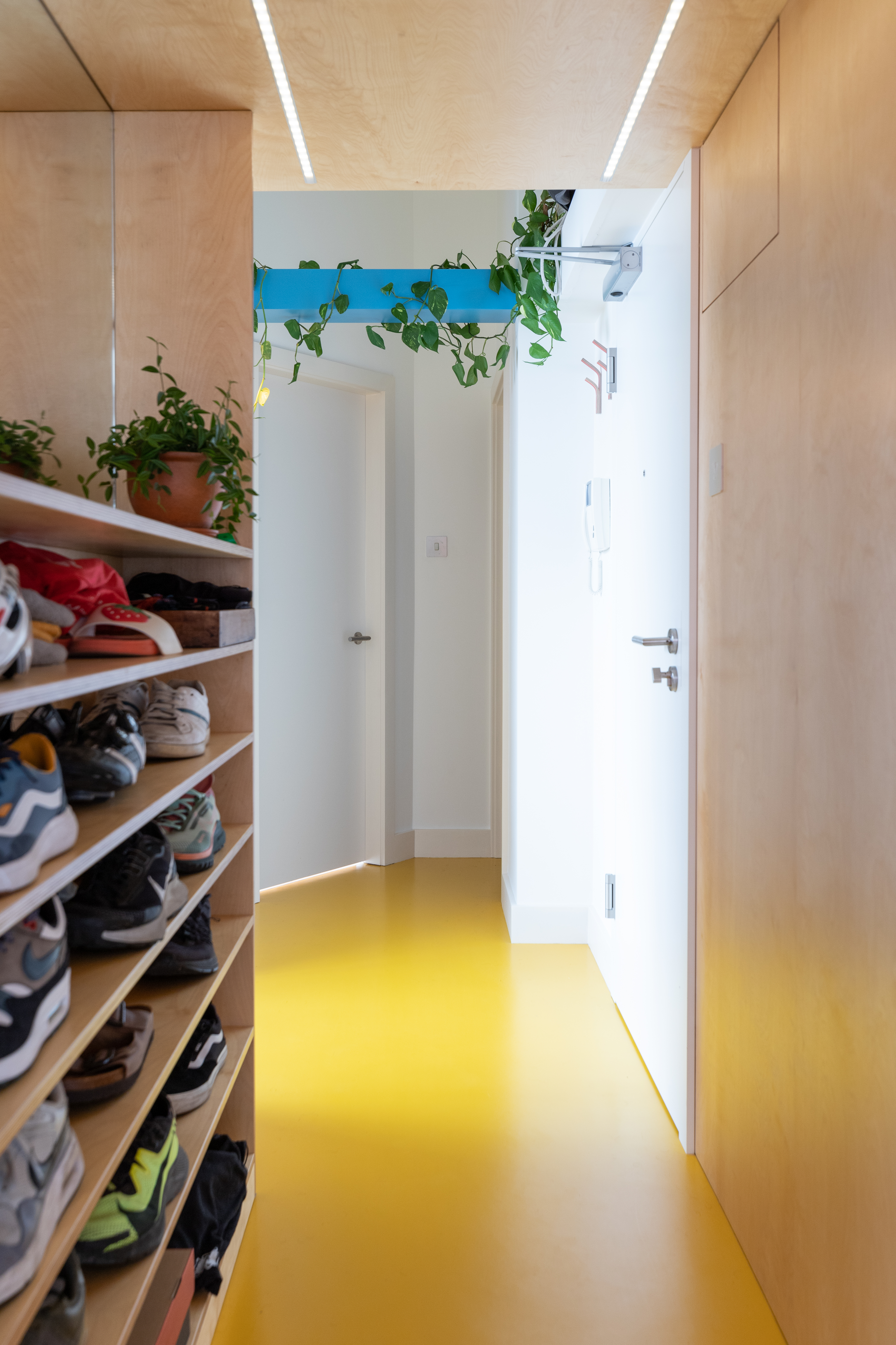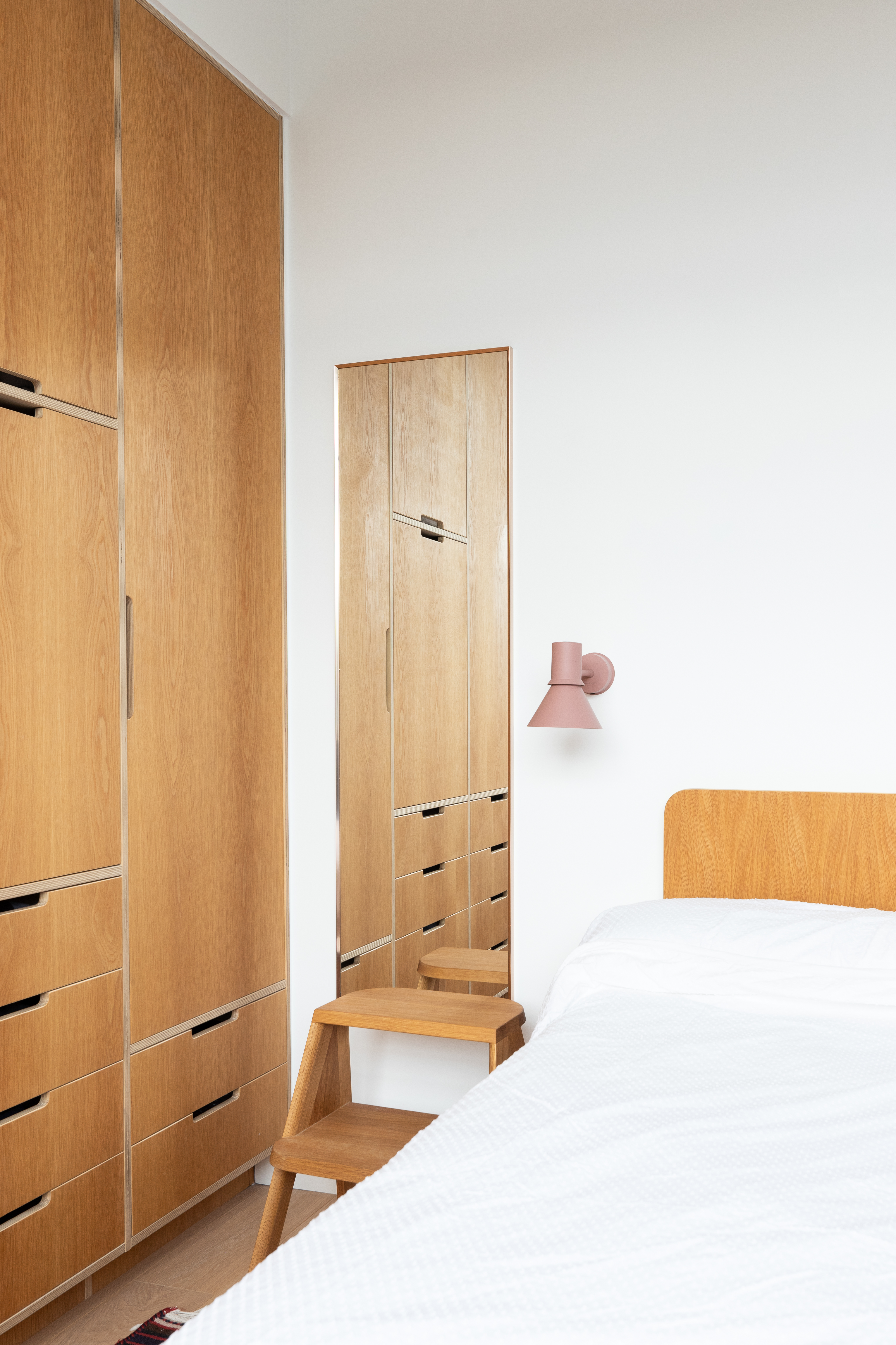 A new storage platform was designed to make use of otherwise redundant space above the hallway. Most of the structural supports have been hidden within the walls – and the one visible beam now makes a great feature, accentuated in a bright blue. The hallway space beneath has been finished in birch ply with lovely edge detailing, and the area perfectly completed with cheerful yellow rubber flooring. Integrated lighting and a large mirror make the space feel open and welcoming.