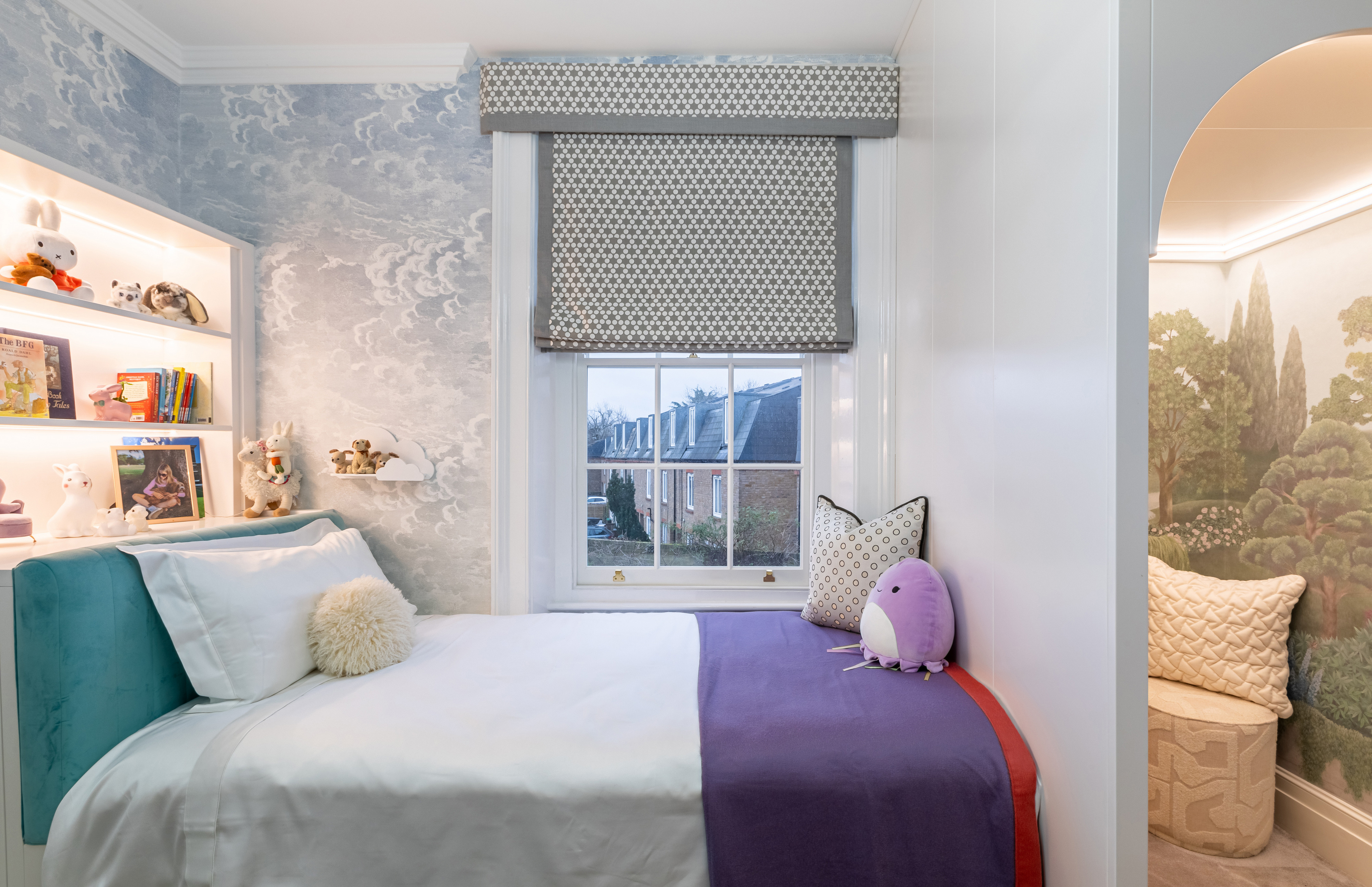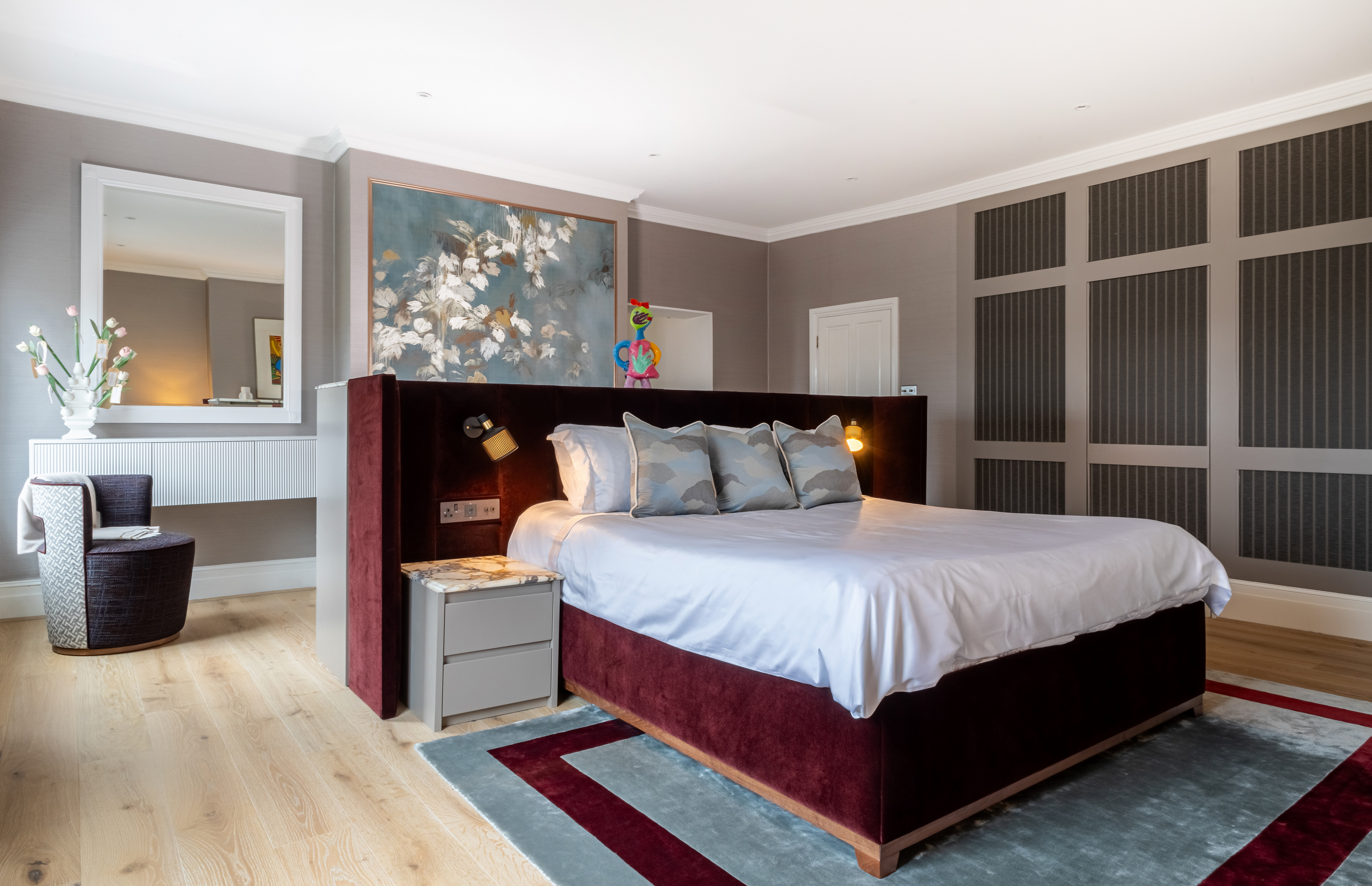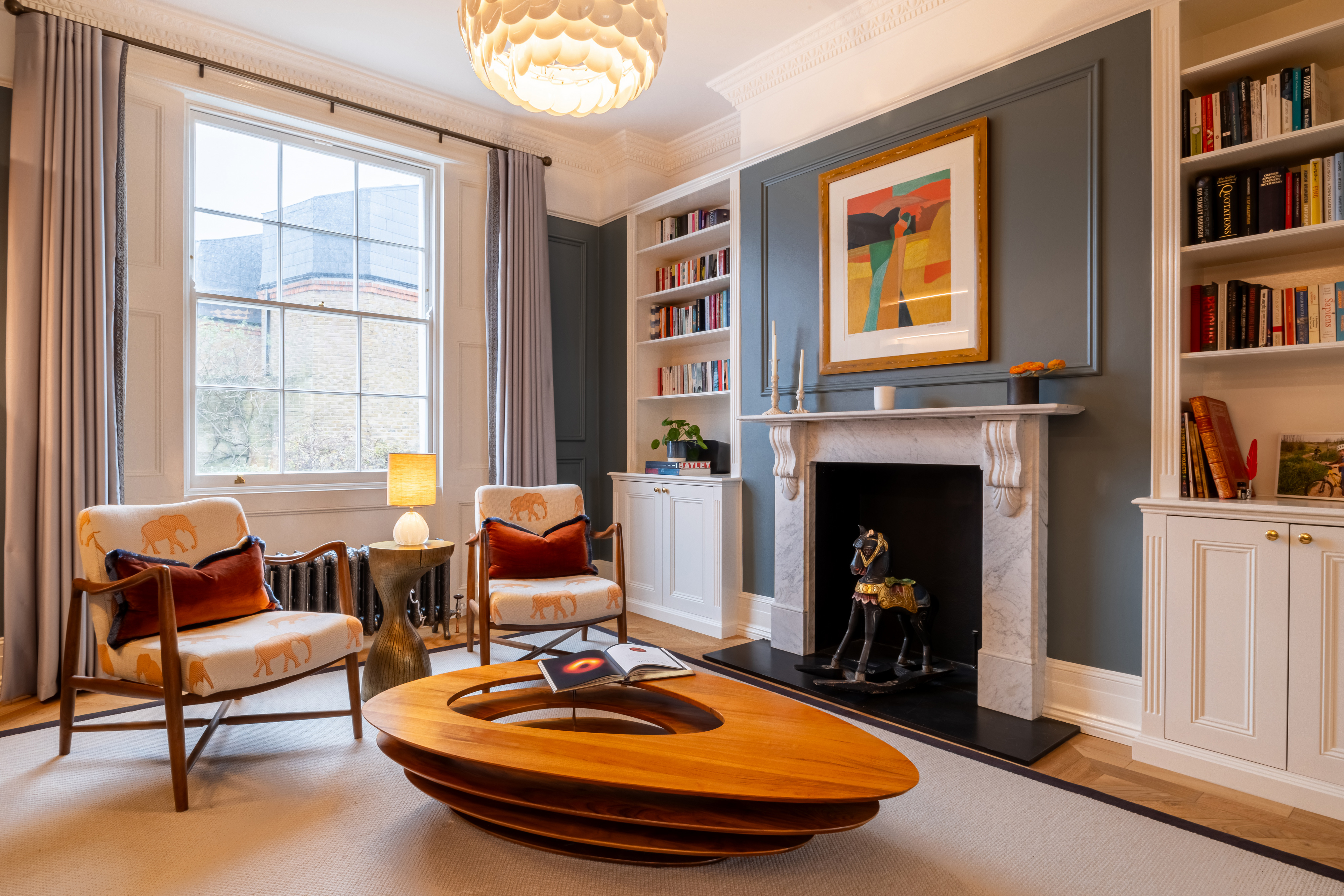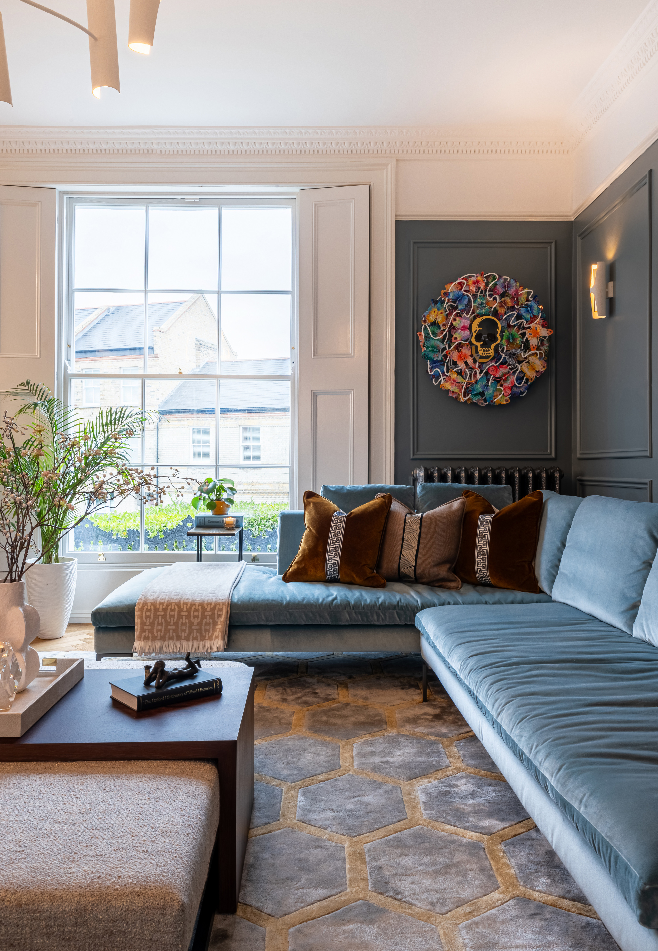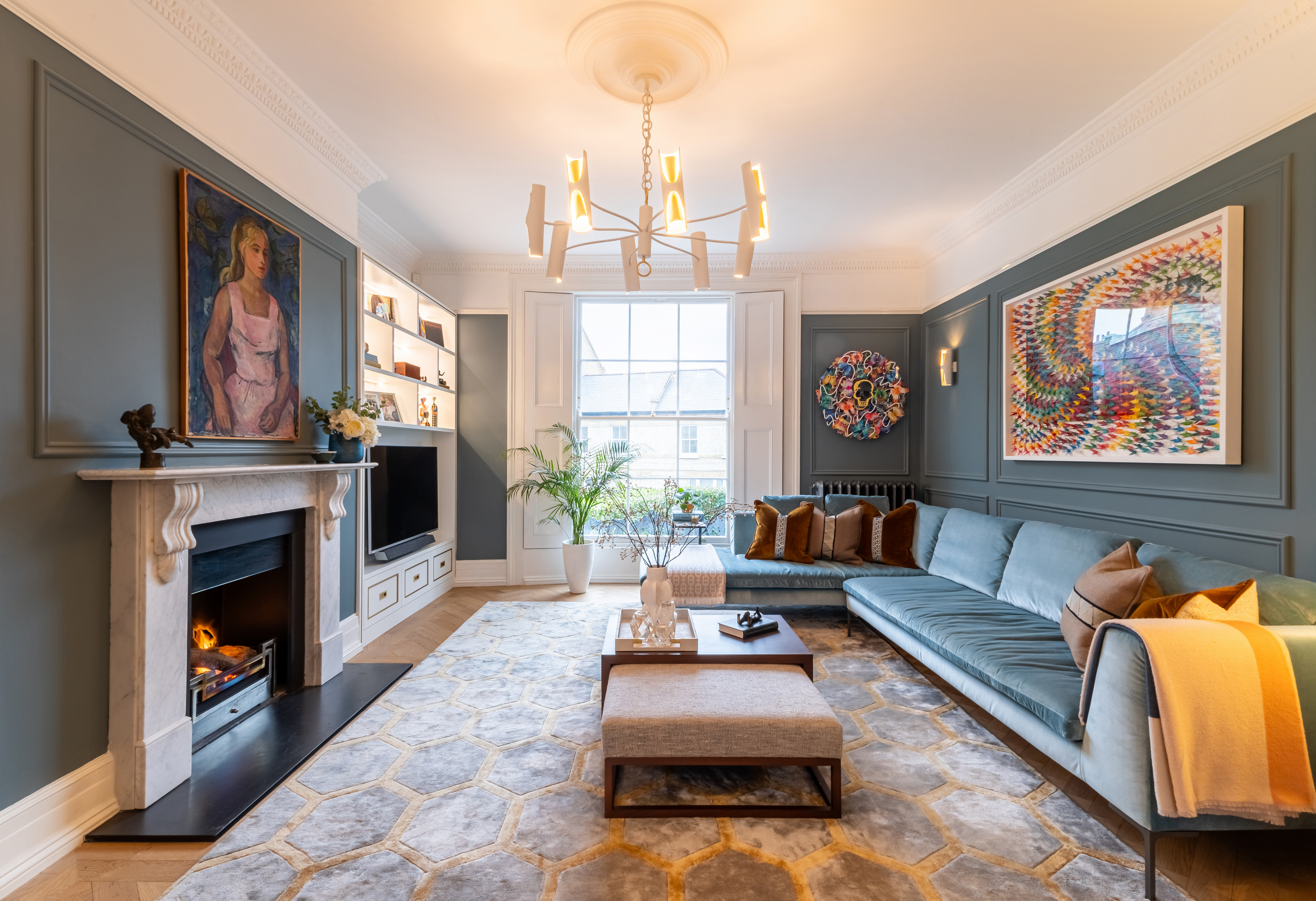 First we had to get the planning permission to replace all windows followed by installing new floors, panelling , bespoke joinery and furniture. In the living room, soft blue panelled walls provide a serene backdrop to a carefully curated space. The ornate cornicing and the restored marble fireplace nod to the property’s rich history, while a sleek, custom-built shelving unit with integrated lighting introduces a modern edge. A plush L-shaped sofa anchors the room, inviting comfort, while bold, colourful artwork injects personality into the space. Every detail has been thoughtfully considered, from the geometric patterned rug that ties the room together to the sculptural chandelier that casts a warm glow over the scene. The renovation showcases how thoughtful design can bridge the gap between old and new. It’s a reminder that modern living and historical preservation can go hand in hand, creating spaces that are both functional and deeply inspiring. At the heart of this renovation was an incredible partnership between the design team and the client. Their vision and trust allowed for a creative process that pushed boundaries while remaining true to the property’s heritage. Together, they have breathed new life into this London landmark, creating a home that will stand as a testament to timeless design for years to come.
