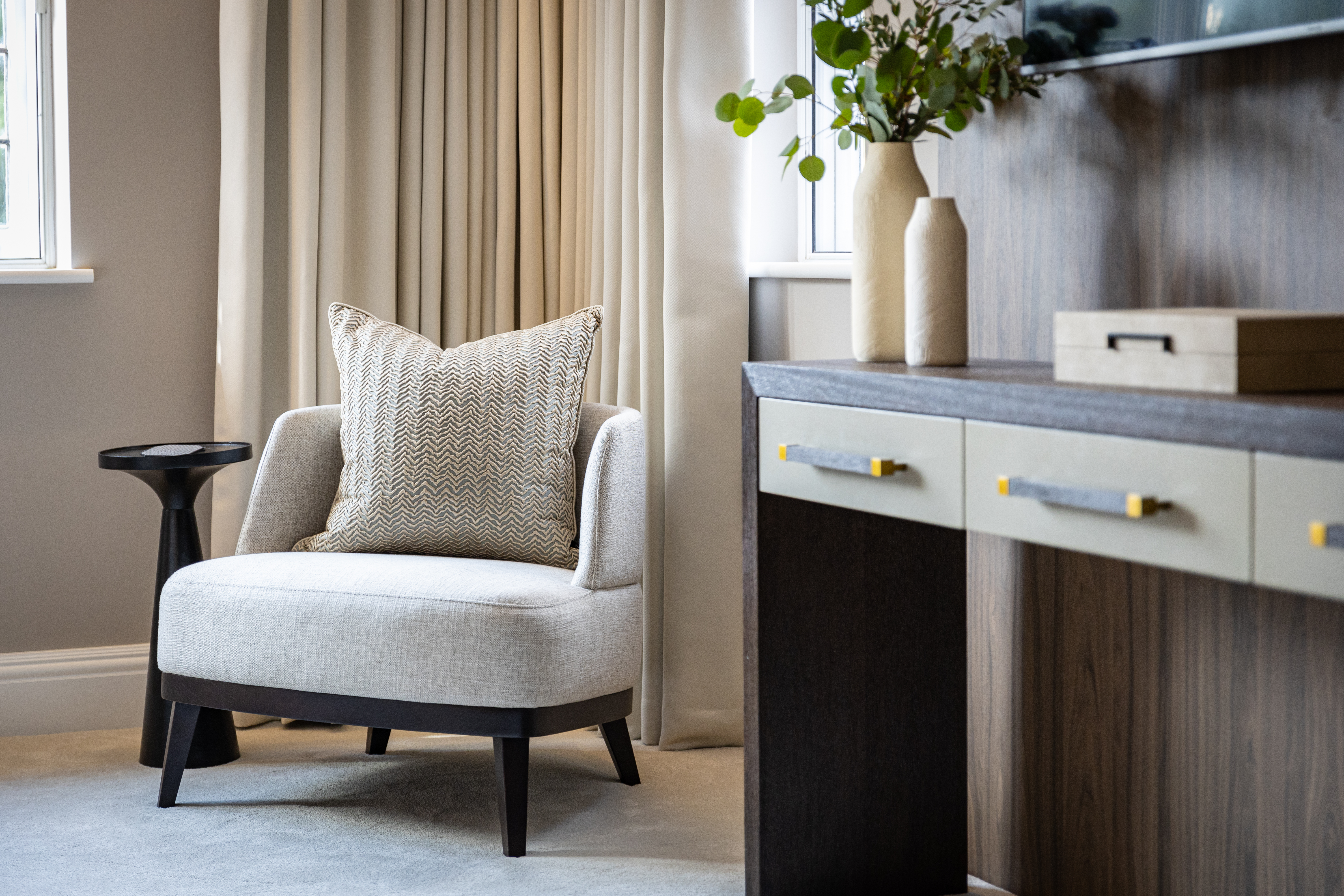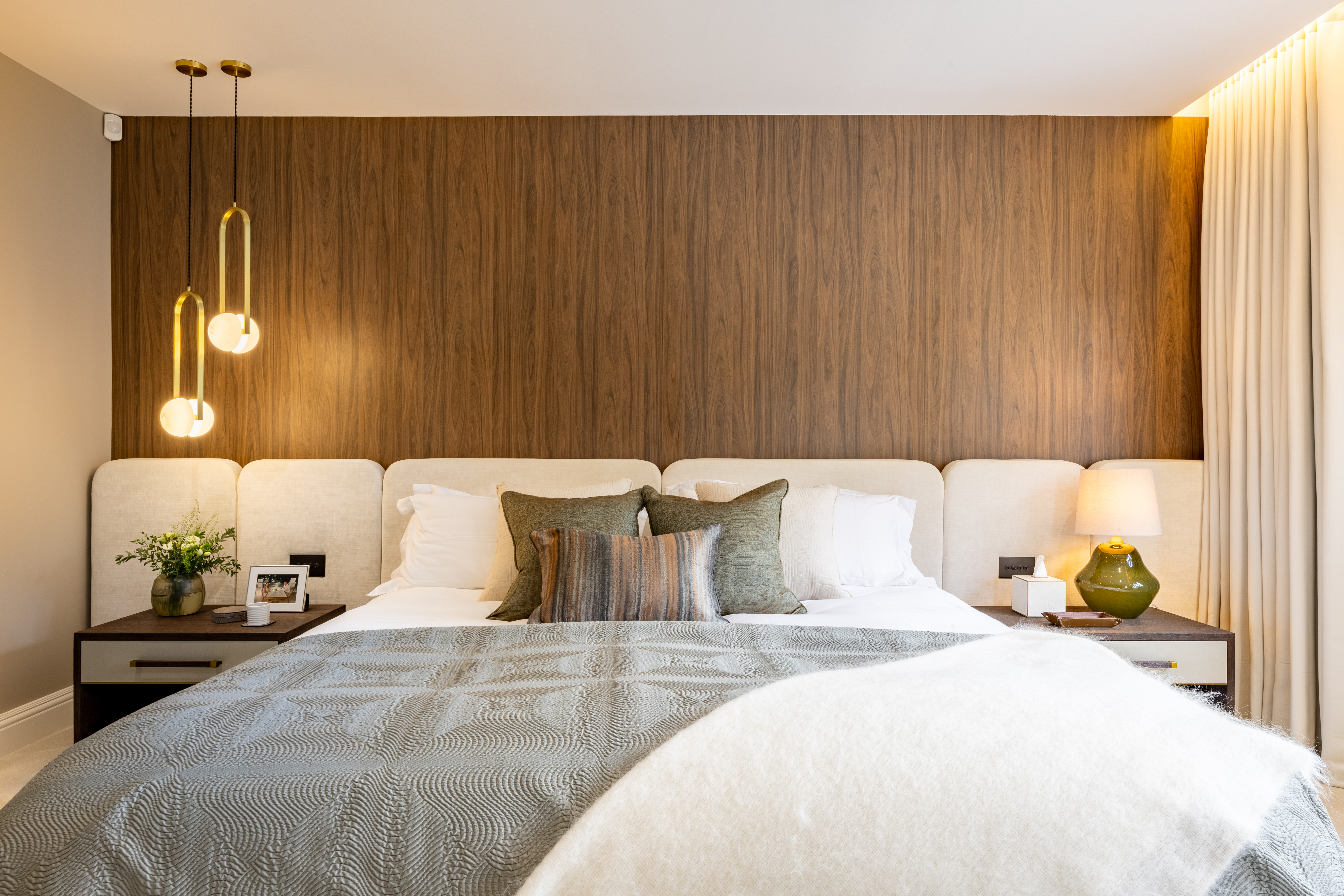 Our latest project transforms a space by removing an existing staircase and two bathrooms to create a stunning master bedroom with two ensuite bathrooms and walk-in closets. The room features an elegant upholstered headboard against rich wooden finishes, enhanced by soft, indirect lighting for a warm atmosphere. Hidden doors lead to the walk-in closets and ensuites, keeping the design sleek and clutter-free.