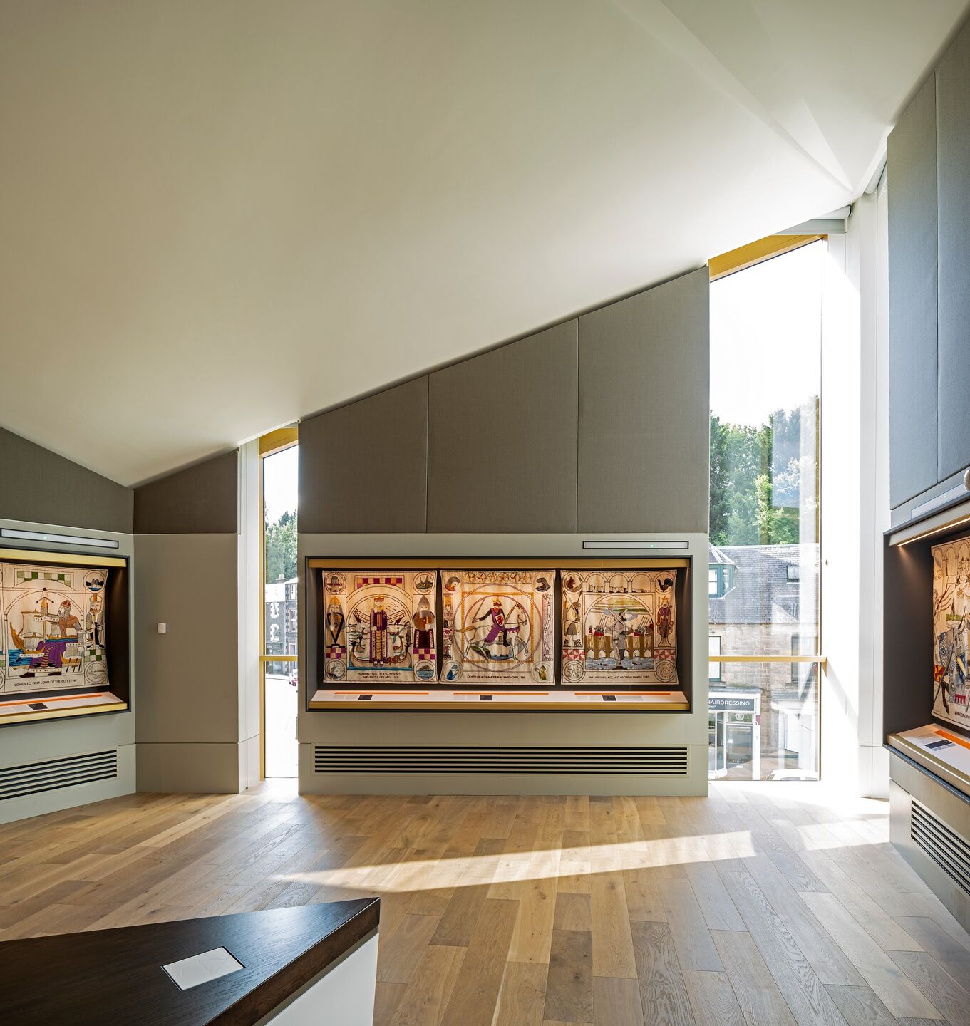 Inspired by modern architecture, the building features minimalistic interiors, streamlined form and sharp, clean edges. Inside its main gallery sits the 160 panels of tapestry created by artist Andrew Crummy, historian Alistair Moffat and author Alexander McCall Smith.