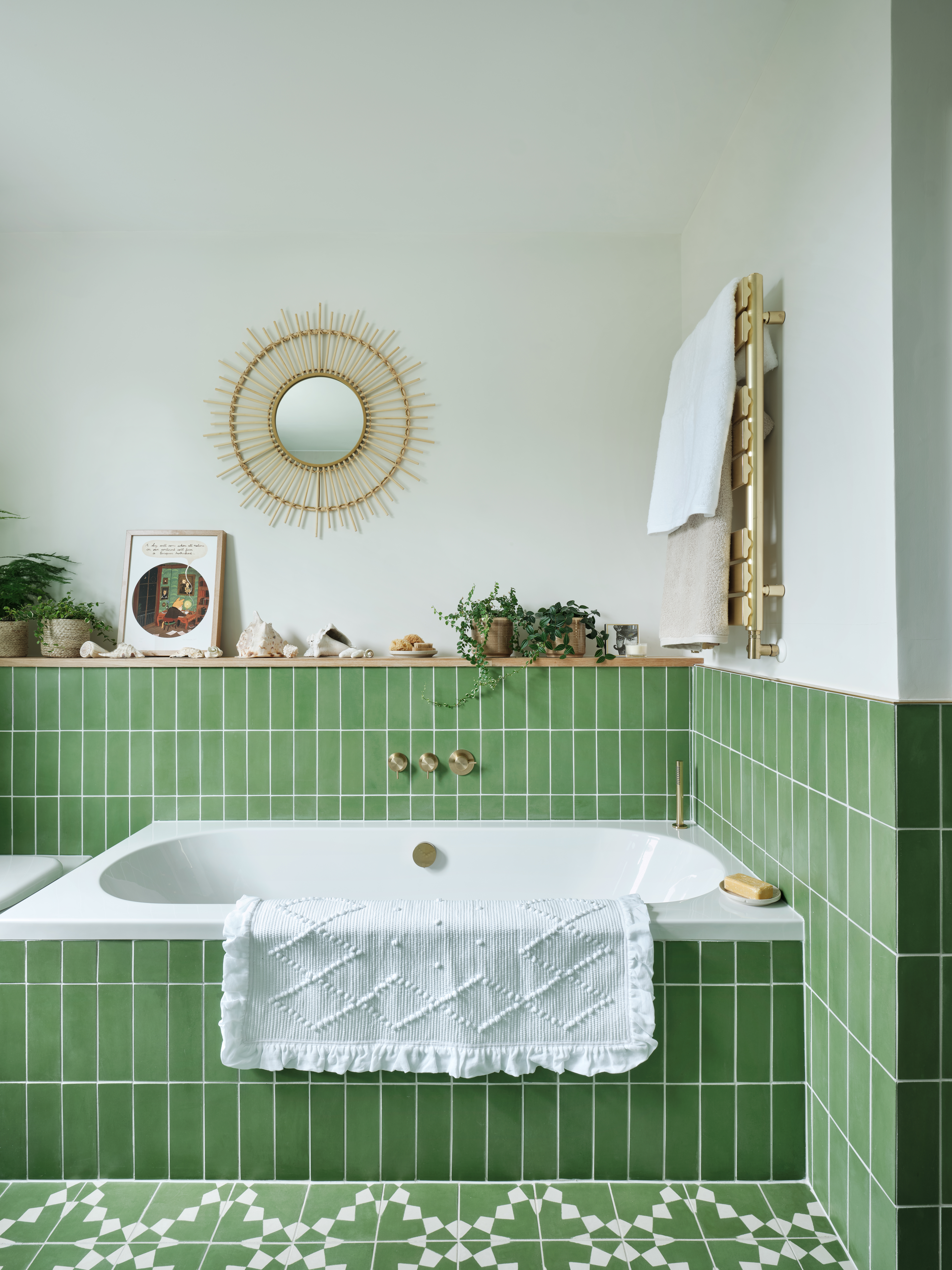 Forest Green tiles wrap around the lower half of the walls in the larger bathroom, adding that splash of colour. We designed a two-tone look in the shower to mirror the adjacent walls. The made to order Bert and May floor tiles brings the space to life and what could be more lovely than a bath filled with plants.