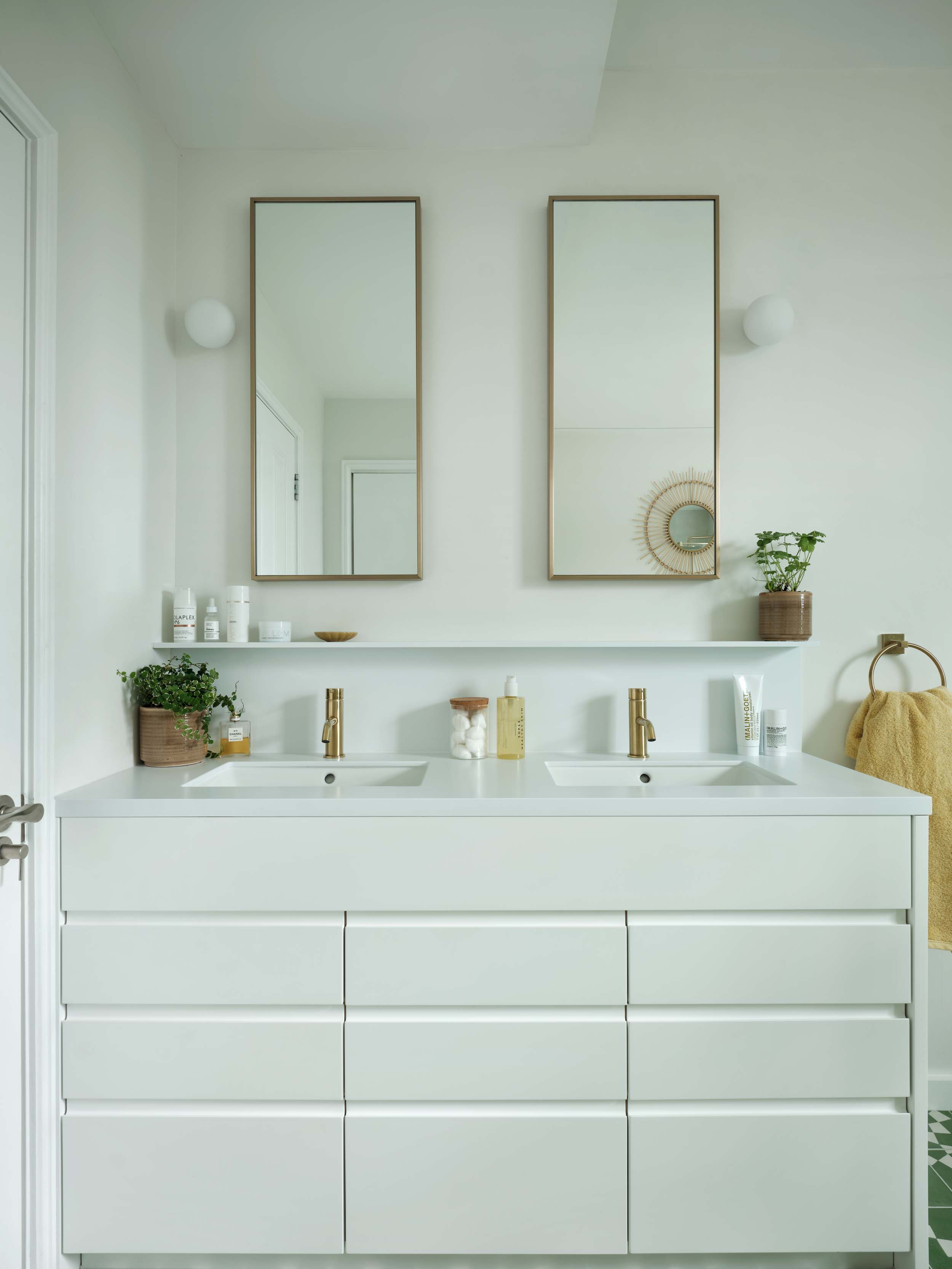 With walls and floors covered in dark-grey tiles and age-old sanitaryware this family bathroom and en-suite were in much need of a refresh. To make better use of the space we re-jigged the layout and built bespoke joinery to maximise lotion and potion storage.