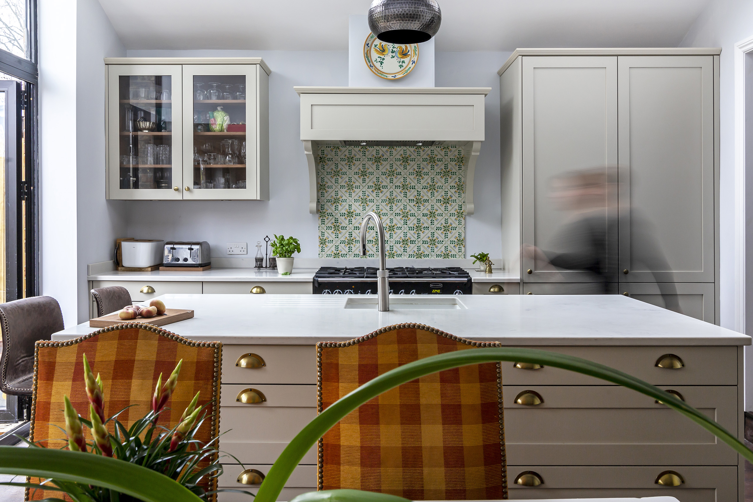 The bespoke nature of our service included detailing such as the bespoke extractor hood with corbels to match the cabinetry, and drawers on the dining side of the island for crockery and cutlery storage, so the client’s children can set and clear the table with ease.