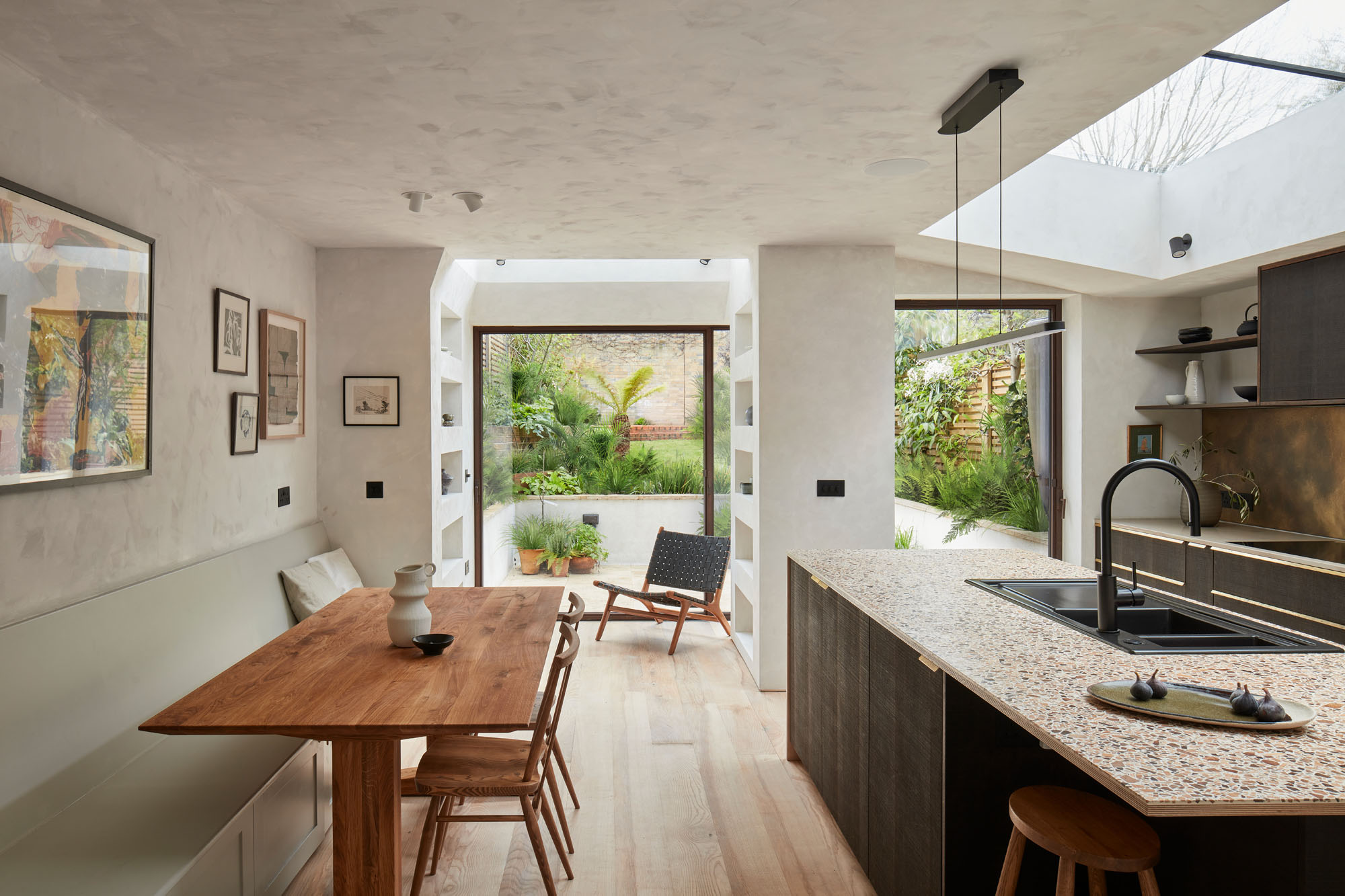 Rees Architects transformed this late Victorian townhouse in East Dulwich to harmonise with its garden, balancing period charm with sustainable, modern living. The redesign reoriented the layout, centering family life around a light-filled kitchen and dining space. Period features like plasterwork and floorboards were restored, while new materials—lime plasters, ash flooring, and sustainable terrazzo worktops—ensure durability. Thoughtful detailing and a timeless palette create a serene, functional home, blending tradition with modernity.