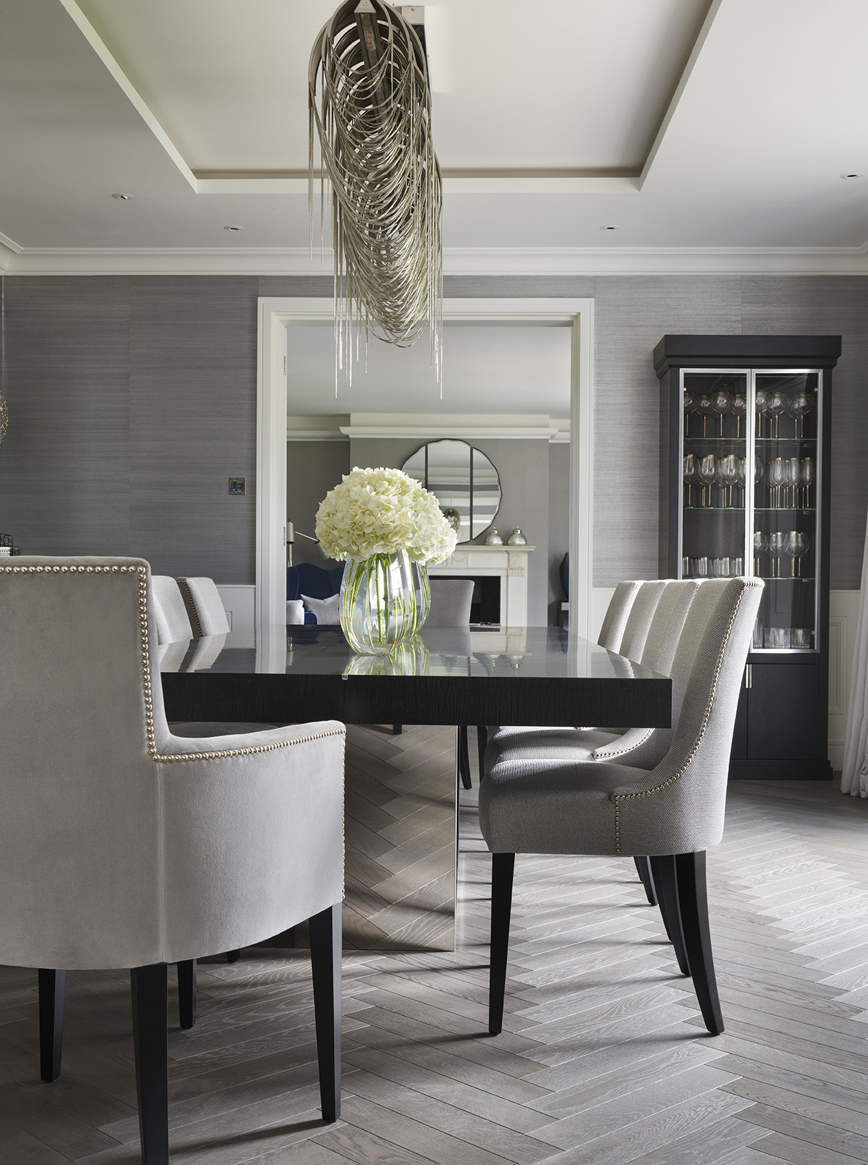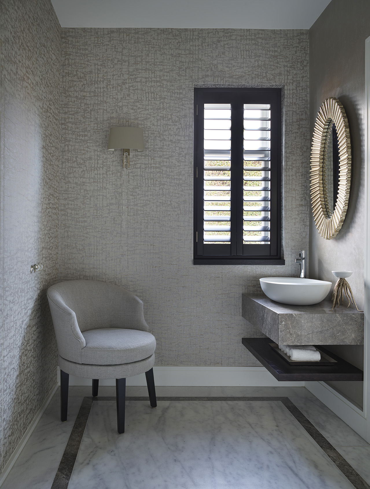 The initial plan was to move it to the back of the house leading out on to the garden, modernize it with sleek finishes, state-of-the-art appliances, and to create a layout that encouraged interaction, making it the heart of the home. The adjoining family room also required a refresh, aimed at enhancing comfort and style for family gatherings. Soft, muted cabinetry in the kitchen was paired with an elegant waterfall marble island which became the focal point.