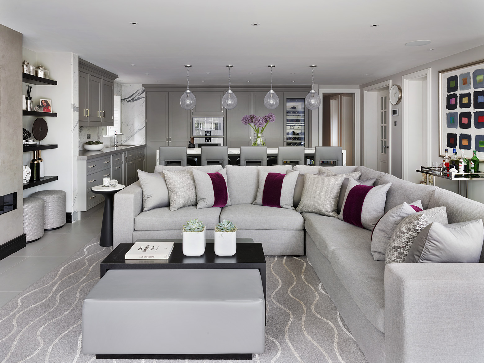 The family room, with its plush seating and inviting colour palette became an extension of the kitchen, fostering a seamless flow between the two spaces. Large windows invited natural light into the space.