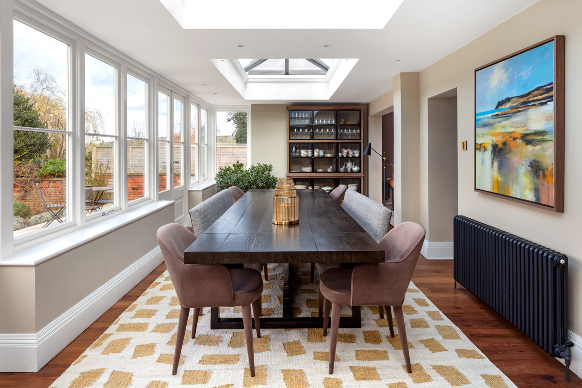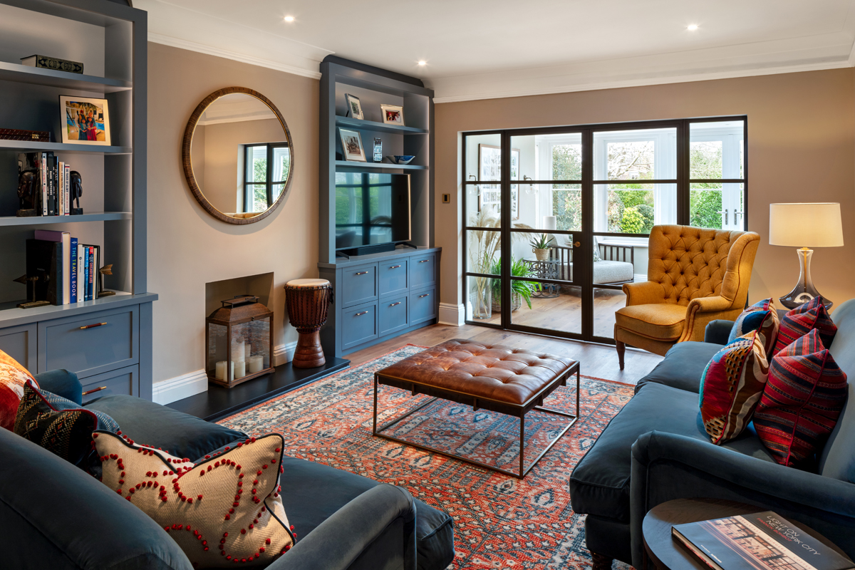 The new layout created an open kitchen and inviting snug area for family movie nights, with bespoke cabinetry for the TV and travel mementos. The orangery was transformed into a light, airy room for entertaining, featuring a large dining table with mixed seating. The formal sitting room, previously lacking natural light, was opened up with a large Crittall-style screen to the orangery, allowing light to filter through. Jewel-toned Howard-style sofas and cabinetry created a relaxing retreat.