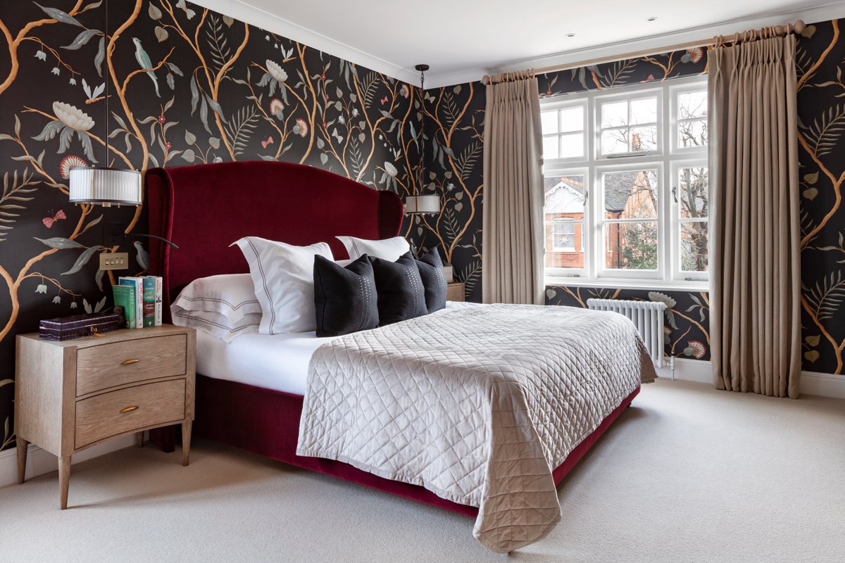 On the first floor, an elegant Master Bedroom and en-suite were created using striking Lewis and Wood wallpaper. The Master Dressing Room included a sofa bed and glass-fronted wardrobes, providing ample storage. The second floor was dedicated to the children, featuring two double bedrooms, a dressing room, a bathroom, and a snug area with a reupholstered sofa and TV. This space was designed to be fun and vibrant, giving the children a comfortable and stylish area to relax and play.