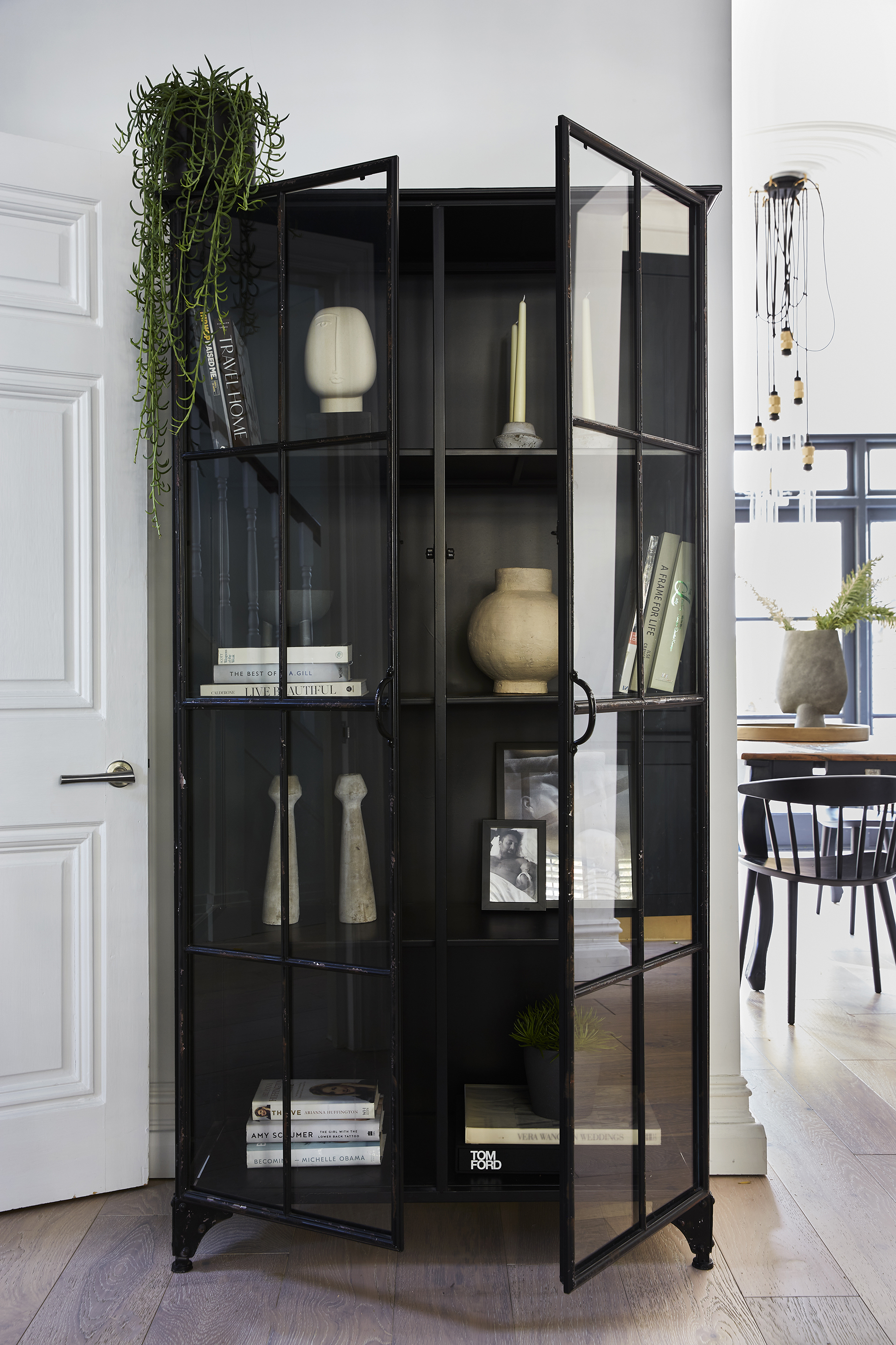 The property boasts a relaxing and stylish atmosphere with a mix of jewel heritage tones and earthy shades. The decor includes modern industrial lighting and furniture in black and brass, while chartreuse accents on the ground floor and dusty pink touches in the bedroom add a pop of color to the eclectic design.