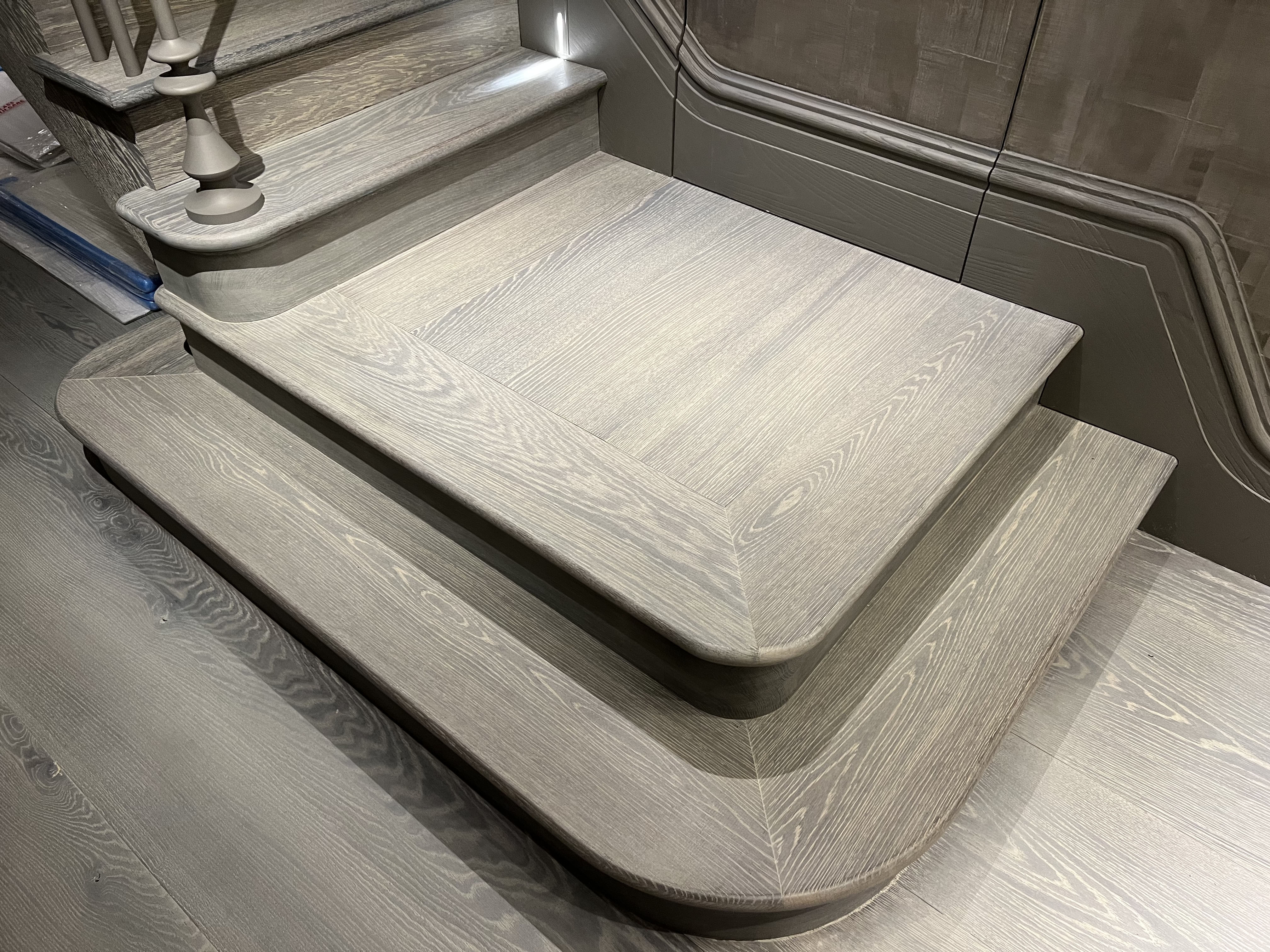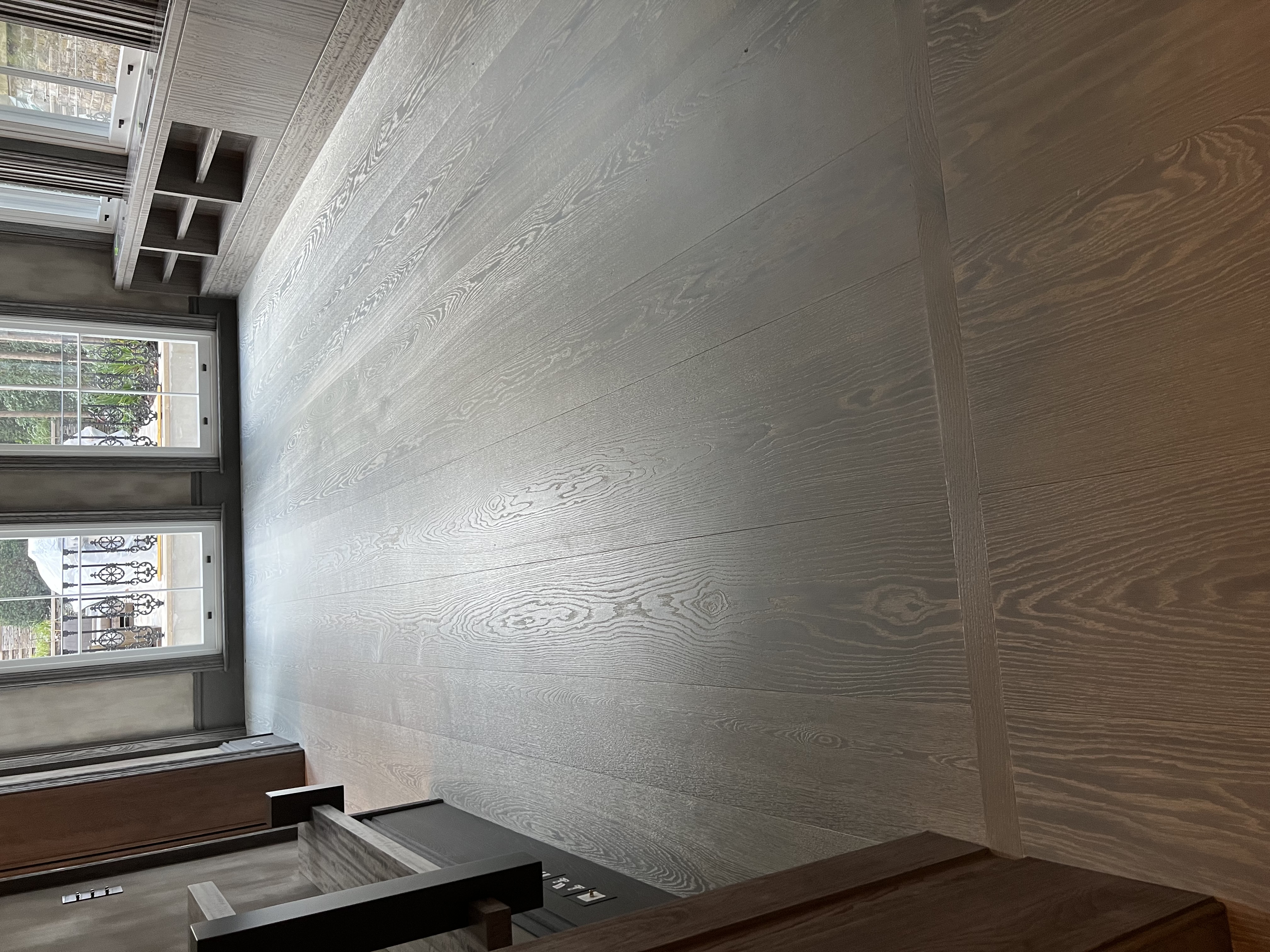 A wonderful project that we were incredibly proud to be part of. Amazing client with one of London's best design teams and certainly the number one contractor for high end resi work in the capitol and beyond. The project consisted of a range of mixed width plank from 232 mm wide to 402 mm wide with three floor levels being emtirely wall to wall plank length. The longest for this project was a smidge under 13 mts at 402 mm wide. Incredible dimensions for a core fumed material thats pre finished and in a grade of oak that that was next to blemish free. Included in the project spec was all the stair case elements you see in the images.