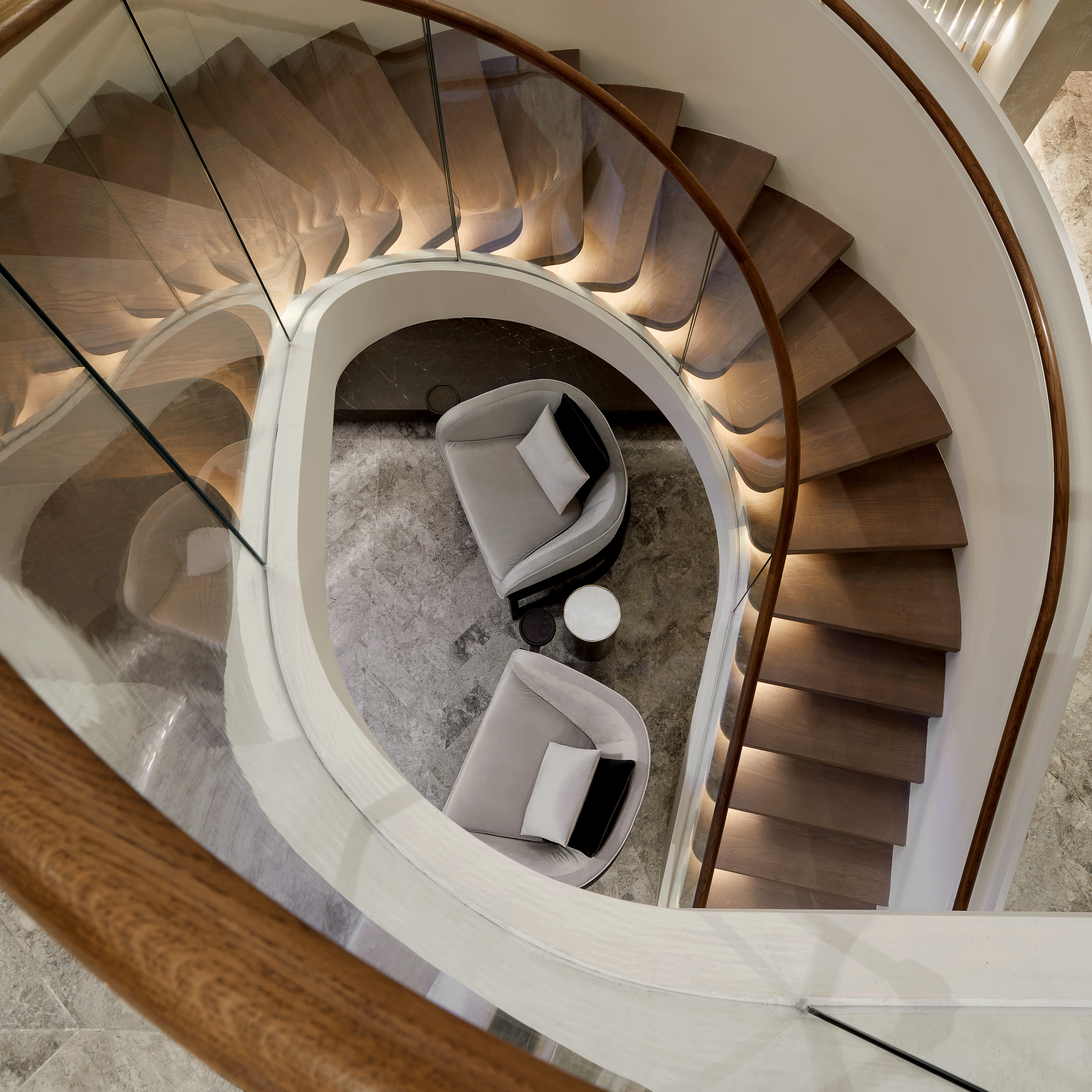 The sofas and chairs are made of bouclé fabrics, with hand-stitched leather, Cappuccino grey marble and dark brown stained oak timber. To complement the sofas, the same marble and wood form the coffee tables and centrepiece features.