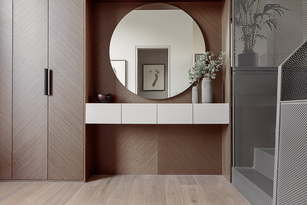 The intentional design includes a perforated metal staircase, emphasizing the urban vibe, harmoniously balanced by the book-matched veneer cabinetry. This family home was envisioned for a bustling lifestyle, offering private spaces for each member, alongside communal areas tailored for gatherings and socializing.
