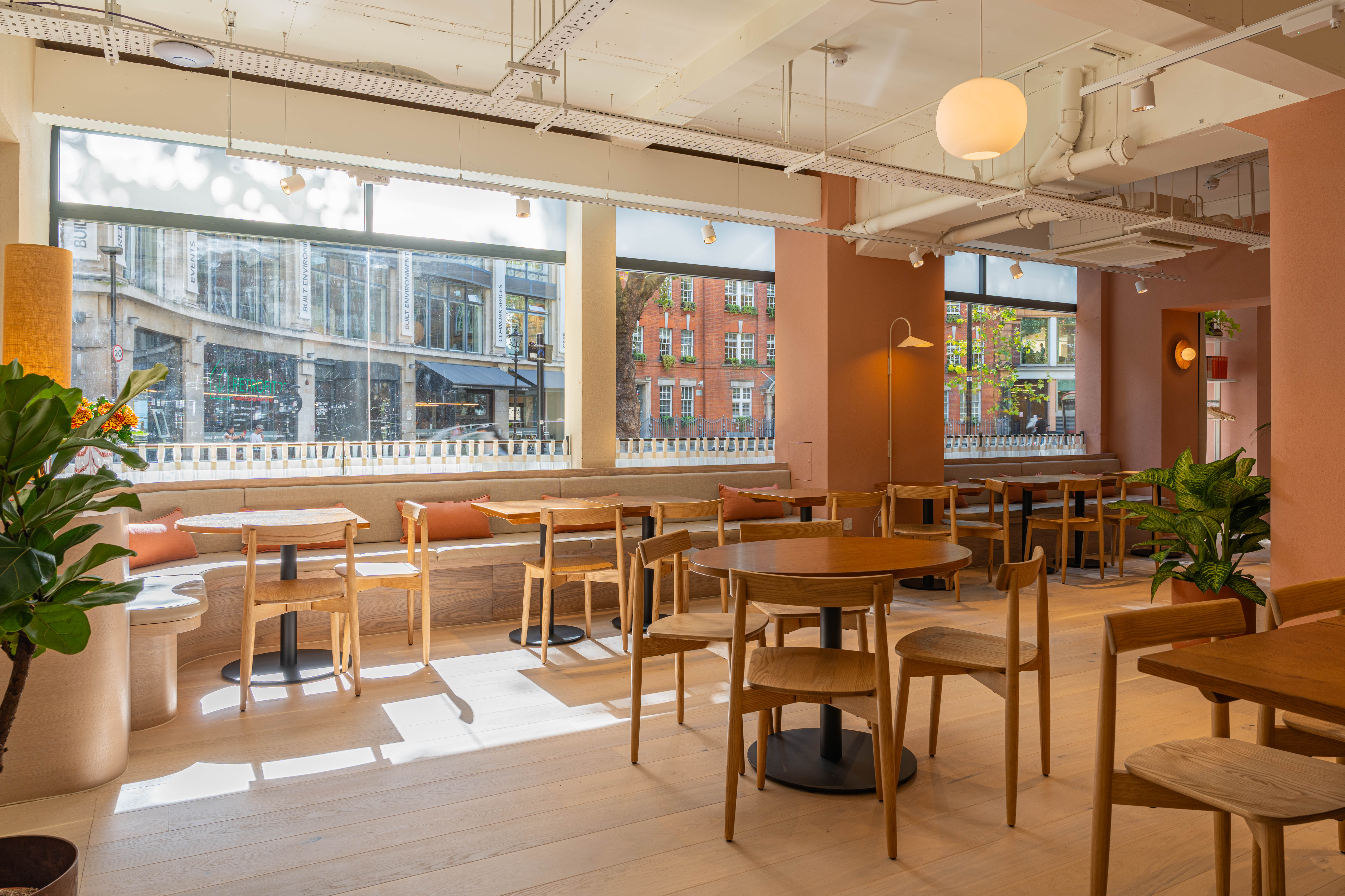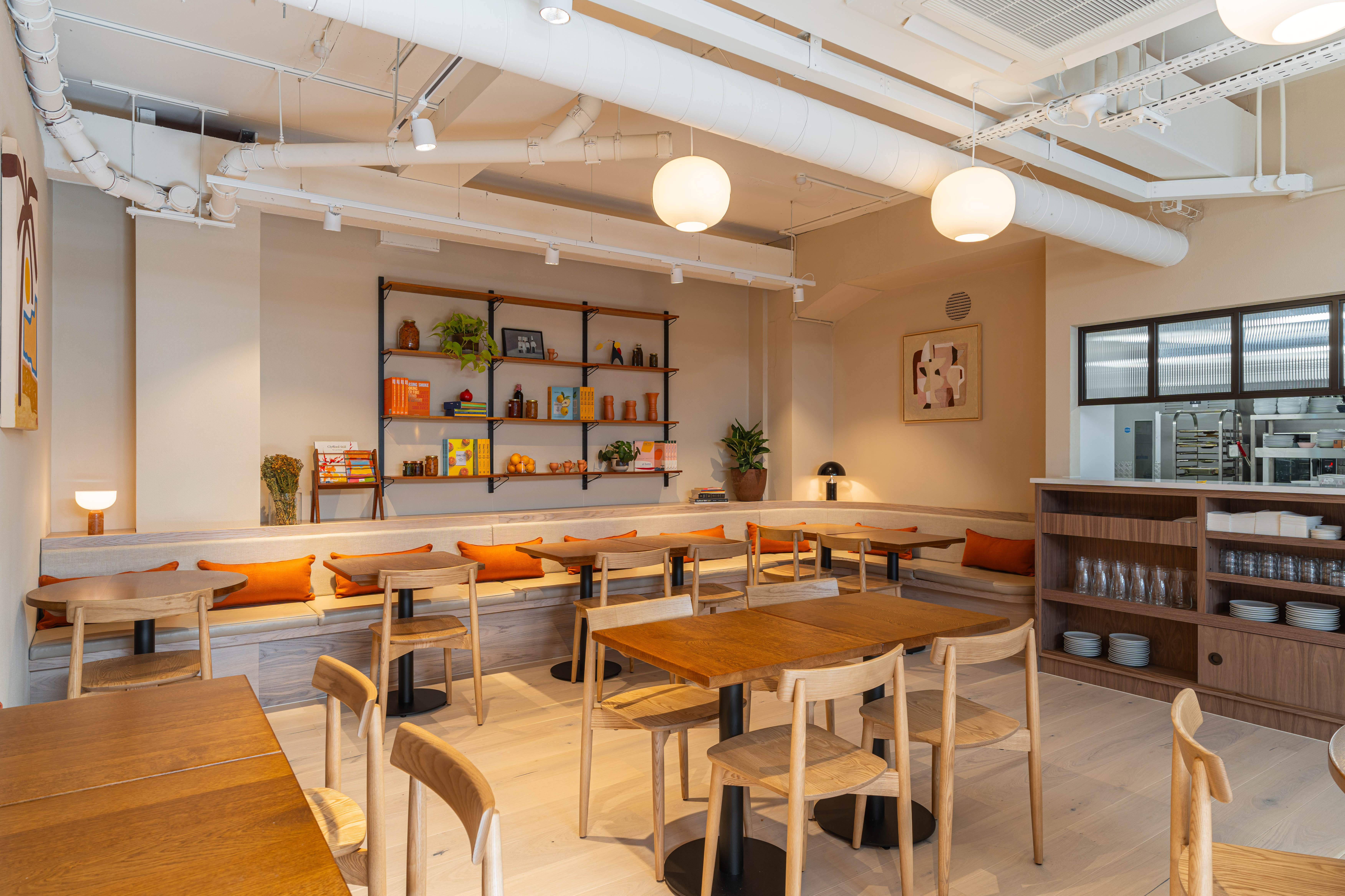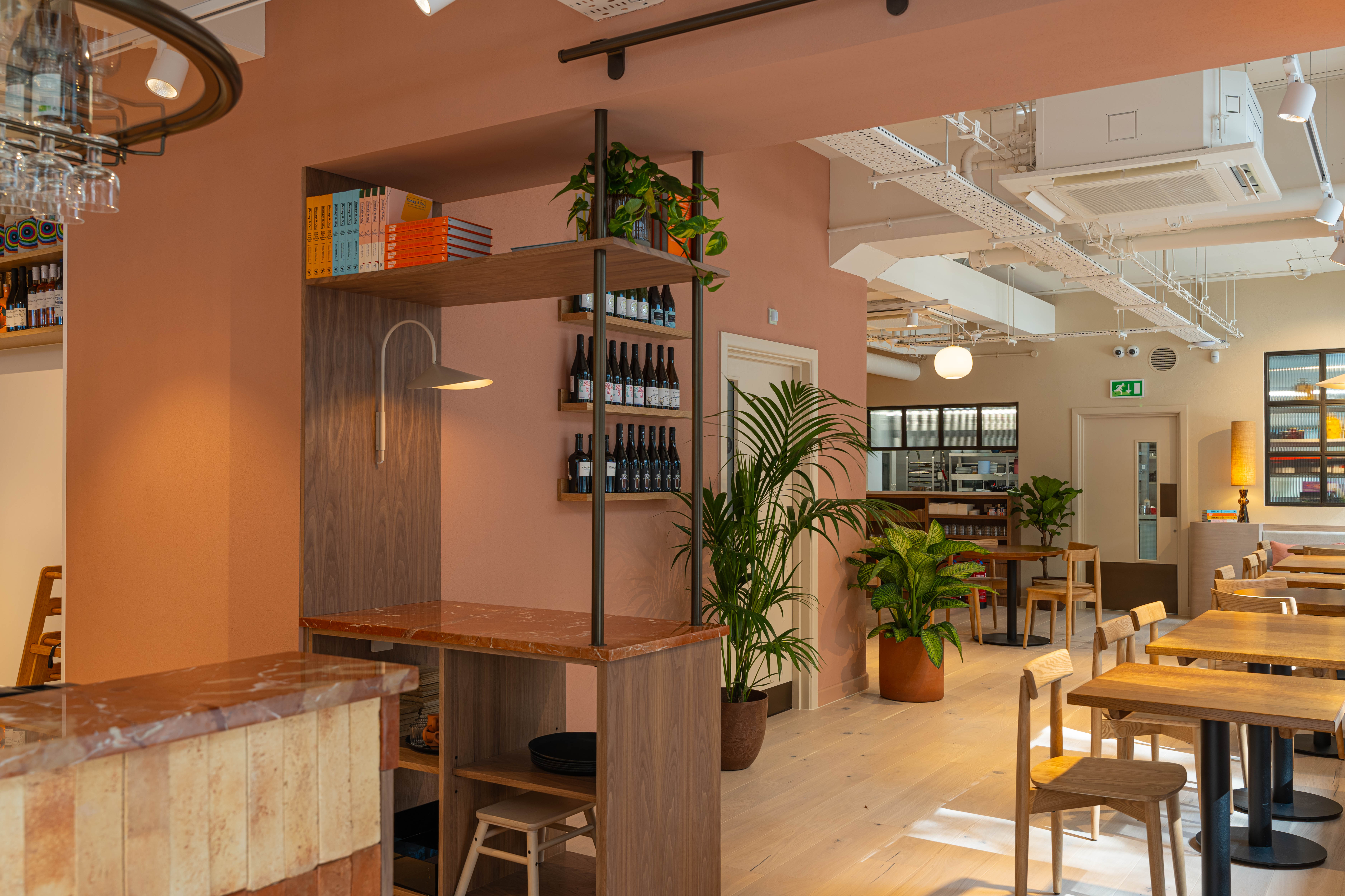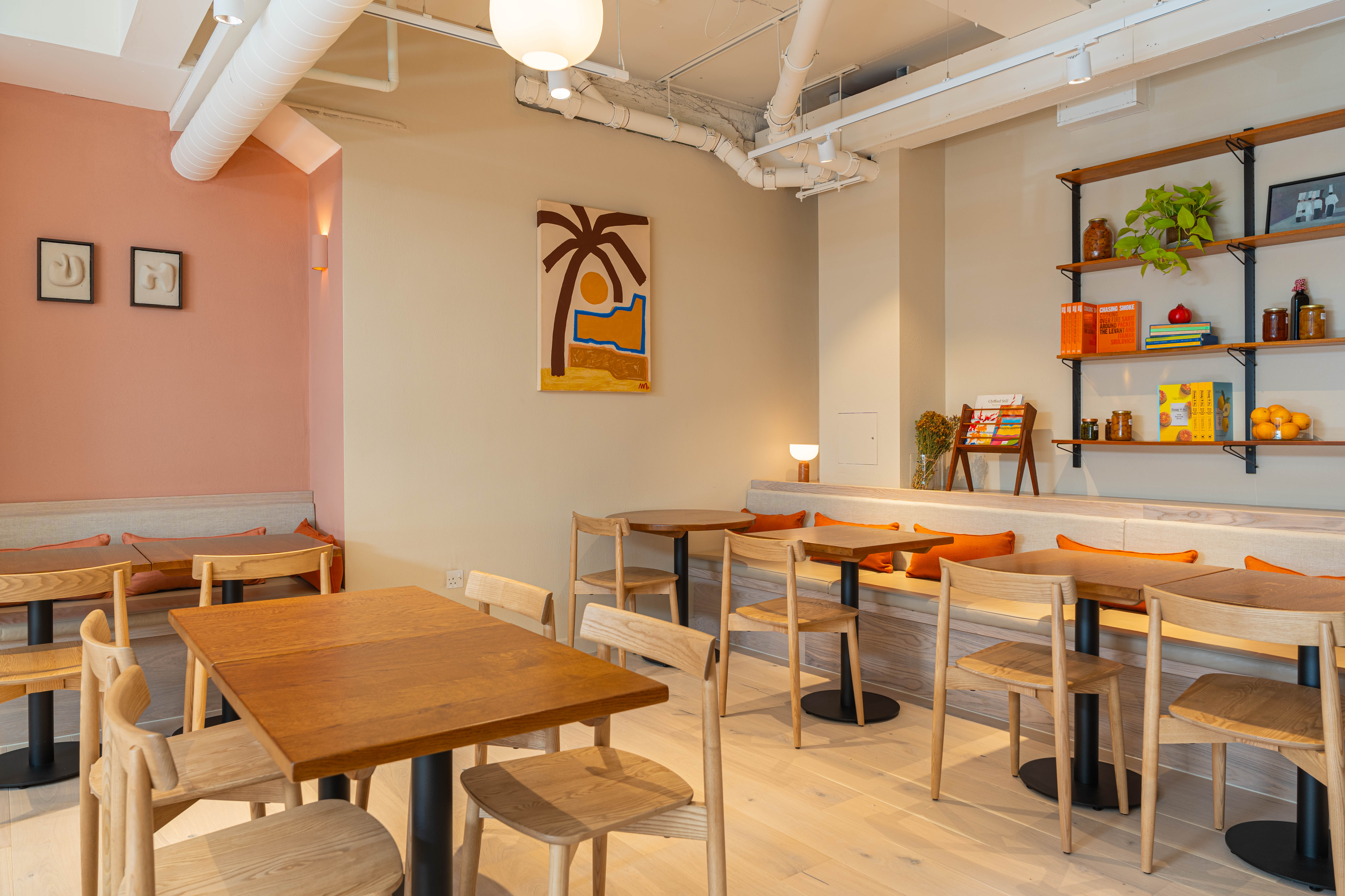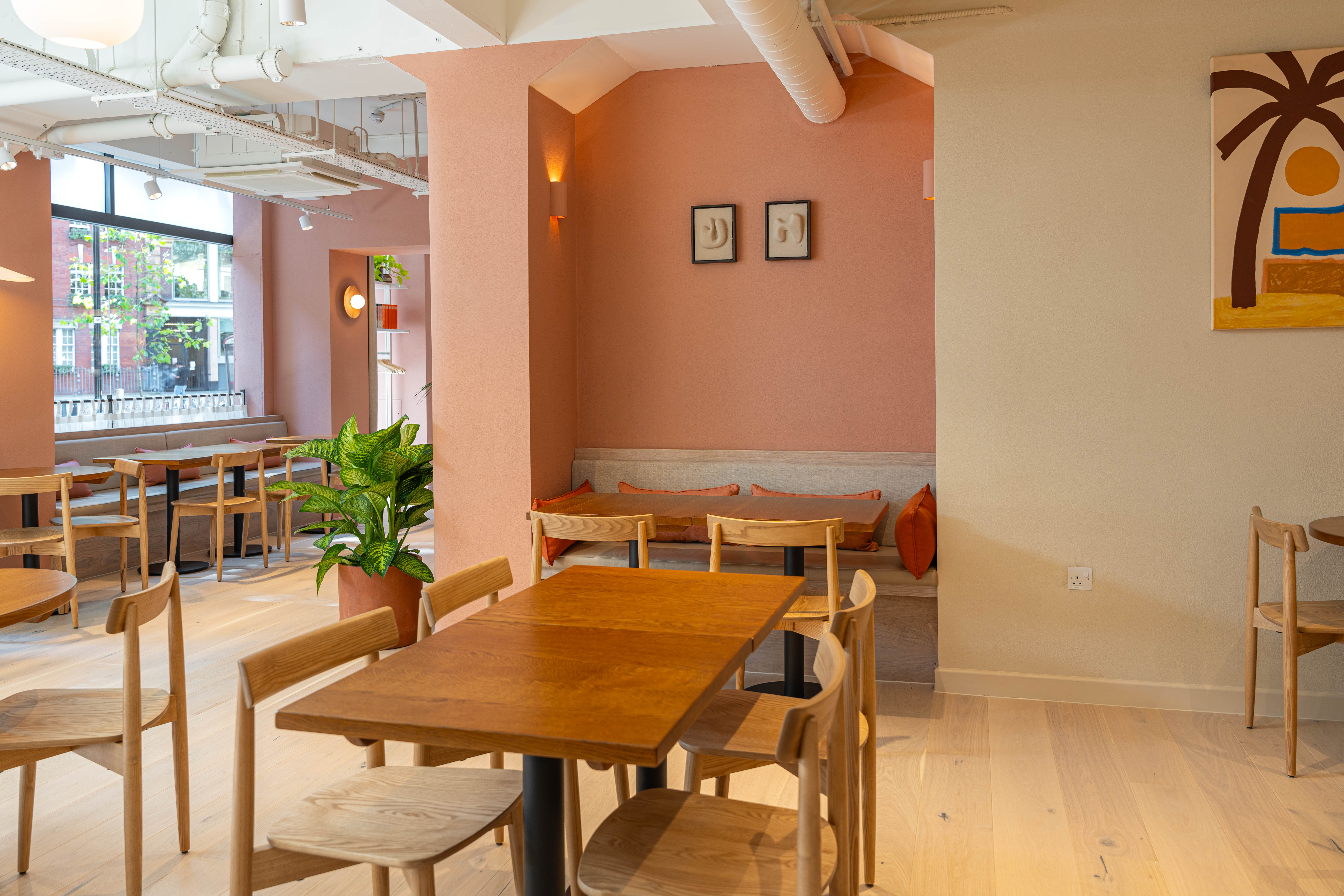 Scandinavian-inspired furniture has been paired with an earthy colour palette via terracotta walls and rustic brick tiles which line the counter - an ode to the colours of the Middle East. Havwoods Alsace Character 207mm 1-strip boards from the Pureplank collection were specified for the project due to their bright colourway and engineered construction. A necessity for commercial spaces with high footfall, the structure of the planks is incredibily durable, hardwearing and easy to clean thanks to its 3-layered design.