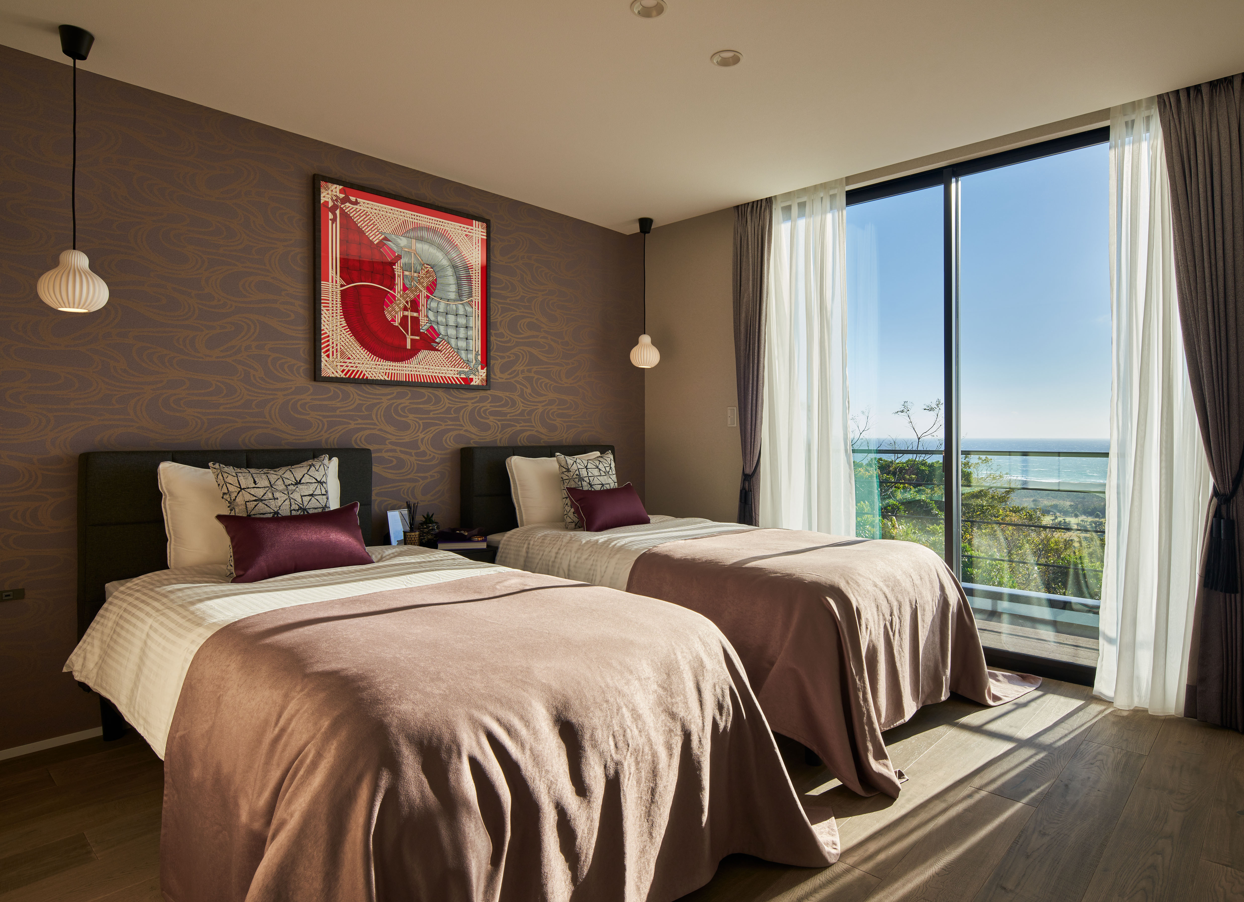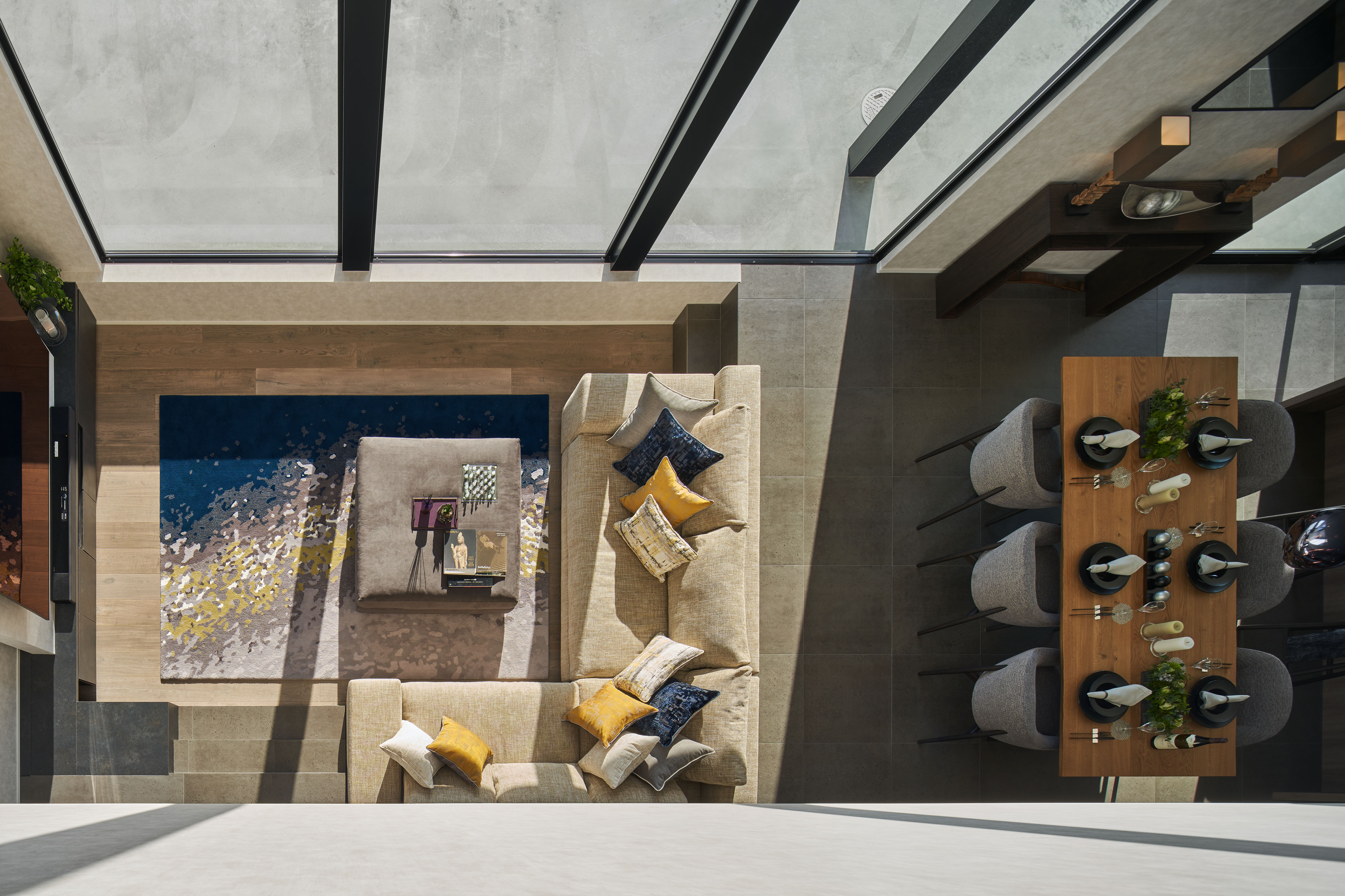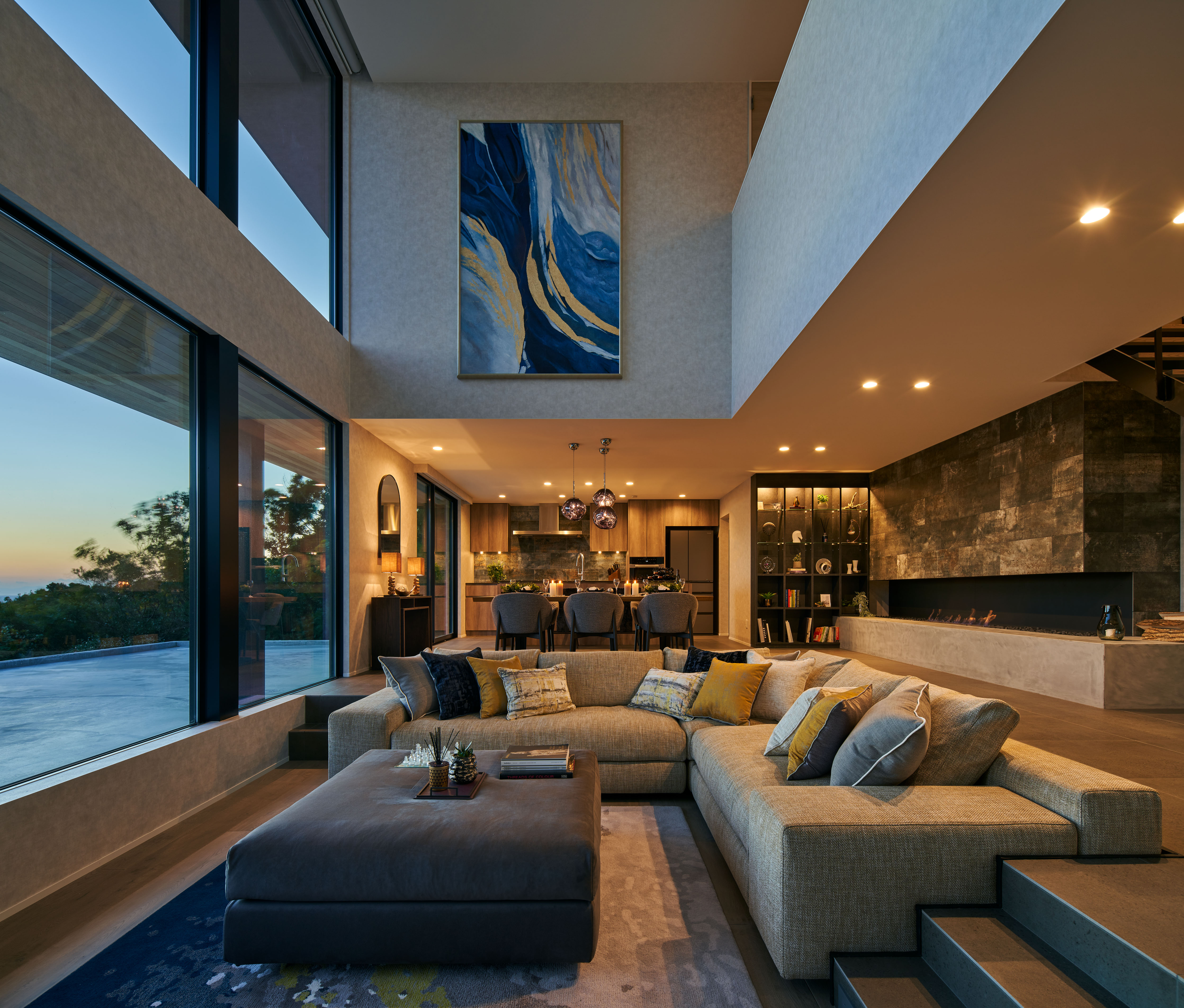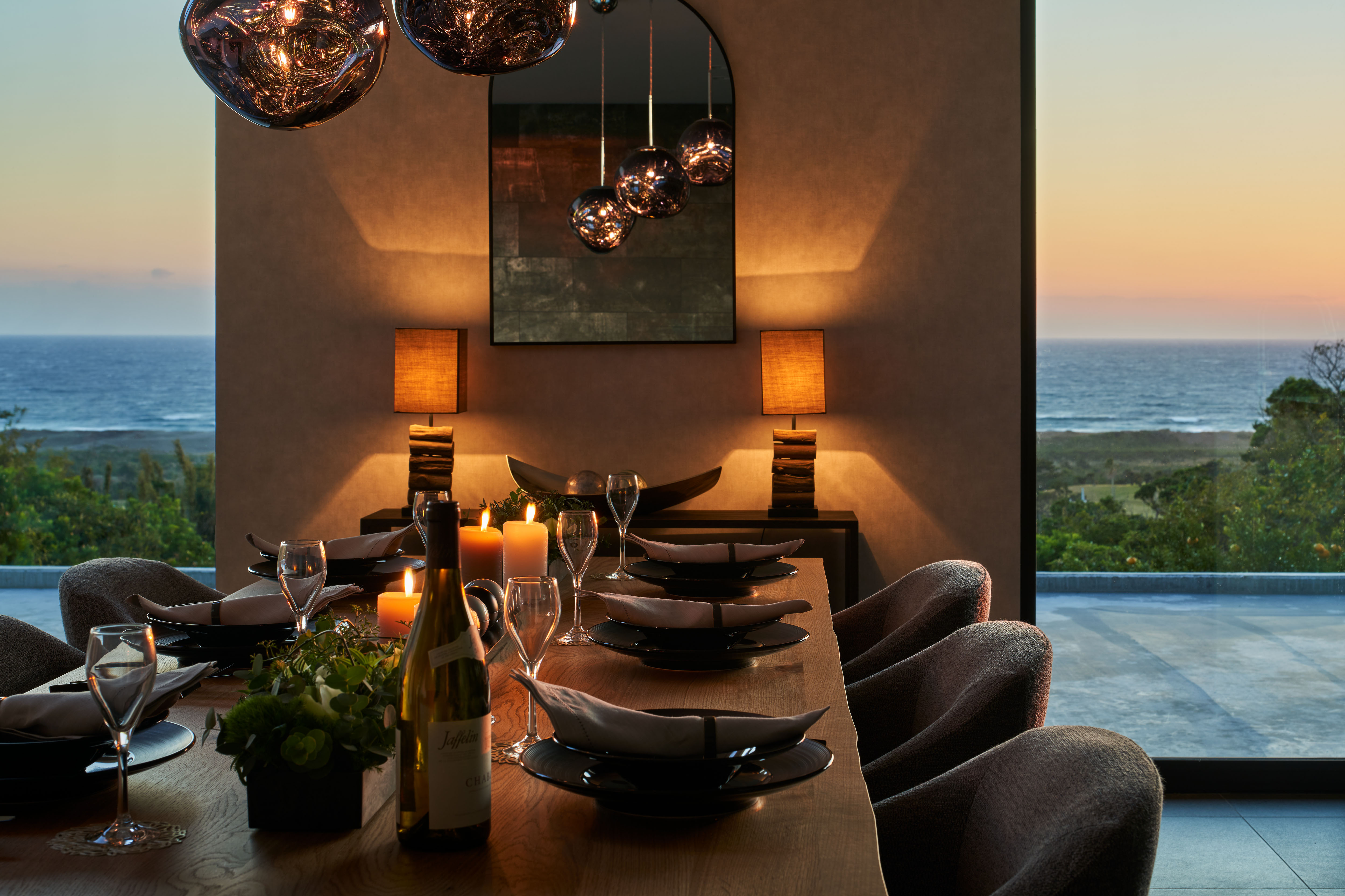 The dramatic double-height living space is the fulcrum to the open plan layout. The sunken seating area creates a focus on the spectacular views of the sea and feels like being wrapped in warmth and calmness. Bright and airy during the day; soft, subtle and warm at night with the cozy atmosphere created by the soft, discreet lighting and open fire.
