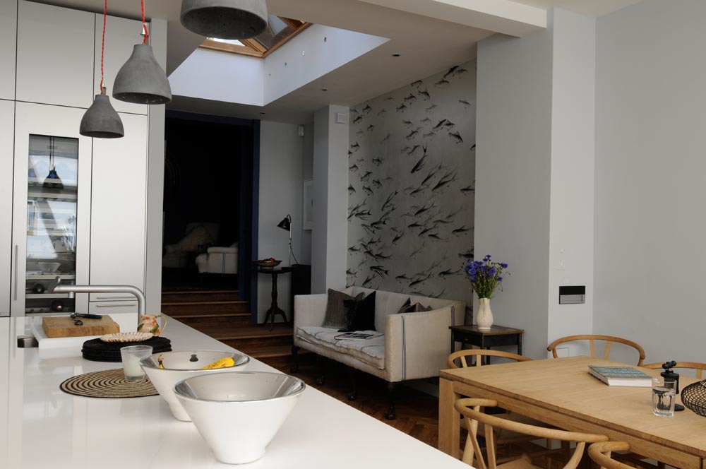 Bulthaup kitchen, concrete pendant lights and hand-painted Korean wallpaper on a silver background mixing a variety of beautiful mediums and textures. This led onto a small internal snug room that was painted in a gorgeous dark blue.