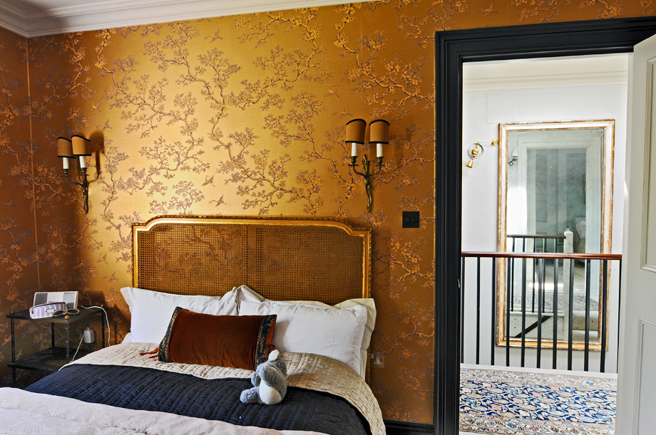 One of the bedrooms had a gold background, Florence Broadhurst wallpaper from Australia and black Japanese aesthetic movement furniture.