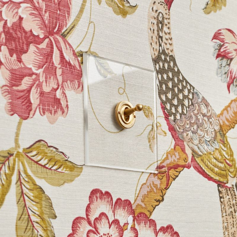 Switches and dimmers have a 3mm bevelled transparent Perspex plate which is secured without the use of fixing screws. The plates are flush-to-the-wall and are supplied with brass, nickel silver, stainless steel, brushed brass or antique bronze dolly (toggle) switches, dimmer knobs or buttons.