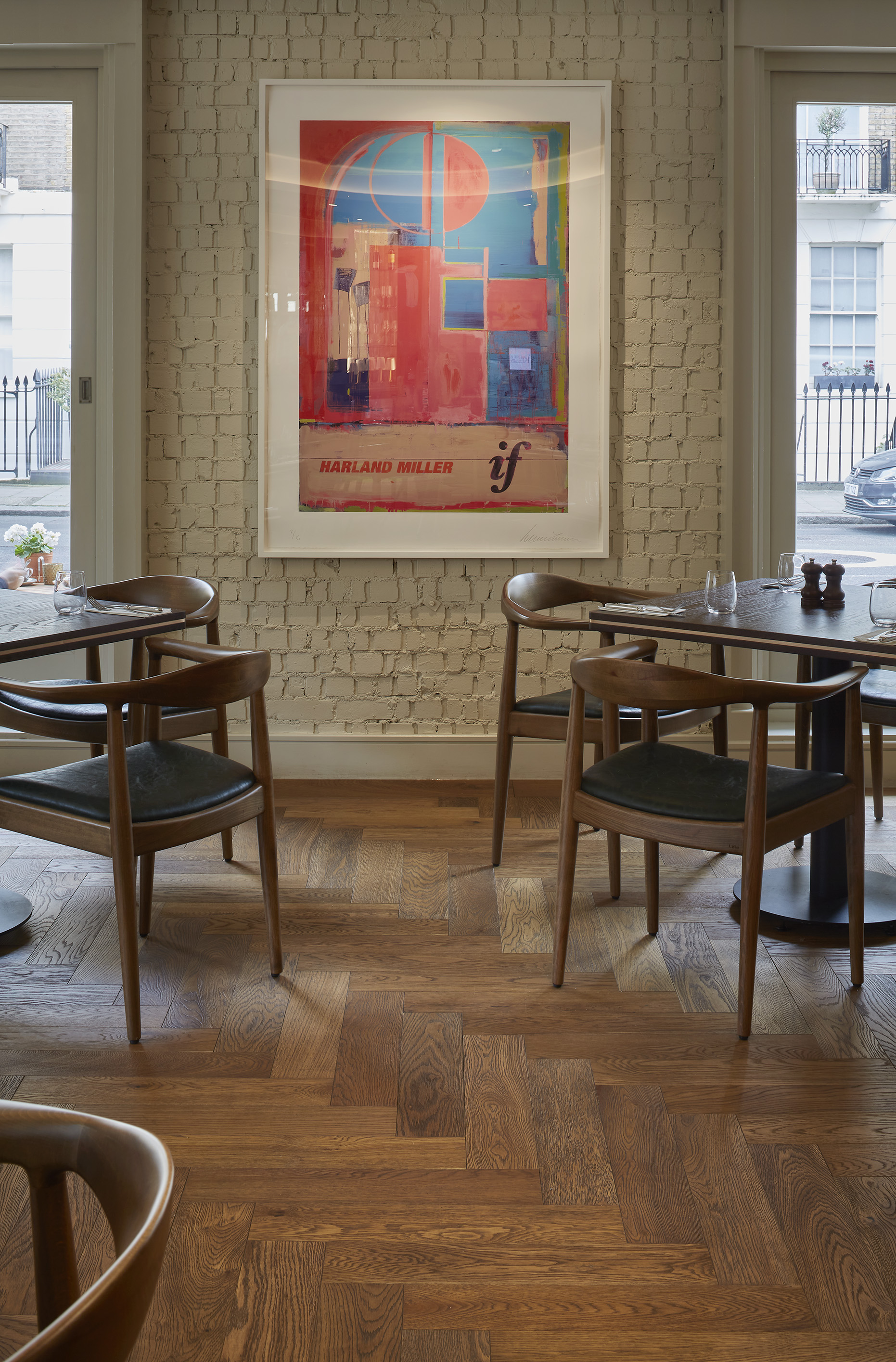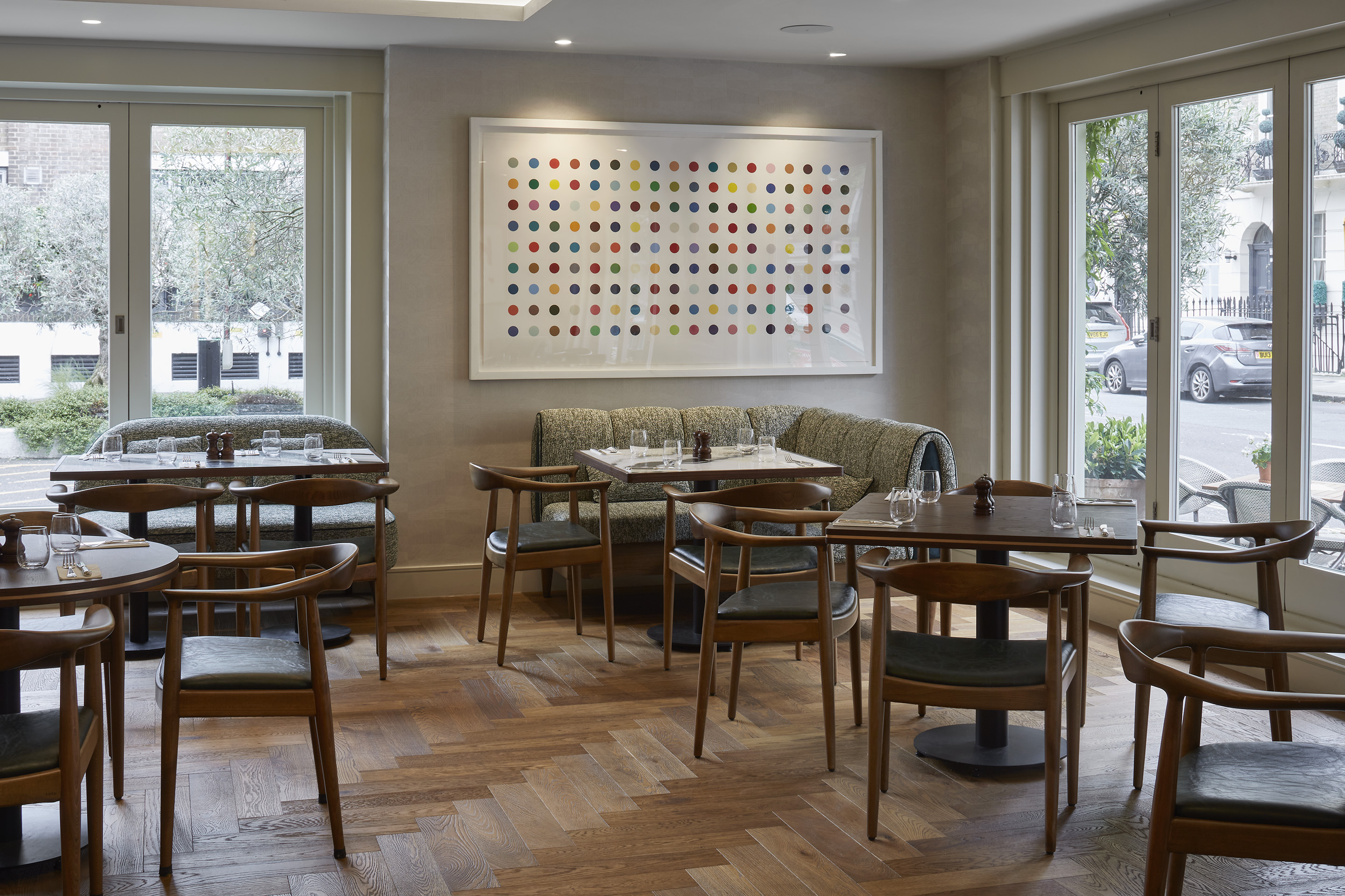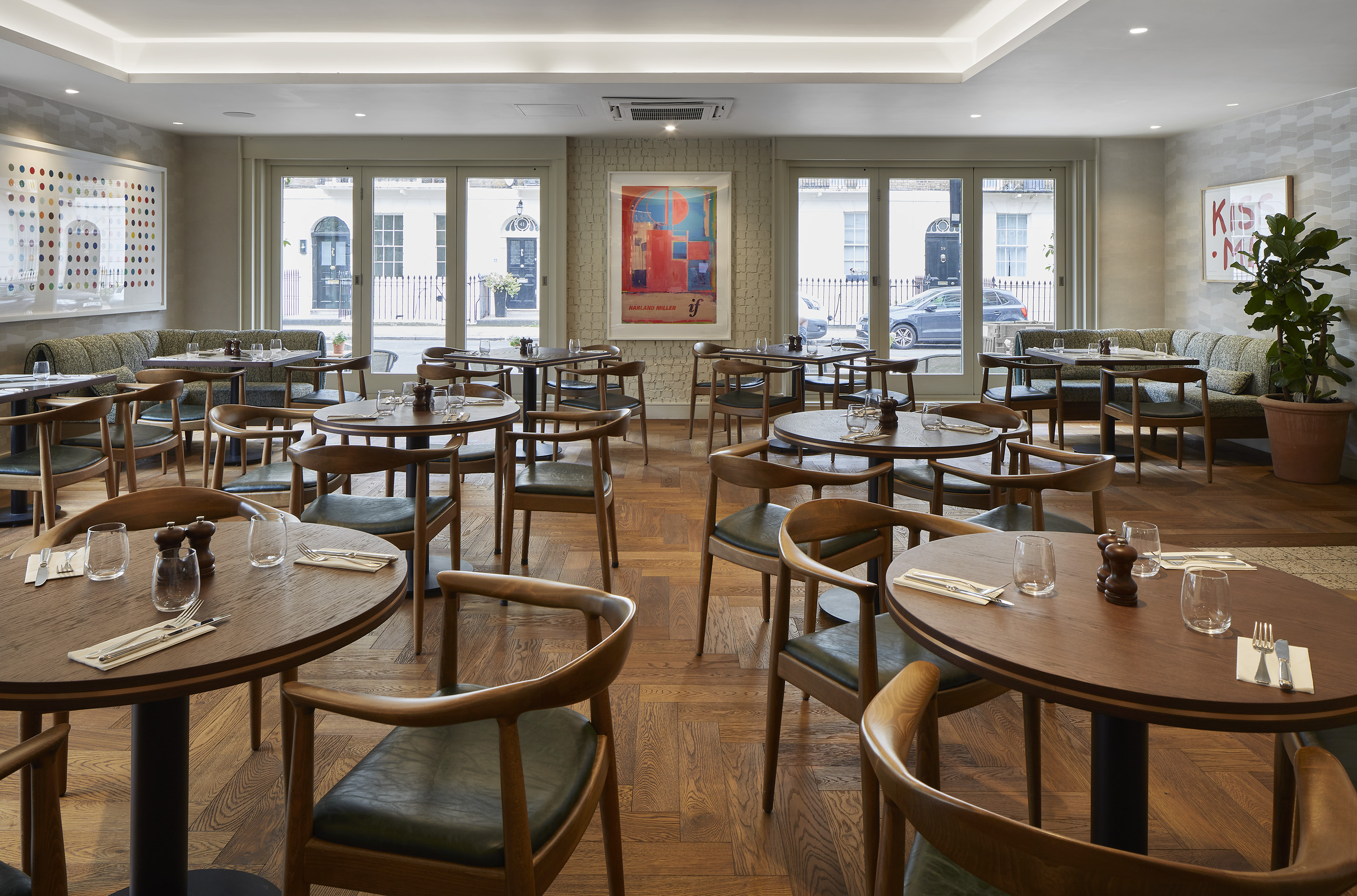 The designers focused on mid-century detailing with the dark walnut tables and chairs, set alongside colourful artwork, tactile fabrics via the built-in banquette sofas and natural finishes - including flooring from Havwoods.