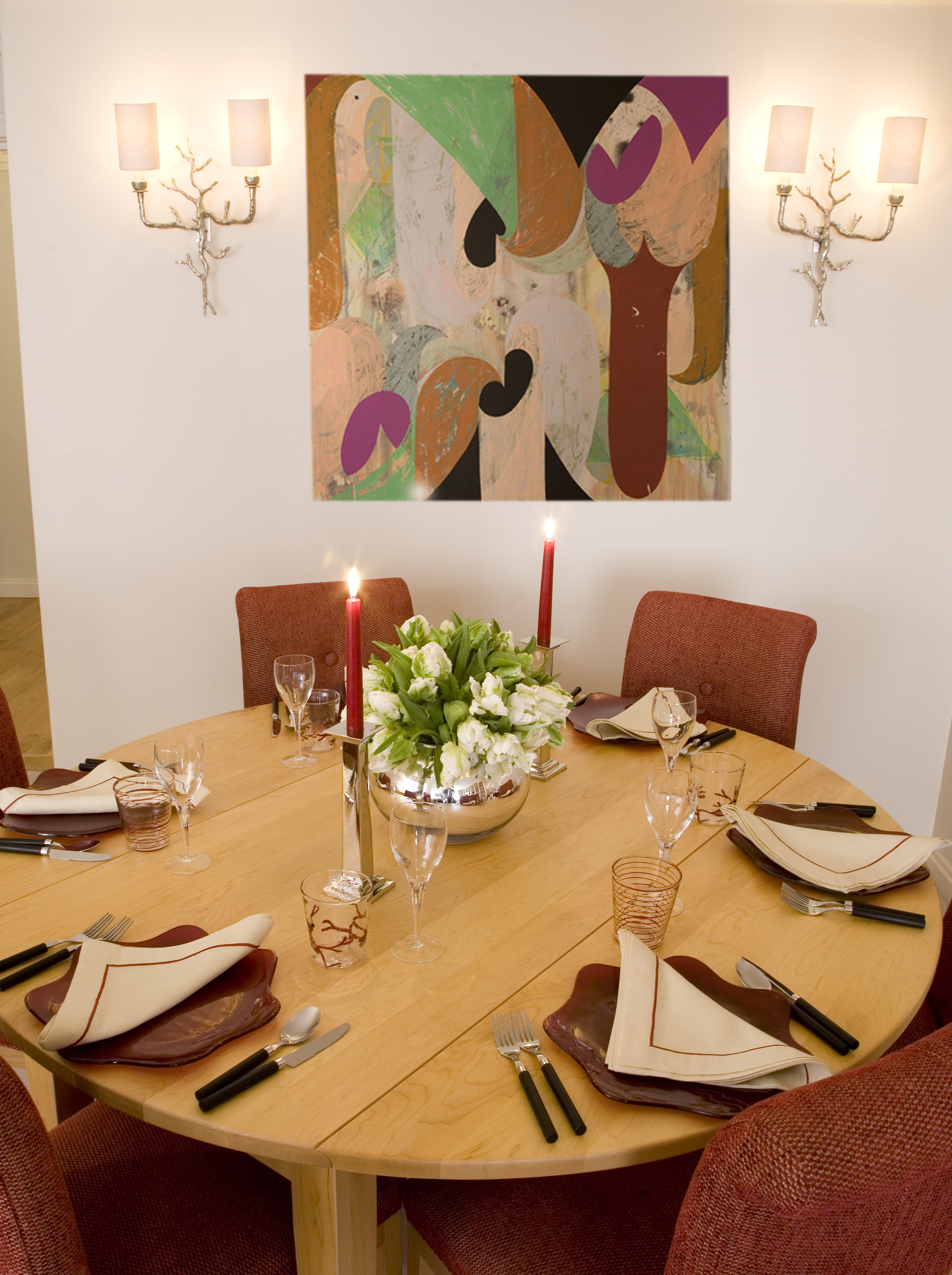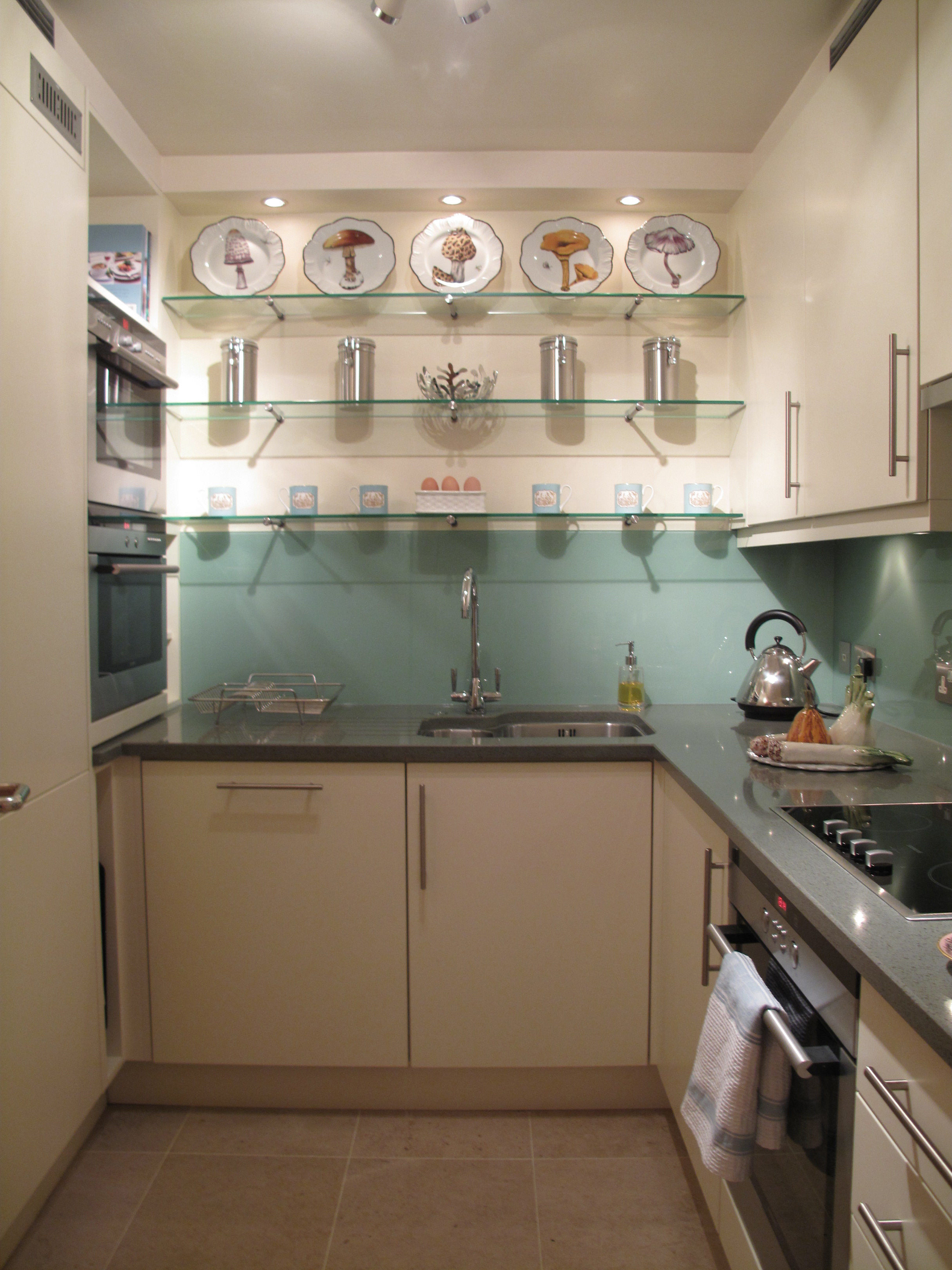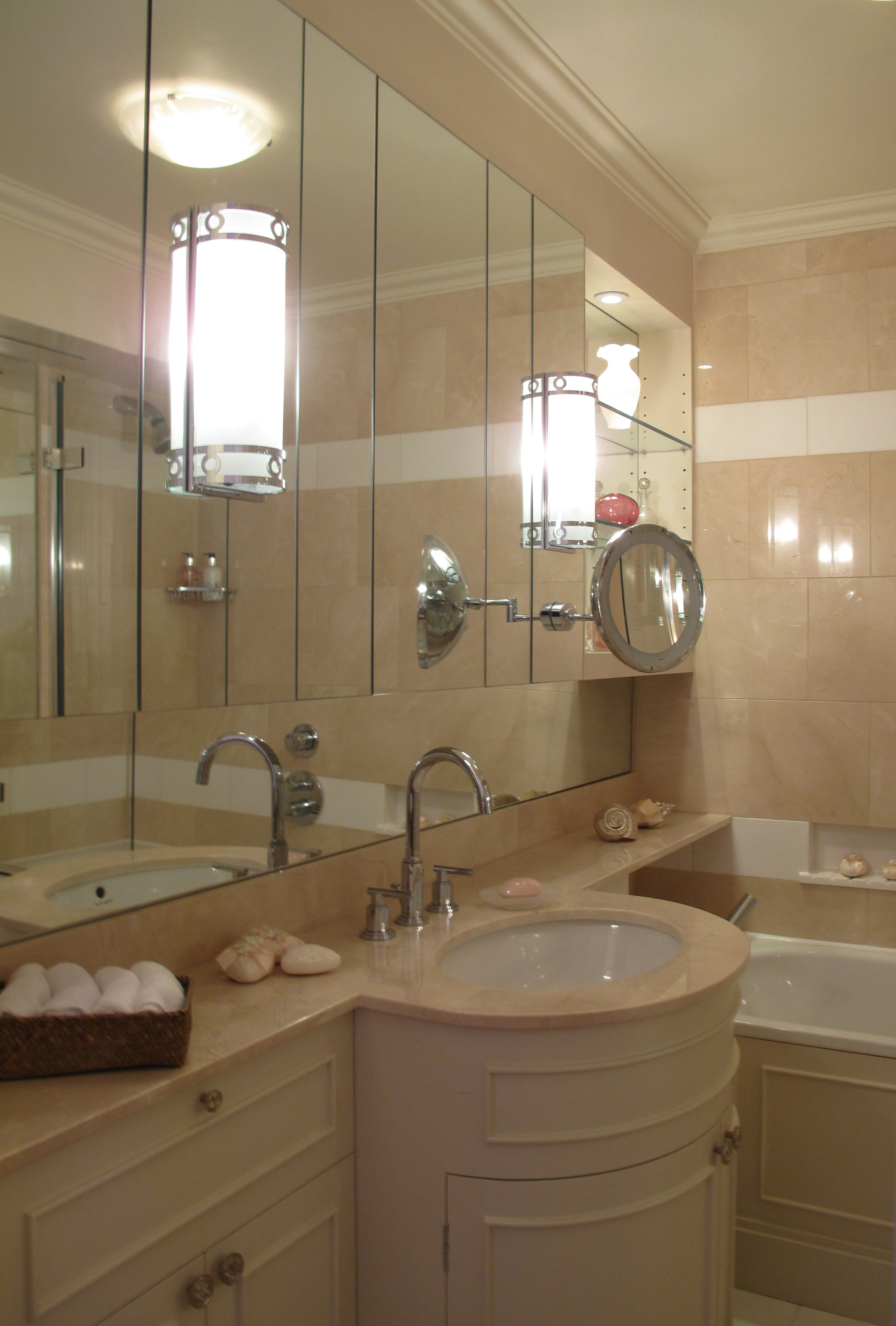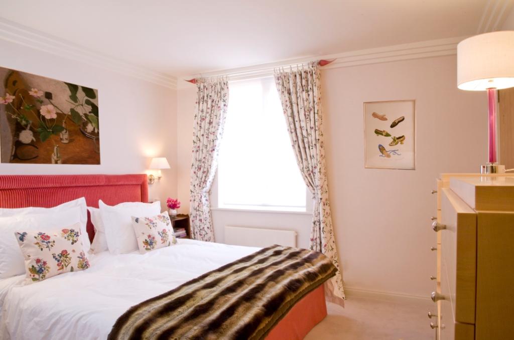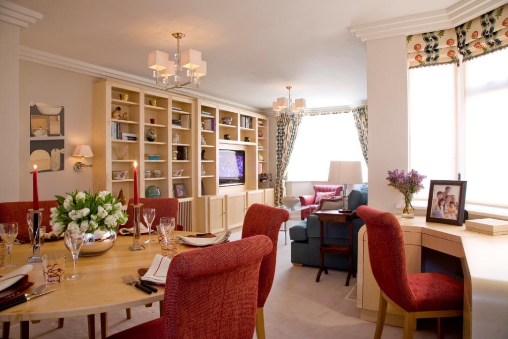 Meltons was asked by their clients to transform a rather dull flat - situated in a prime location - into a comfortable and attractive pied a terre, where they could stay with their children, during their visits to London. The flat was completely stripped out, but no structural alterations were necessary. A small bathroom was turned into a shower room for the children, with translucent blue float glass providing a screen for the walk in shower, and included a twin basin vanity unit, with storage above concealed behind mirrors. Utilitarian slatted blinds were removed throughout the flat, and in their place curtains and Roman blinds were made up using attractive fabrics and trimmings. The joinery was custom made to Meltons' specification, as was much of the furniture, including the desks, dining table and bedroom dressing table. The carpet in the Sitting Room was made especially for the room and has an ivory and taupe border carved into the pile. The girls' bedroom has a bunk bed, designed by Meltons, which is close covered in faux suede, and the large sofa in the Sitting Room turns into two single beds at night if required.