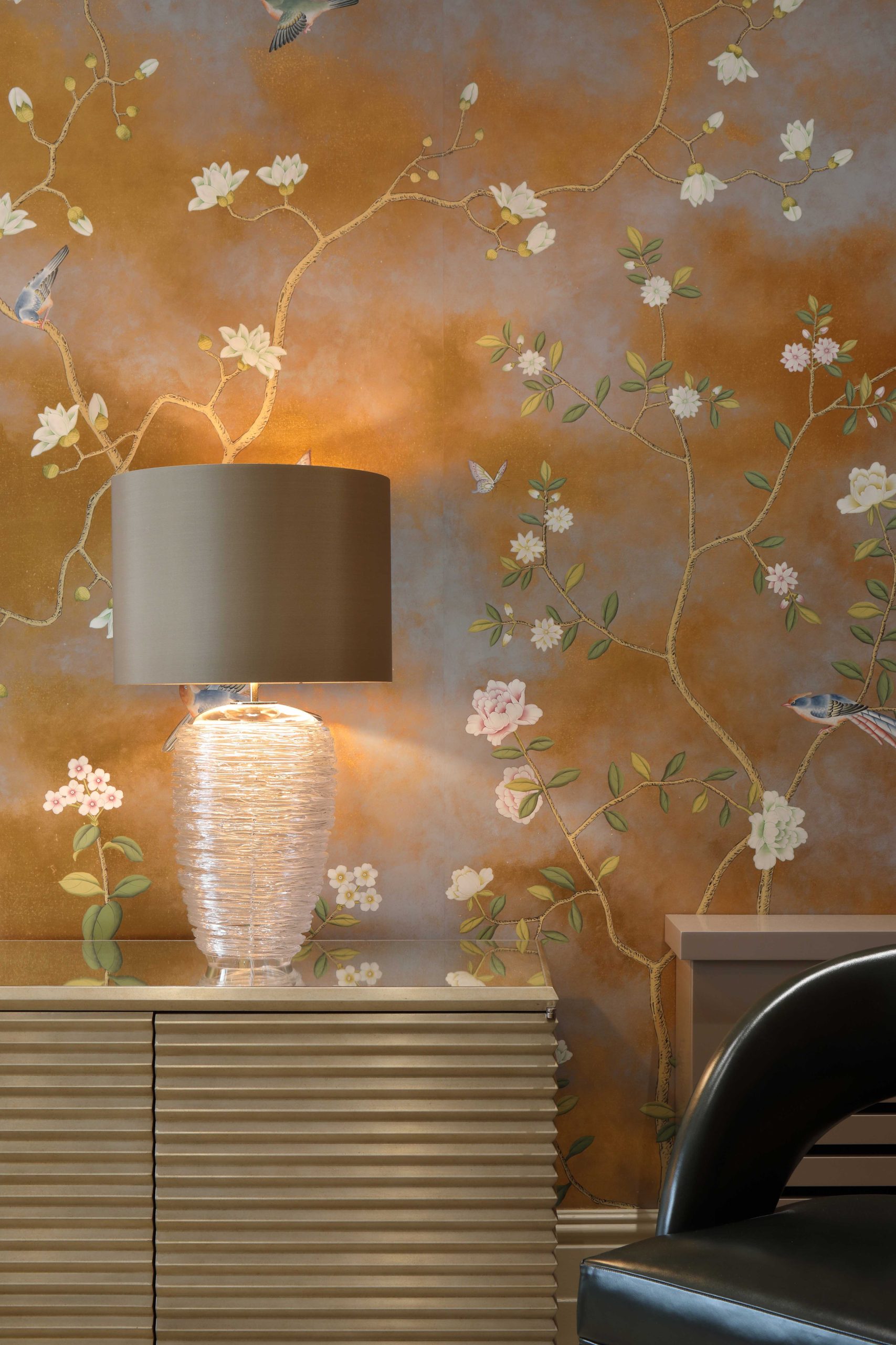 By introducing curved sofas, textural materials and a discreet touch of gold to the more formal reception room, we ensured that elegance did not forgo character. In the second reception room – intended as a more relaxed space – modular Italian sofas and club style leather bar stools in darker tones offer the space depth of mood while in the striking dining room an impactful Paola Navone dining table takes centre stage against walls clad in hand painted de Gournay papers.