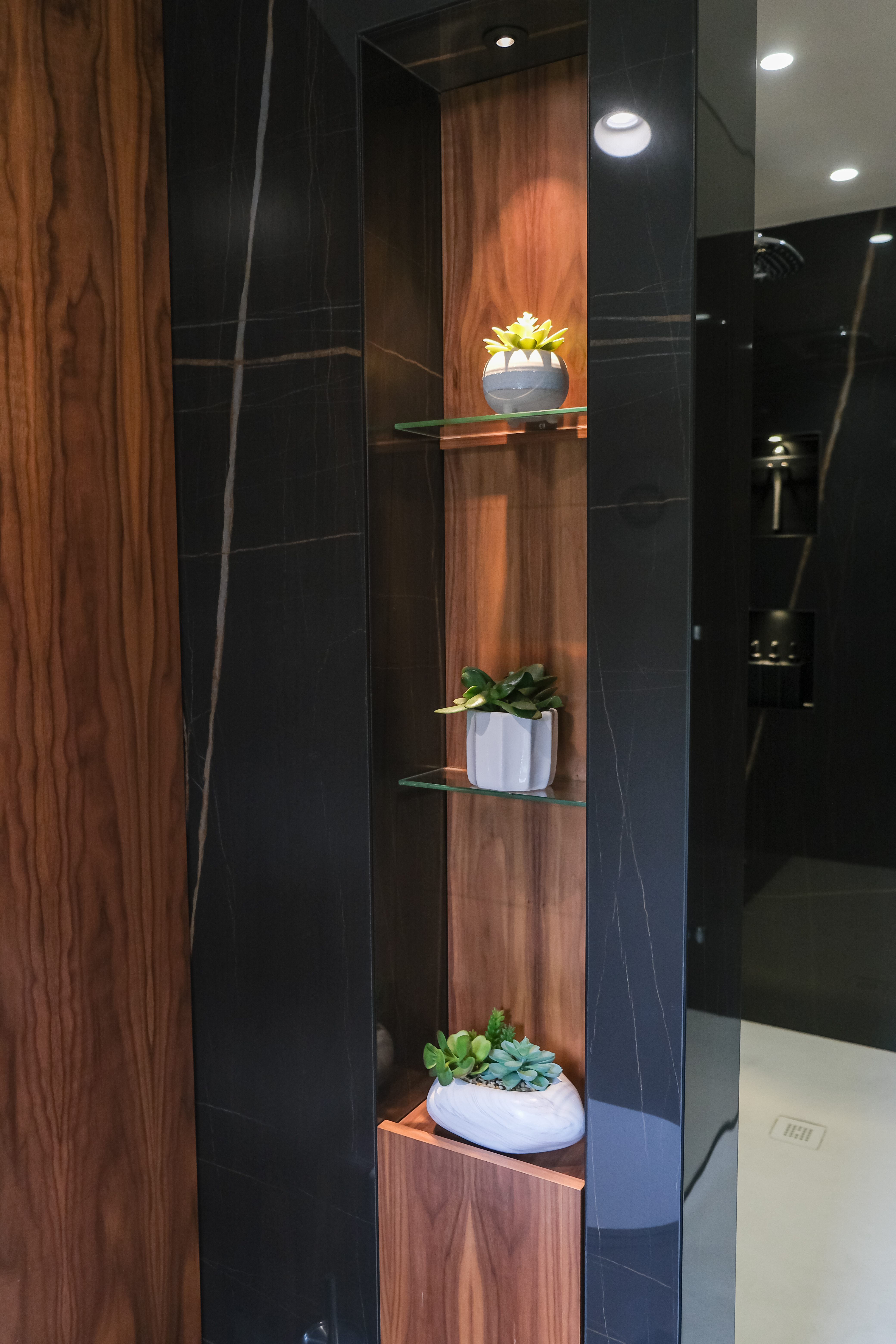 This contemporary space features extra-large black porcelain wall tiles, creating a striking contrast with the neutral tones of the porcelain floor tiles. Precision 45-degree angle cuts to ensure a flawless, sharp finish, enhancing the room’s sleek and polished appearance.
