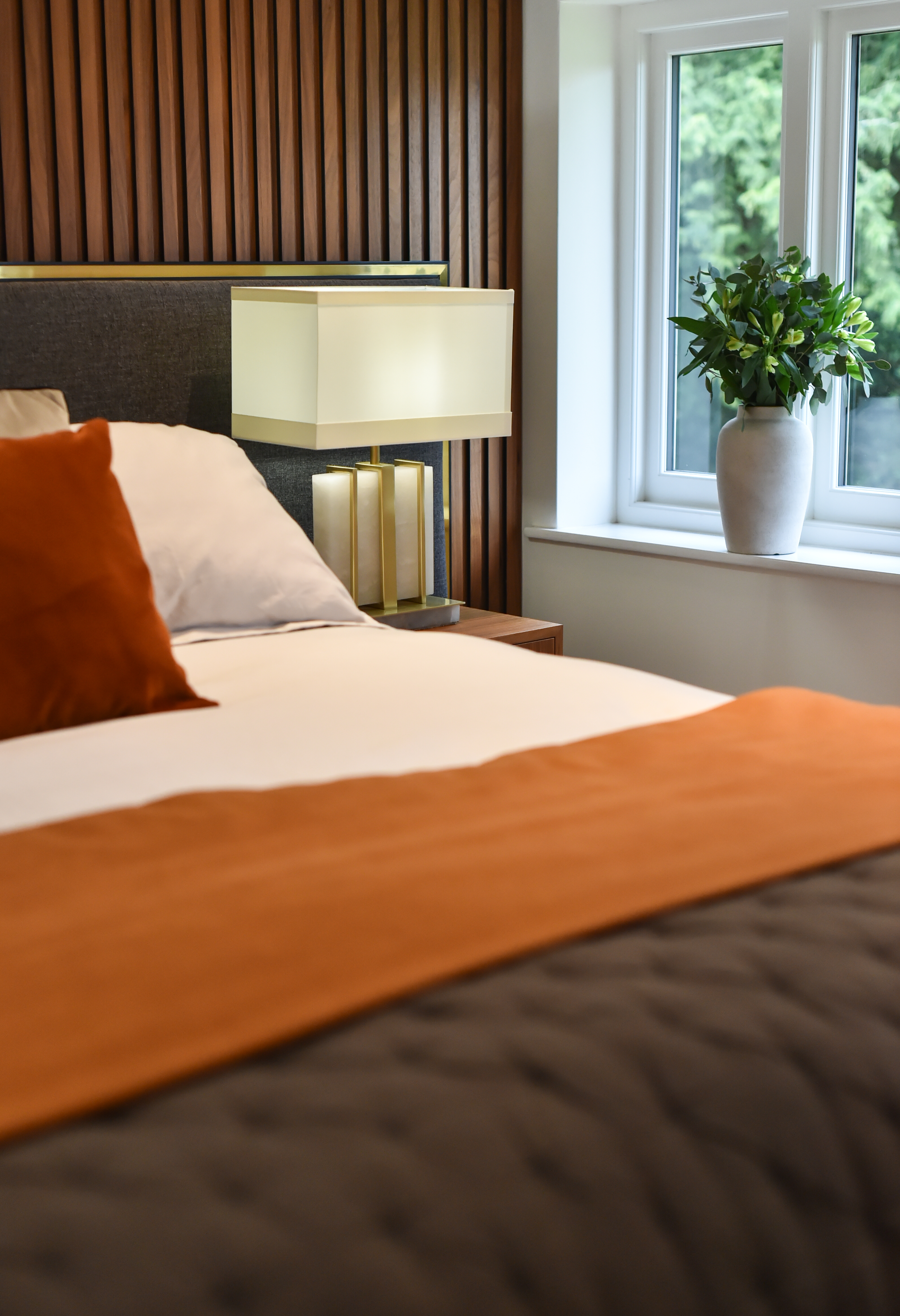 The centrepiece of this bedroom is a stunning slatted wall behind the upholstered headboard. With a finish in wood, this feature wall adds a contemporary touch while creating a cosy, inviting atmosphere. Its dual function is aesthetic and practical, providing a sophisticated backdrop for the wardrobes. The ceiling’s sloped angles presented a design challenge which we embraced using vertical slats on the wall and a lower-profile, along with a horizontal headboard to achieve visual balance and harmony in the space.