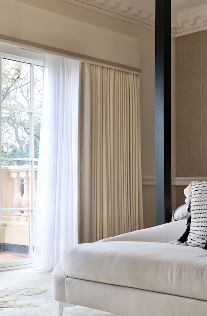Working with an interior designer we dressed the windows and doors that led out to the balcony from the master bedroom suite. We layered with motorised blinds, voiles and a luxurious double pinch pleat curtain made from 100% lambswool satin. The curtains and pelmet were both edged with a beautiful metallic braid.