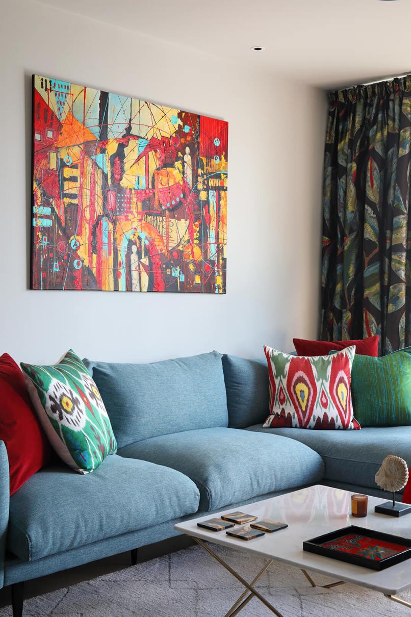 Our client wanted to take his blank canvas of a flat and turn it into a colourful and welcoming home. What was a sad, unloved space prior to him taking ownership is now a joyful, colour-filled space that packs a punch from the moment you walk through the front door.