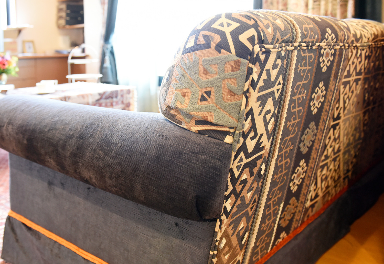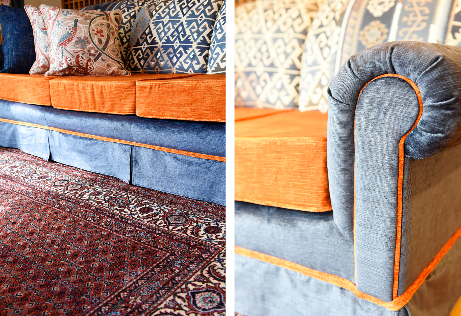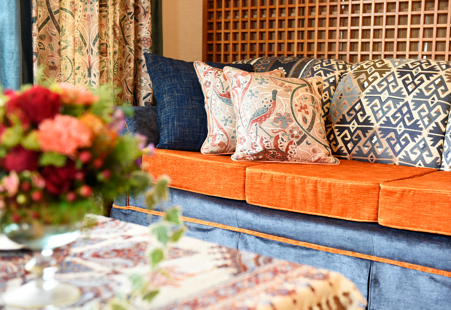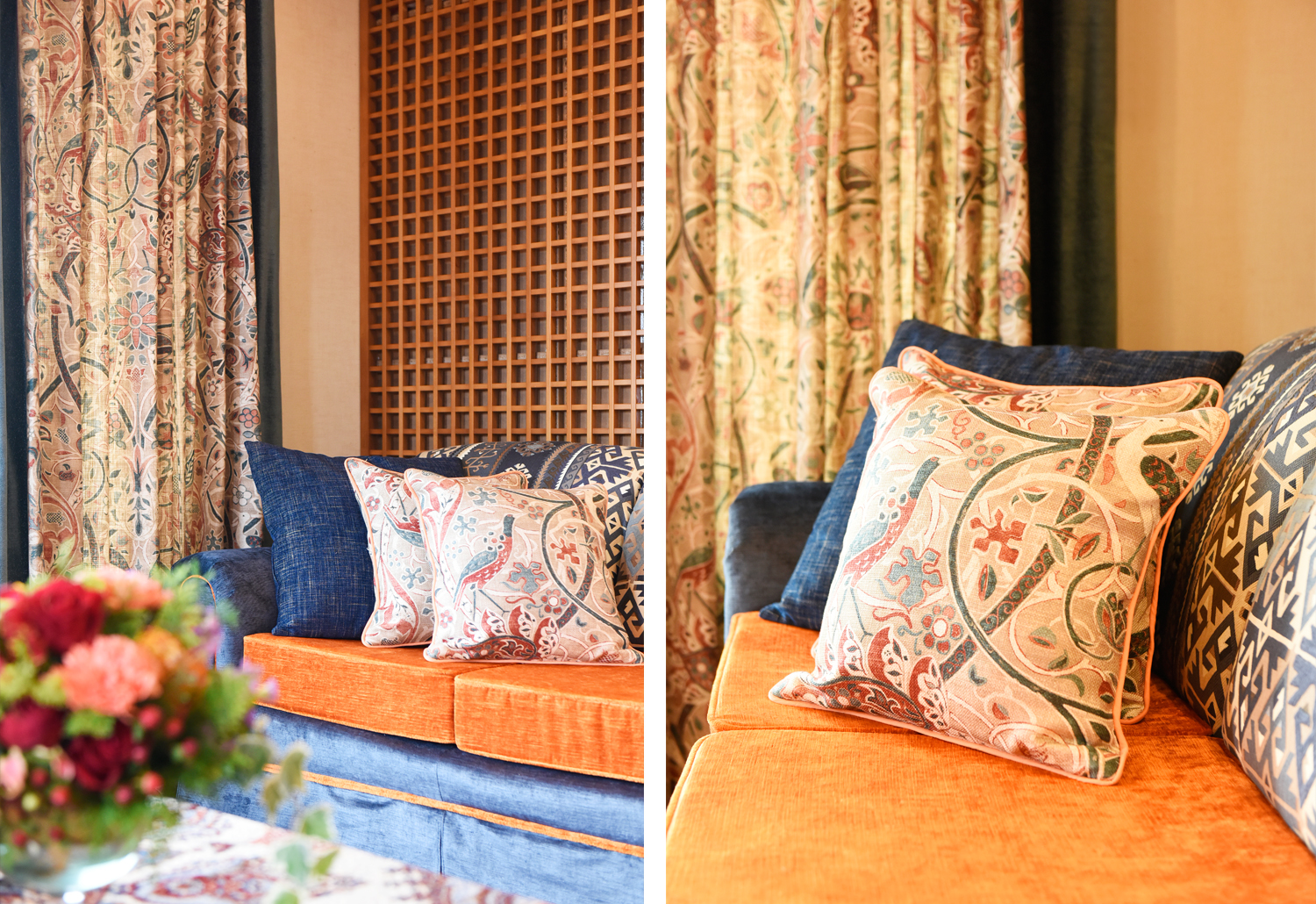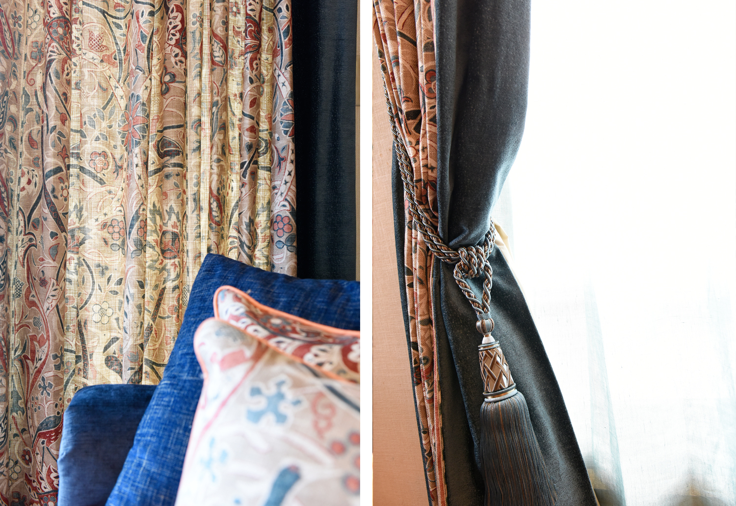 To support and extend these colours, curtains using William Morris fabrics were introduced, incorporating bold blue stripes that echo the rug’s pattern. Natural materials such as linen and rayon add softness and depth, while darker border details help define the composition of the space.