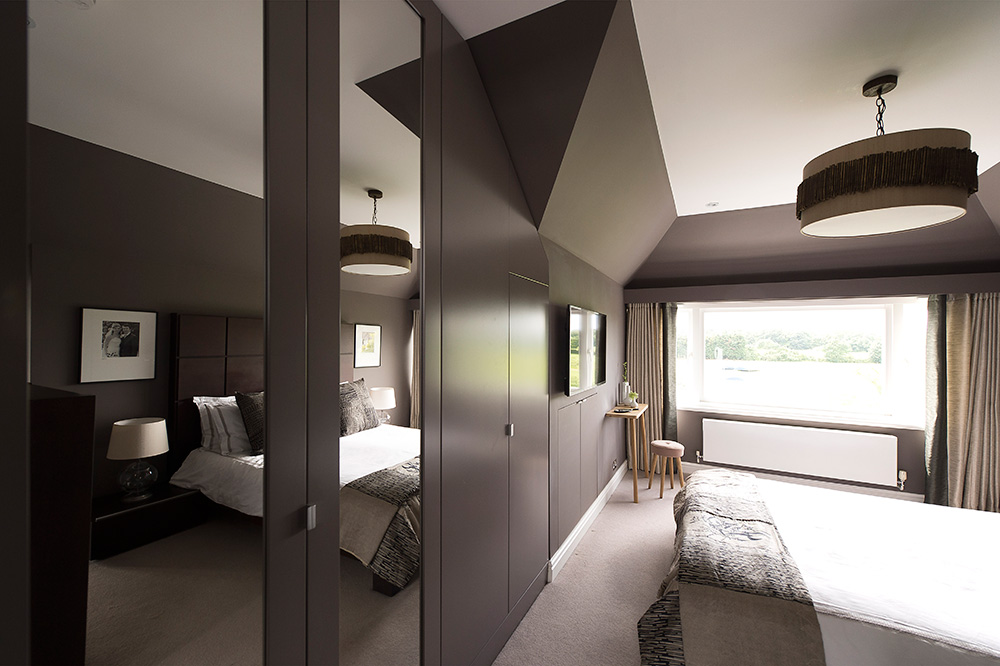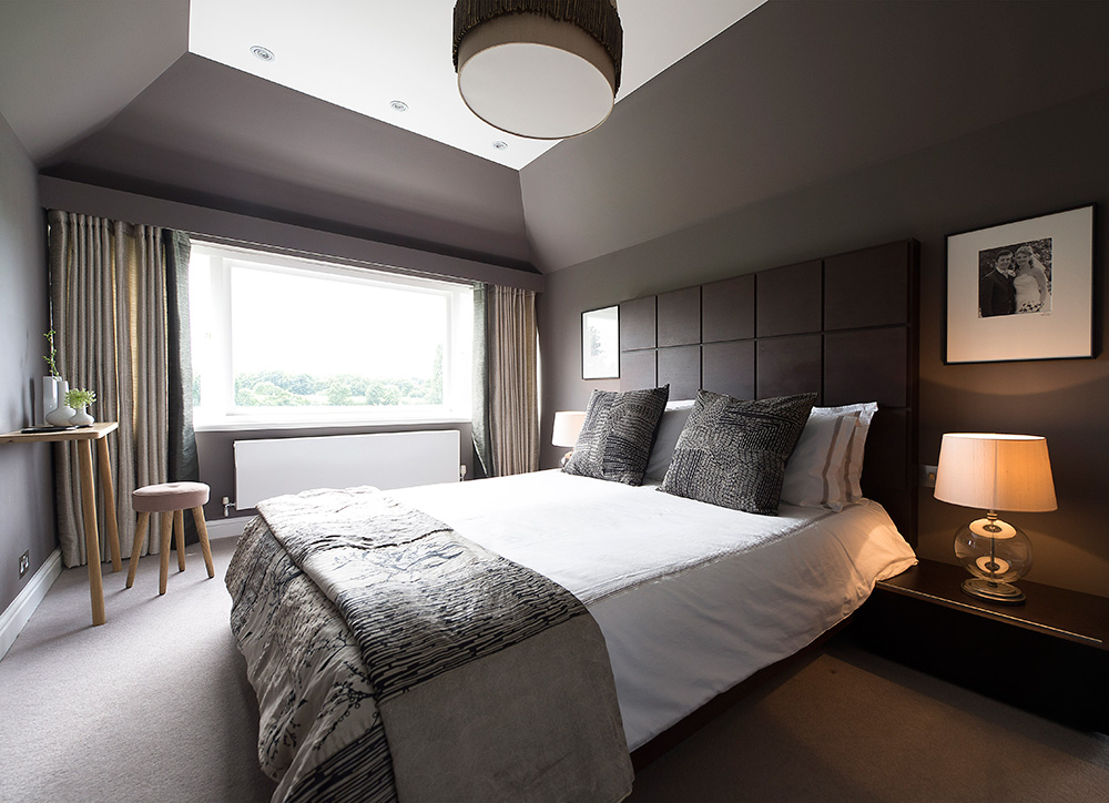 We introduced confident chocolatey dark walls taking it up past the slopes of the ceiling instantly giving height to the space and framing the stunning view from the window. Full length curtains, with a painted pelmet to hide the track, dressed the window adding texture and layers.
