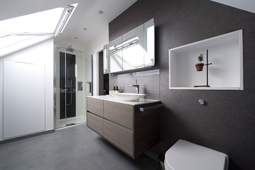 The basin is the feature of the en-suite with a bespoke organic shaped basin on a bed of white Corian designed to give a seamless and contemporary design. The textured wooden vanity unit works tonally with the dark wallpaper behind making the white basin pop. A recess above the WC was wrapped in Corian to create a space to display decorative objects to give the bathroom that personal touch. We designed this loft space beautifully with purpose in mind and to make the everyday that little bit easier. We hope the clients enjoy living in this loft as much as we enjoyed designing it.