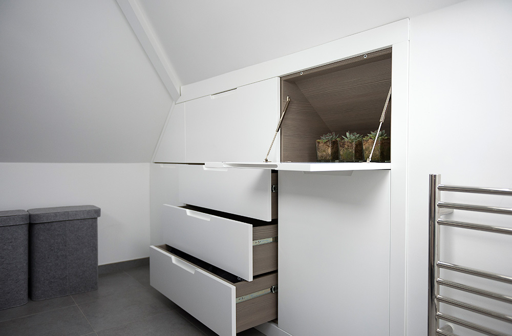 A loft en-suite brings many challenging spaces. In this project, it was important to reflect the look and feel of the Master bedroom and to create a clever storage solution to maximize the space as much as possible in the en-suite. We designed a fold-down fronted storage solution and a clever pullout draw system for shoes. Inside the drawers is a lovely wood grain detail and the outside of the storage was sprayed white in a water-resistant paint finish to match the room, making the storage look invisible.