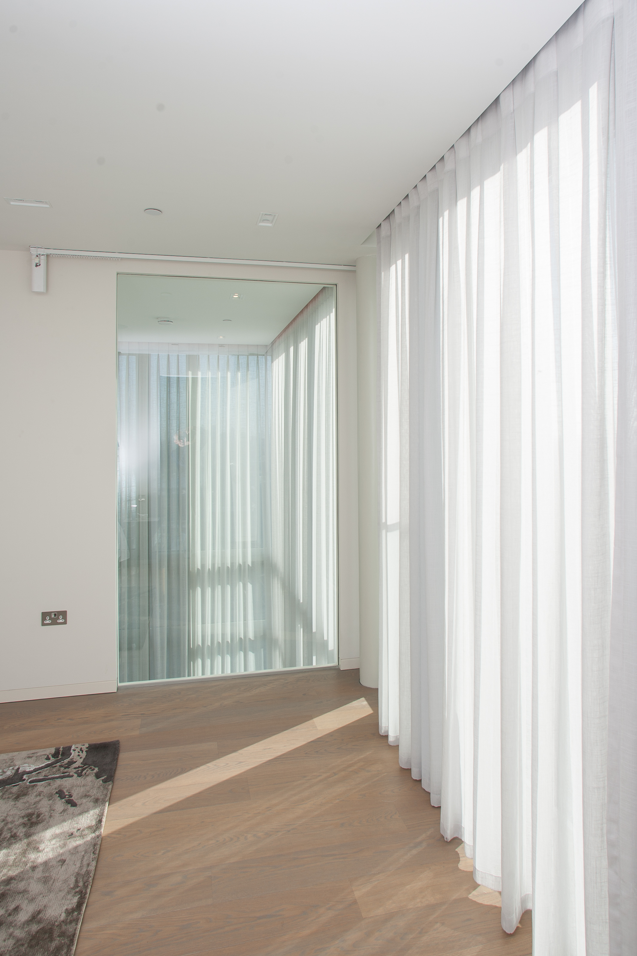 Brief: The double height windows needed voiles to filter the strong sunlight and the large expanses of glazing in the bedroom needed blackout projection. The client wanted curtains to soften the strong architectural space of the duplex flat without losing the view over the Thames and St Paul's Cathedral.