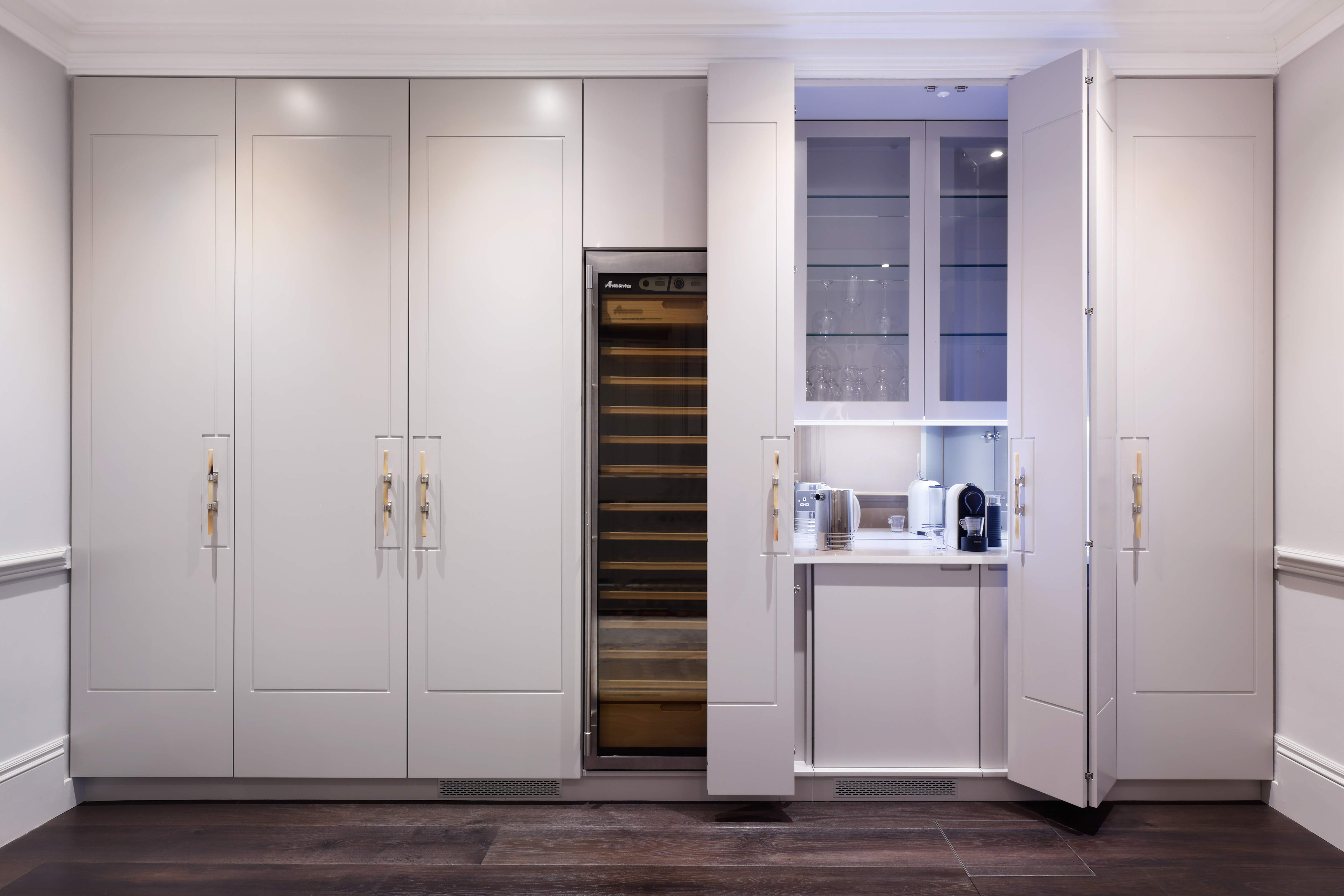 In the hallway leading in to the media room custom cabinetry included a simple detail to frame the handles and a concealed coffee making area.