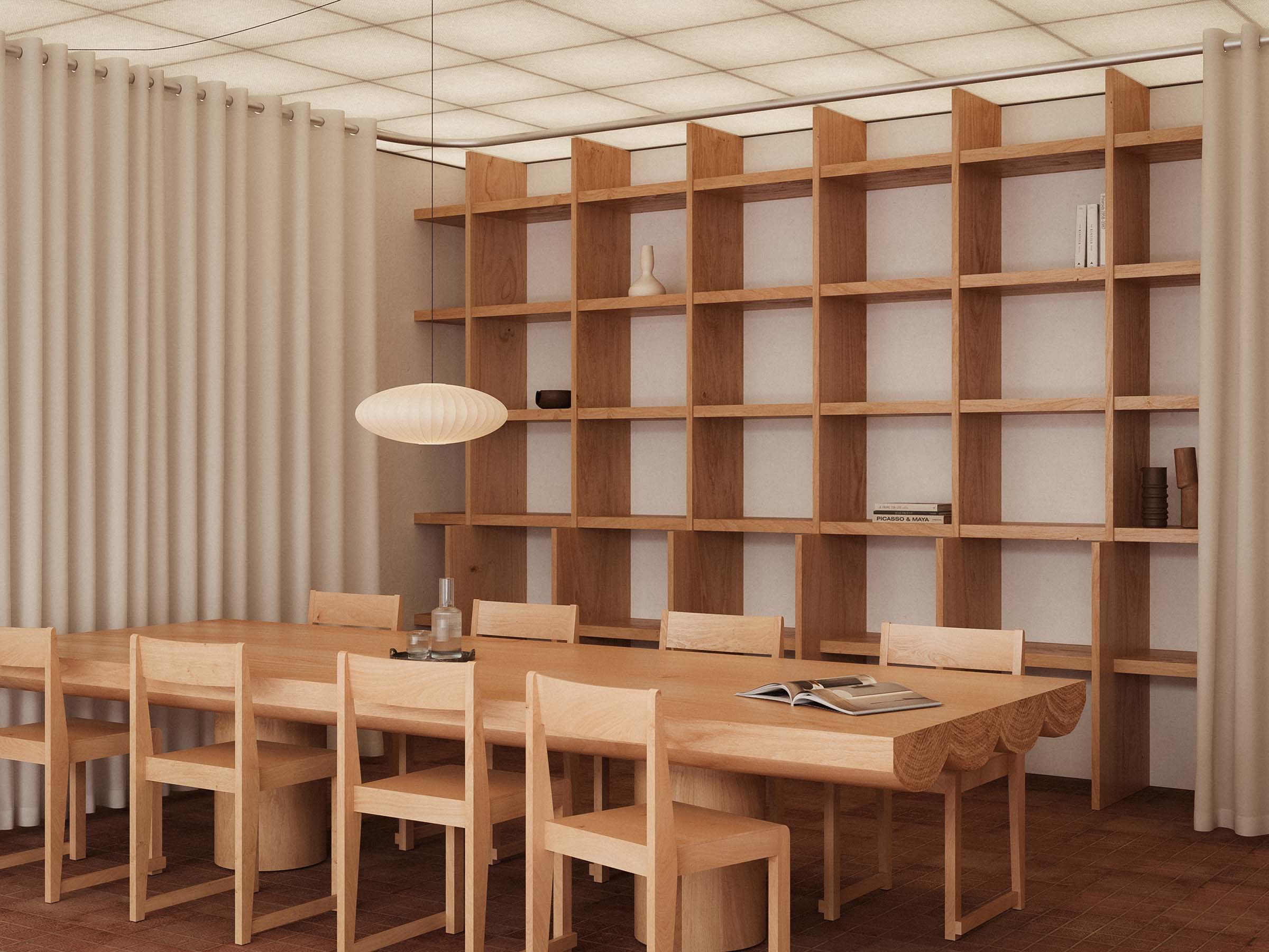 The showroom entrance becomes a space for a traditional tea ceremony welcome, with carved solid timber joinery and a kauri log as a focal element. Wide plank boards and a solid log table and island unit continue the theme in the office, display and demonstration spaces, creating a tactile and robust setting for events and appliance demonstrations.