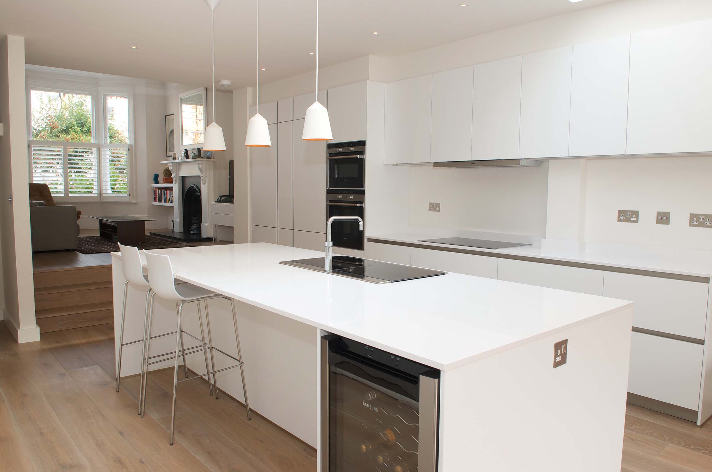 Designing a whole house refurbishment of a Victorian terrace included creating an open plan living space with a new German kitchen and extension on to garden on the ground floor. Additional storage, utility and cloakroom were cleverly concealed to one side. On the upper floors are 2 new bathrooms. To the top floor a loft extension with walk in dressing room with bespoke joinery and en suite marble shower room was created.