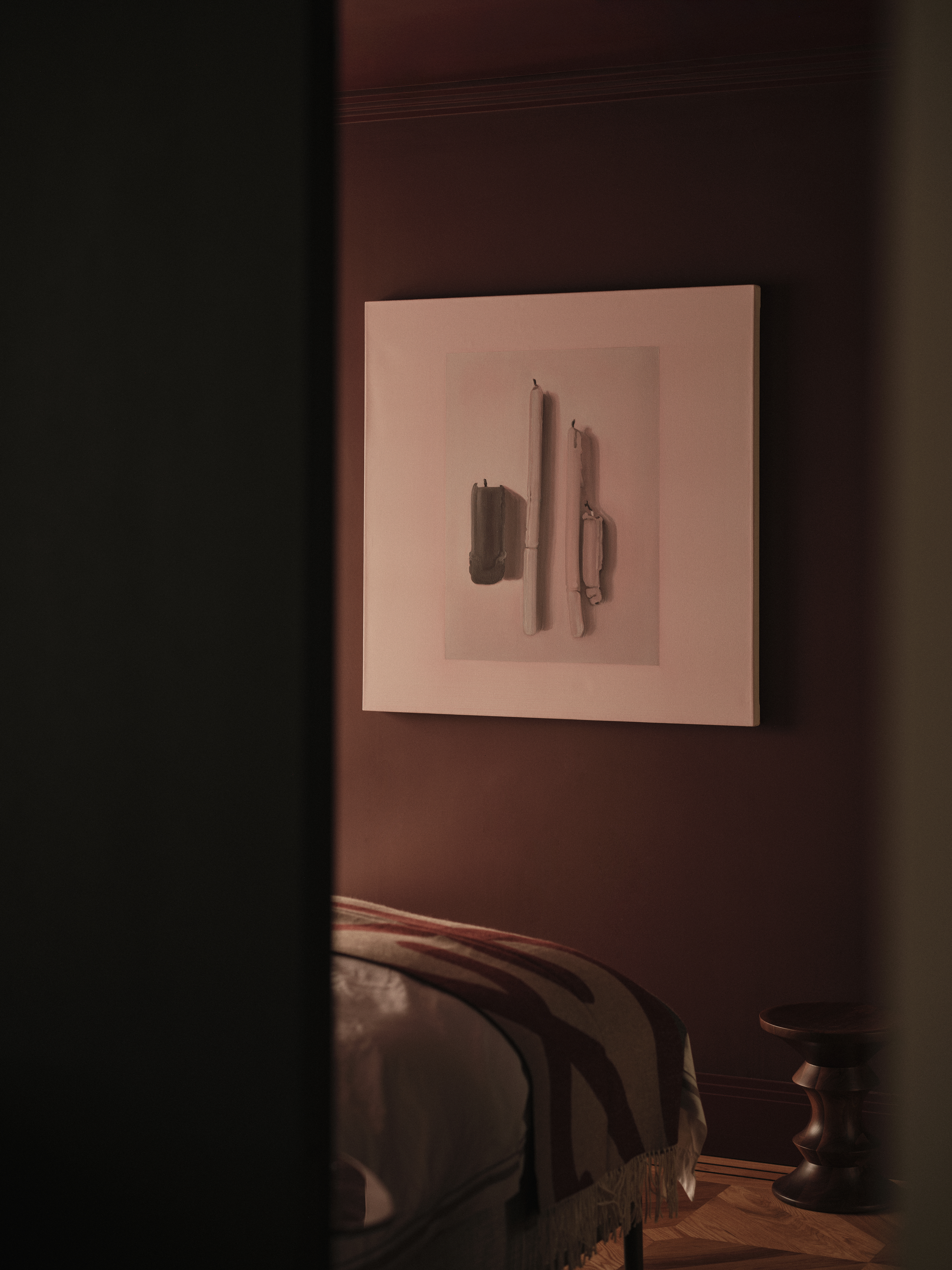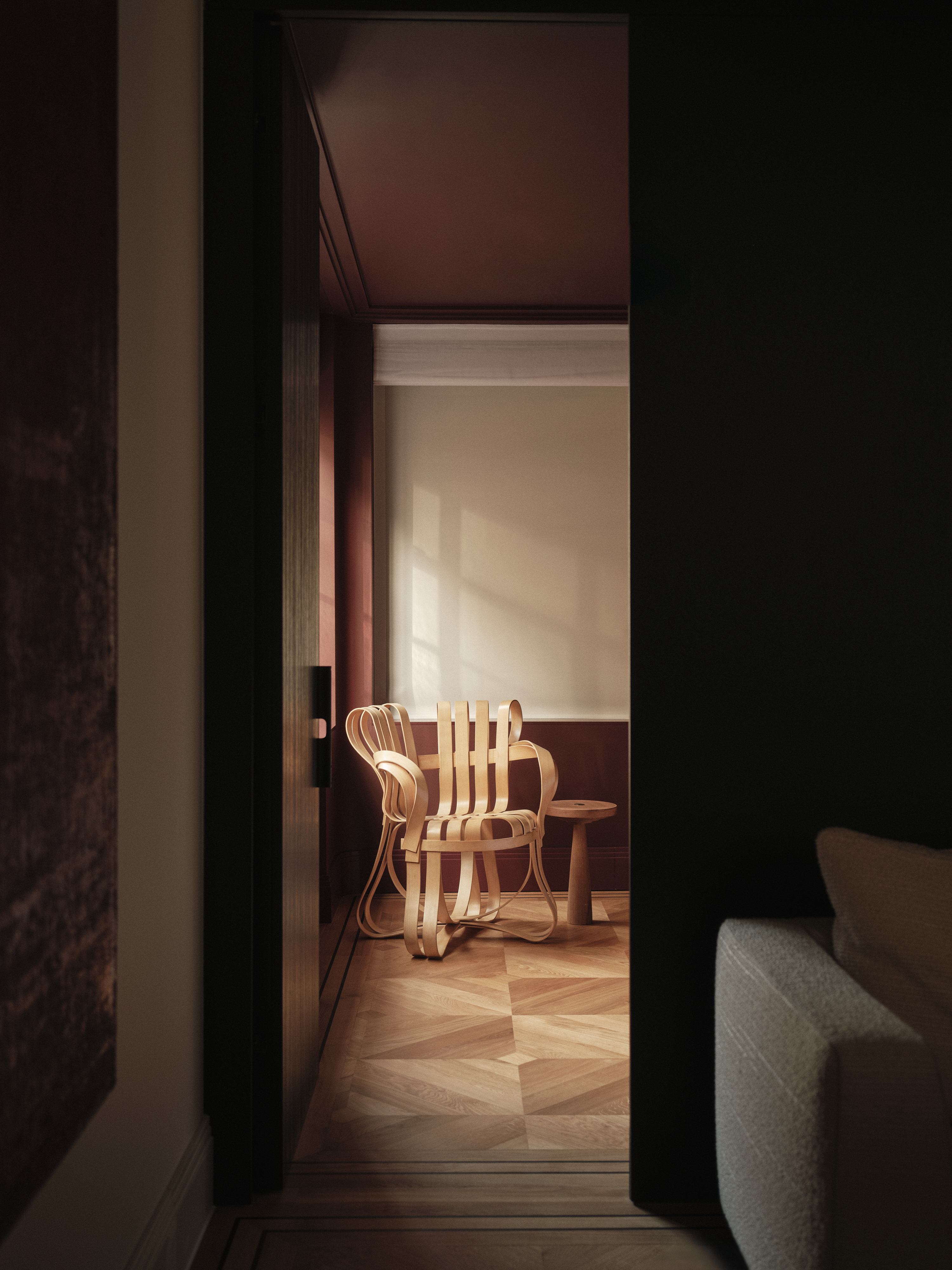 The result is a highly efficient yet visually striking layout, where the rooms function independently while maintaining a cohesive connection. Expansive wooden surfaces and a refined material palette enhance the apartment’s sense of warmth and sophistication. Upon entering, a dramatic hallway in deep, elegant tones contrasts the bright, open kitchen and living spaces beyond.