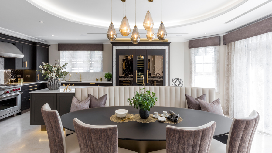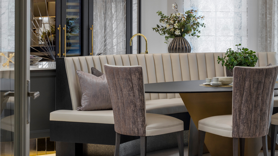 The kitchen is designed to merge elegance and family life. The bespoke banquette seating is integrated into the island, maximising space and creating an ergonomic flow to enter the garden or adjoining formal dining room. Our clients can relax and enjoy breakfast together in this comfortable, cosy, and family-friendly space or watch over their daughter doing her homework while preparing meals.