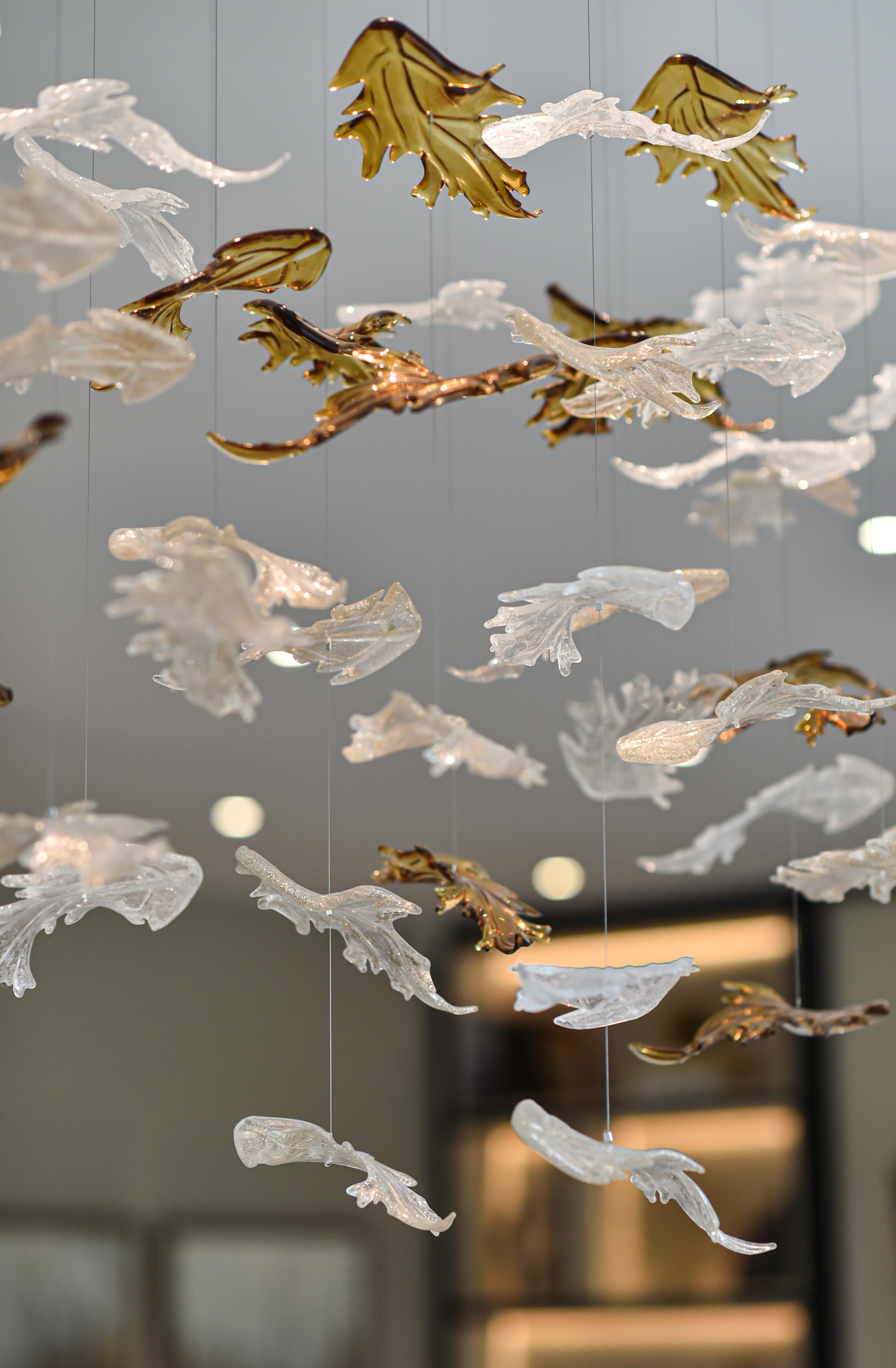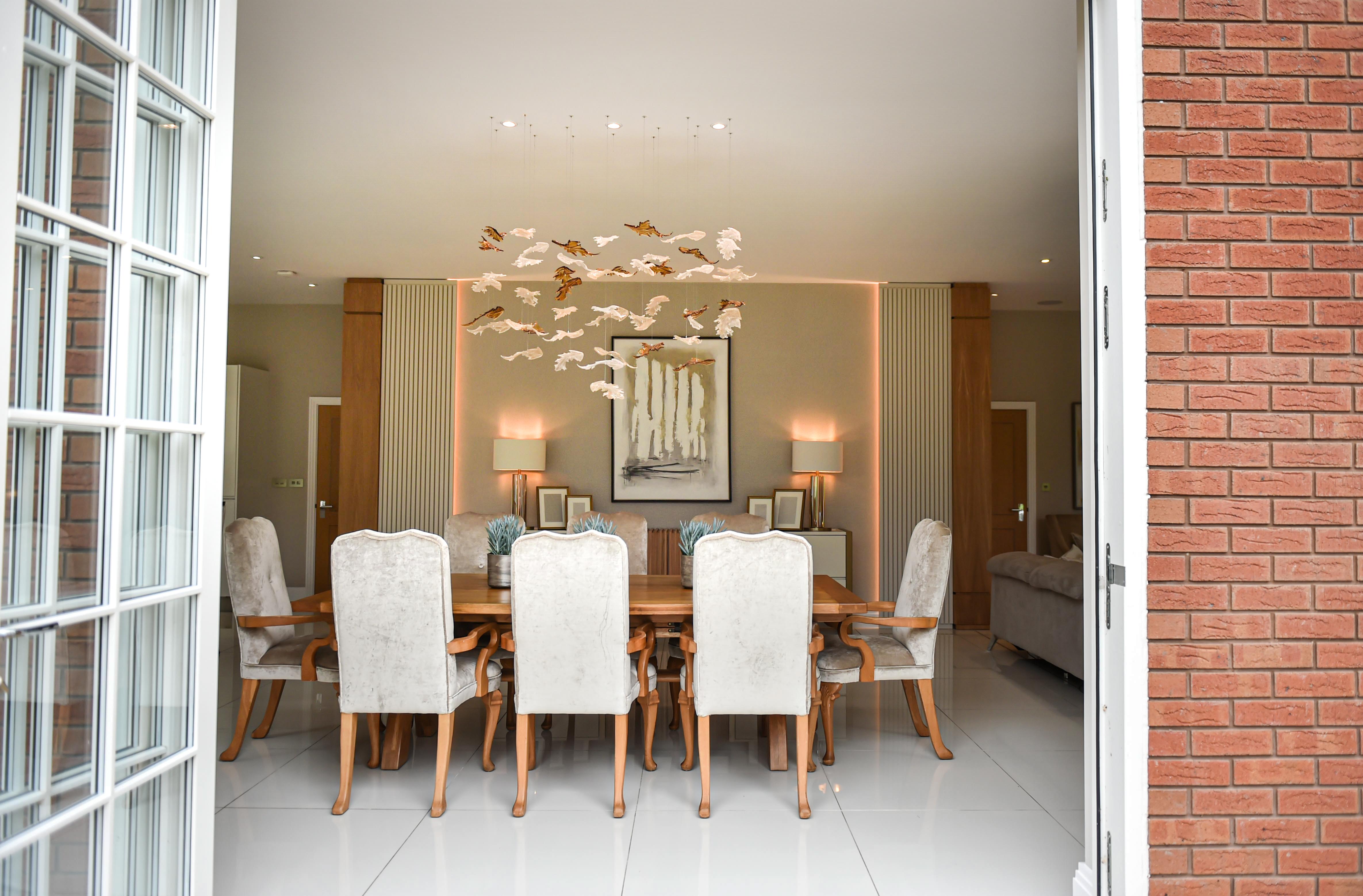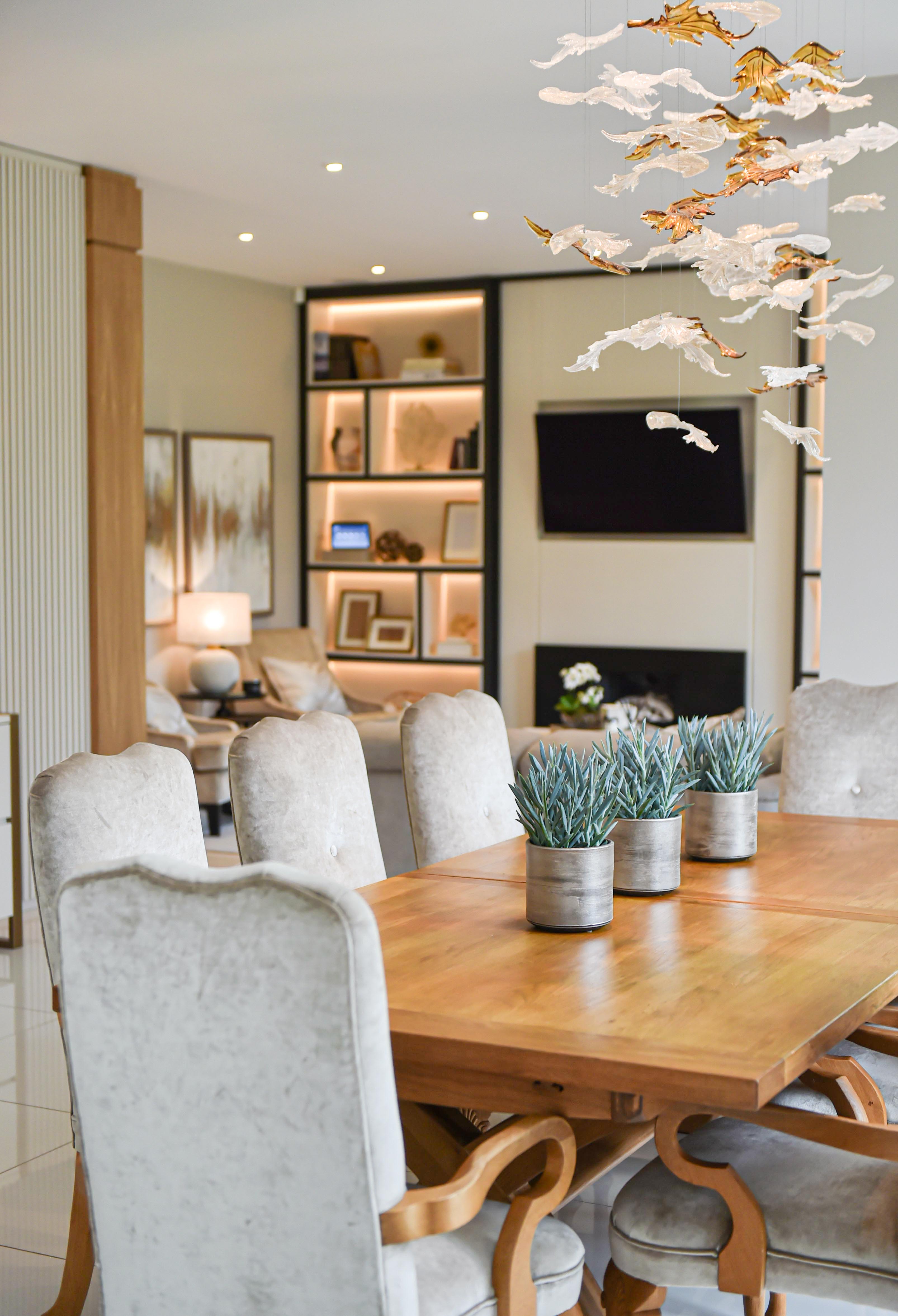 The dining area is crowned with a stunning chandelier featuring crystal leaves in three distinct tones, adding a touch of luxury and acting as a striking focal point over the dining space.