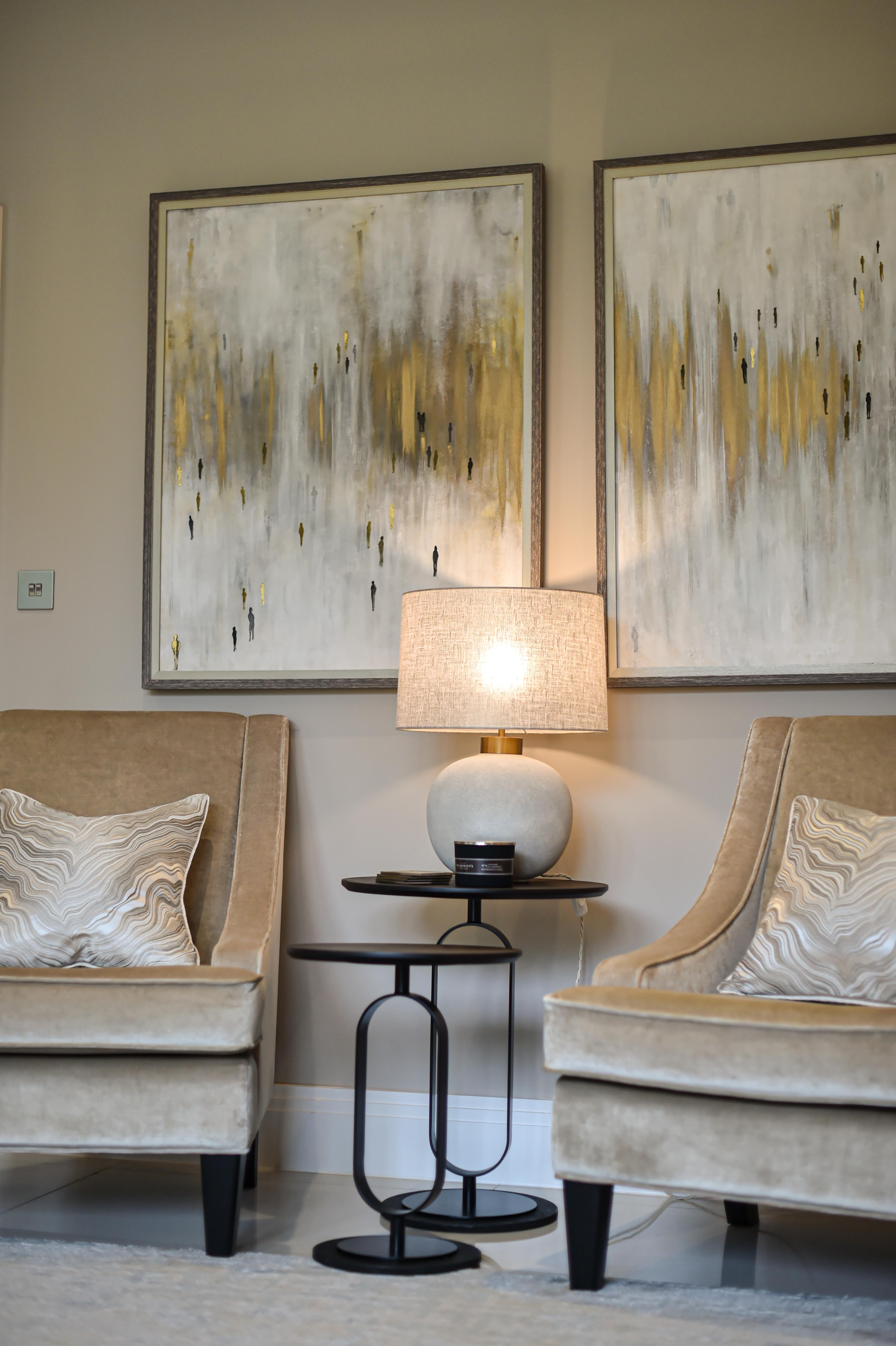 The fireplace was updated with a dark, modern frame, while indirect lighting highlights a feature wall adorned with elegant wallpaper. A bespoke TV unit adds visual intrigue, using contrasting black and cream tones for a layered, dynamic focal point.